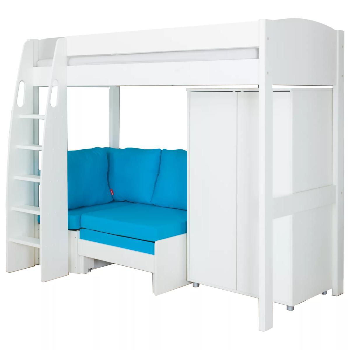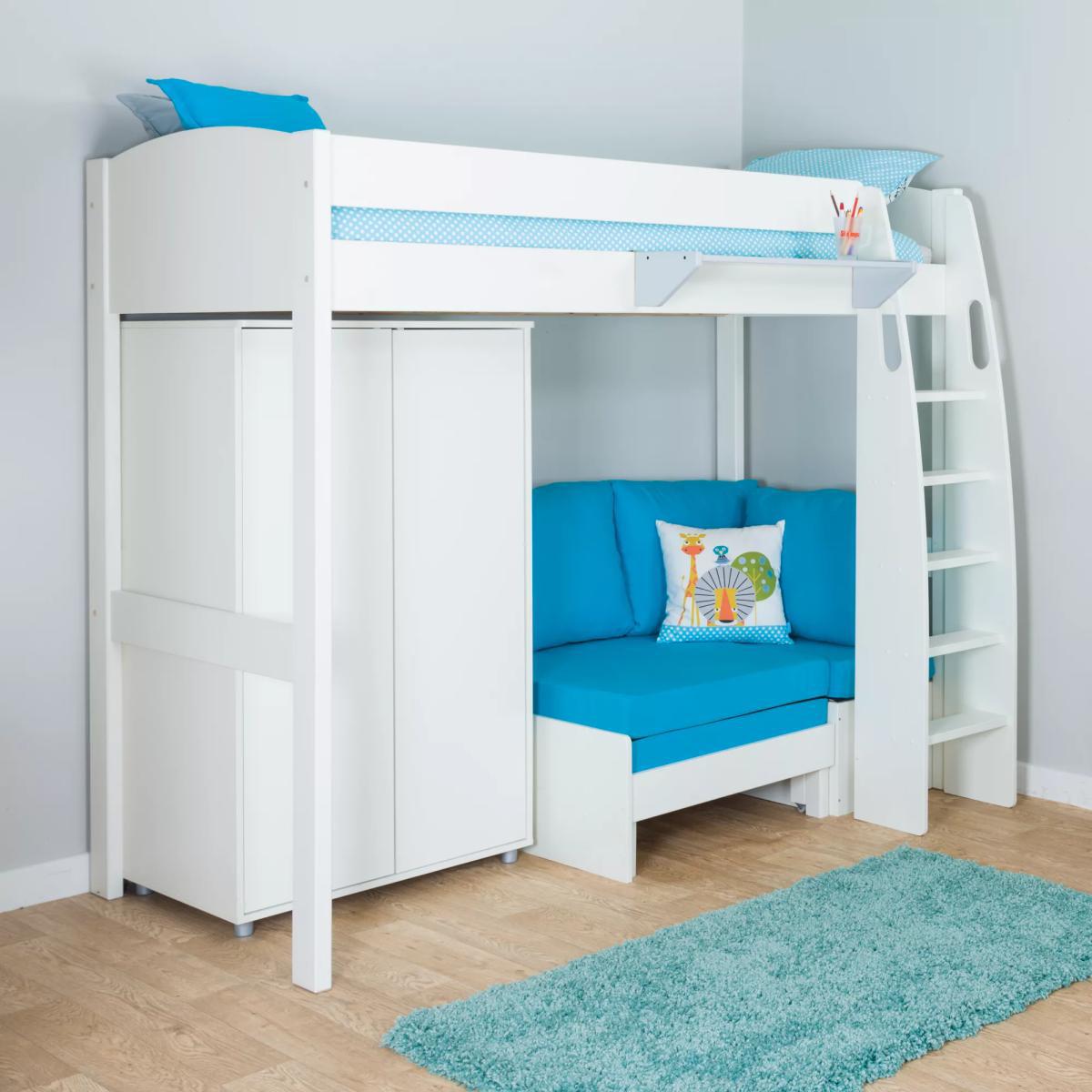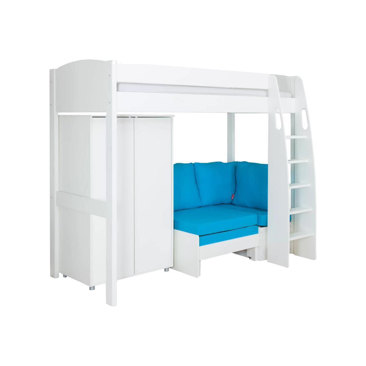 Designed to combine convenient storage and lounge spaces, this safe and sturdy bed from Stompa is a space-saving solution for their bedroom. Built to support a continental extra long single mattress (W90 x L200cm), it features solid wooden slats and an attractive rounded headboad that's available in a choice of white and grey colourways. The ladder has been ergonomically designed with comfortable treads so that your child can climb easily up and down, whilst cut-out grab handles on either side offer an extra, reassuring layer of safety. Featuring a freestanding double wardrobe that's placed next to a chair bed, they have a cosy seat during the day, where by night it can transform into a pull-out bed, ideal for when they have friends over to stay. The solid wood slat system allows for easy extension, and together with the hinged foam cushion seat, it enables a comfortable sleeping surface. Choose from grey or aqua cushions. Boasting a white laquered finish and feature design elements, this is a functional and versatile choice for their bedroom, and the continental single mattress is available to purchase separately. Stompa has been manufacturing safe furniture for active children for over half a century. Their furniture is functional and competitively priced aiming to fulfill all your child`s needs. Whether it`s a place to sleep, play, do homework or use their computer, Stompa provide storage and seating solutions that easily convert to an extra bed for sleepovers as well as a range of coordinating accessories. Our children's furniture ranges pass all British Standards safety and quality. We go beyond the legal requirements when we design our furniture, so that you and your child can both sleep soundly. Please note: not all our ranges are on display in our shops. 0% APR Representative: this product is eligible for Interest Free Credit, available when you spend £1000 or more on selected home products. Terms and conditions apply: find out more