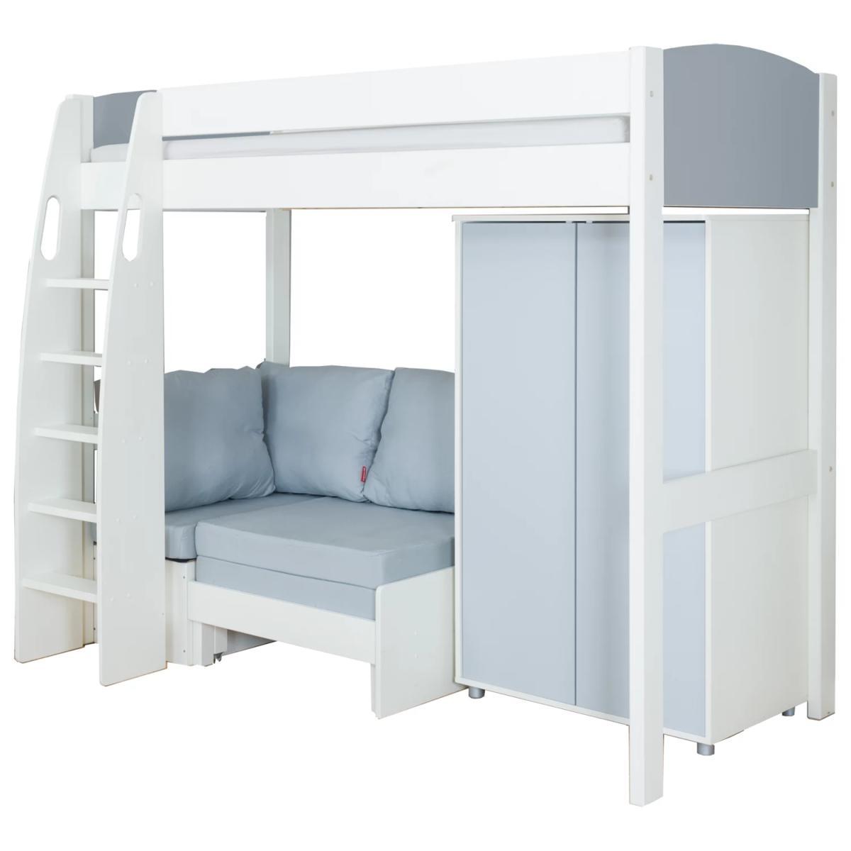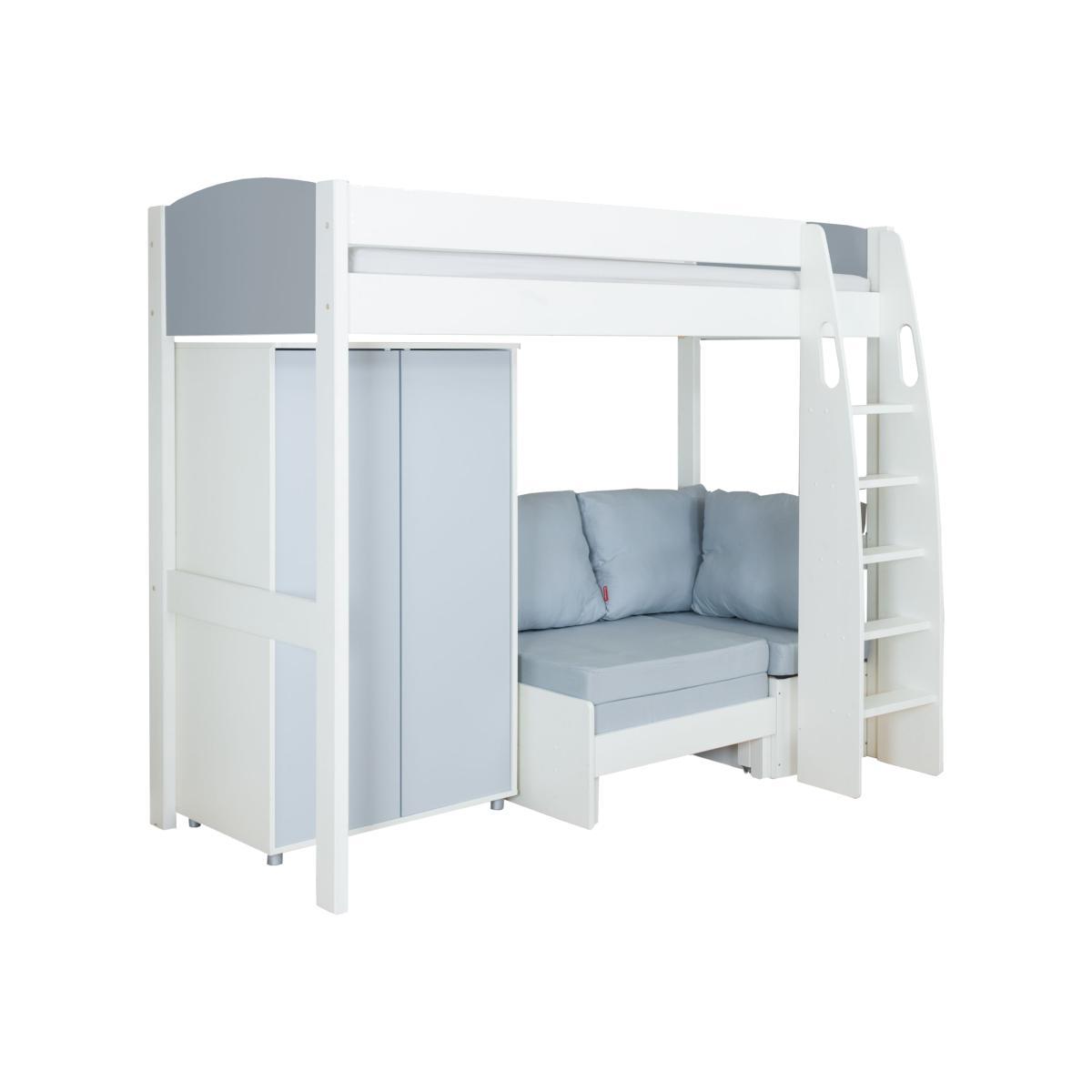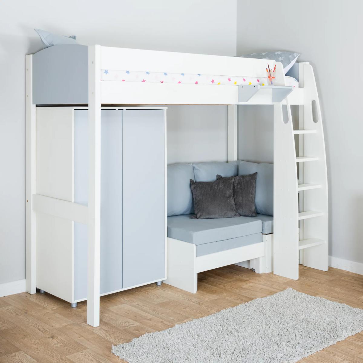 Designed to combine convenient storage and lounge spaces, this safe and sturdy bed from Stompa is a space-saving solution for their bedroom. Built to support a continental extra long single mattress (W90 x L200cm), it features solid wooden slats and an attractive rounded headboad that's available in a choice of white and grey colourways. The ladder has been ergonomically designed with comfortable treads so that your child can climb easily up and down, whilst cut-out grab handles on either side offer an extra, reassuring layer of safety. Featuring a freestanding double wardrobe that's placed next to a chair bed, they have a cosy seat during the day, where by night it can transform into a pull-out bed, ideal for when they have friends over to stay. The solid wood slat system allows for easy extension, and together with the hinged foam cushion seat, it enables a comfortable sleeping surface. Choose from grey or aqua cushions. Boasting a white laquered finish and feature design elements, this is a functional and versatile choice for their bedroom, and the continental single mattress is available to purchase separately. Stompa has been manufacturing safe furniture for active children for over half a century. Their furniture is functional and competitively priced aiming to fulfill all your child`s needs. Whether it`s a place to sleep, play, do homework or use their computer, Stompa provide storage and seating solutions that easily convert to an extra bed for sleepovers as well as a range of coordinating accessories. Our children's furniture ranges pass all British Standards safety and quality. We go beyond the legal requirements when we design our furniture, so that you and your child can both sleep soundly. Please note: not all our ranges are on display in our shops. 0% APR Representative: this product is eligible for Interest Free Credit, available when you spend £1000 or more on selected home products. Terms and conditions apply: find out more