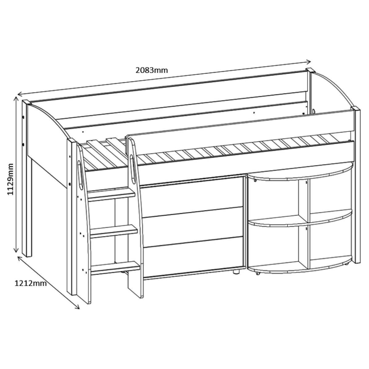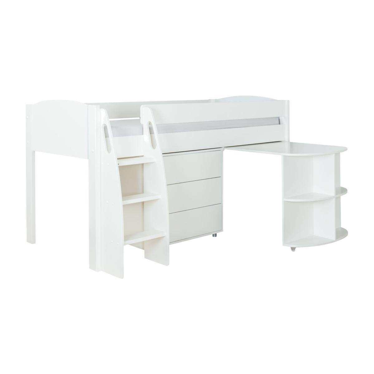 Made from pine and MDF, this safe and sturdy bed features solid wooden slats and attractive rounded head and foot boards in a choice of versatile colourways. The ladder has been ergonomically designed with comfortable treads, so that your child can climb easily up and down, whilst cut-out grab handles help to ensure their safety. The rounded pull-out desk has been designed with castors for ease of use, and can easily be stashed beneath the bed. Use this along with the chest of drawers to store all their essentials, keeping everything close at hand for work, rest and play. The chest features sleek push-to-open drawers on metal runners, for smooth and discreet use. Itslacquered finish and feature design elements make this furniture set the perfect option for adding a touch of space-saving fun to their room. Dimensions: Size of bed with pull-out desk closed - H112.9 x W125.5 x L208.3cm Size of bed with pull-out desk fully open - H112.9 x W175 x L208.3cm Size of chest - H72 x W80 x D39.9cm Ladder can be positioned either side of the bed. The chest of drawers can be positioned either beneath the end of the bed or next to the pull-out desk. Not recommended for children under the age of 6 years. This bed takes a continental single mattress (W90 x L200cm), available to purchase separately. Stompa has been manufacturing safe furniture for active children for over half a century. Their furniture is functional and competitively priced aiming to fulfill all your child`s needs. Whether it`s a place to sleep, play, do homework or use their computer, Stompa provide storage and seating solutions that easily convert to an extra bed for sleepovers as well as a range of coordinating accessories. Our children's furniture ranges pass all British Standards safety and quality. We go beyond the legal requirements when we design our furniture, so that you and your child can both sleep soundly. Please note: not all our ranges are on display in our shops.