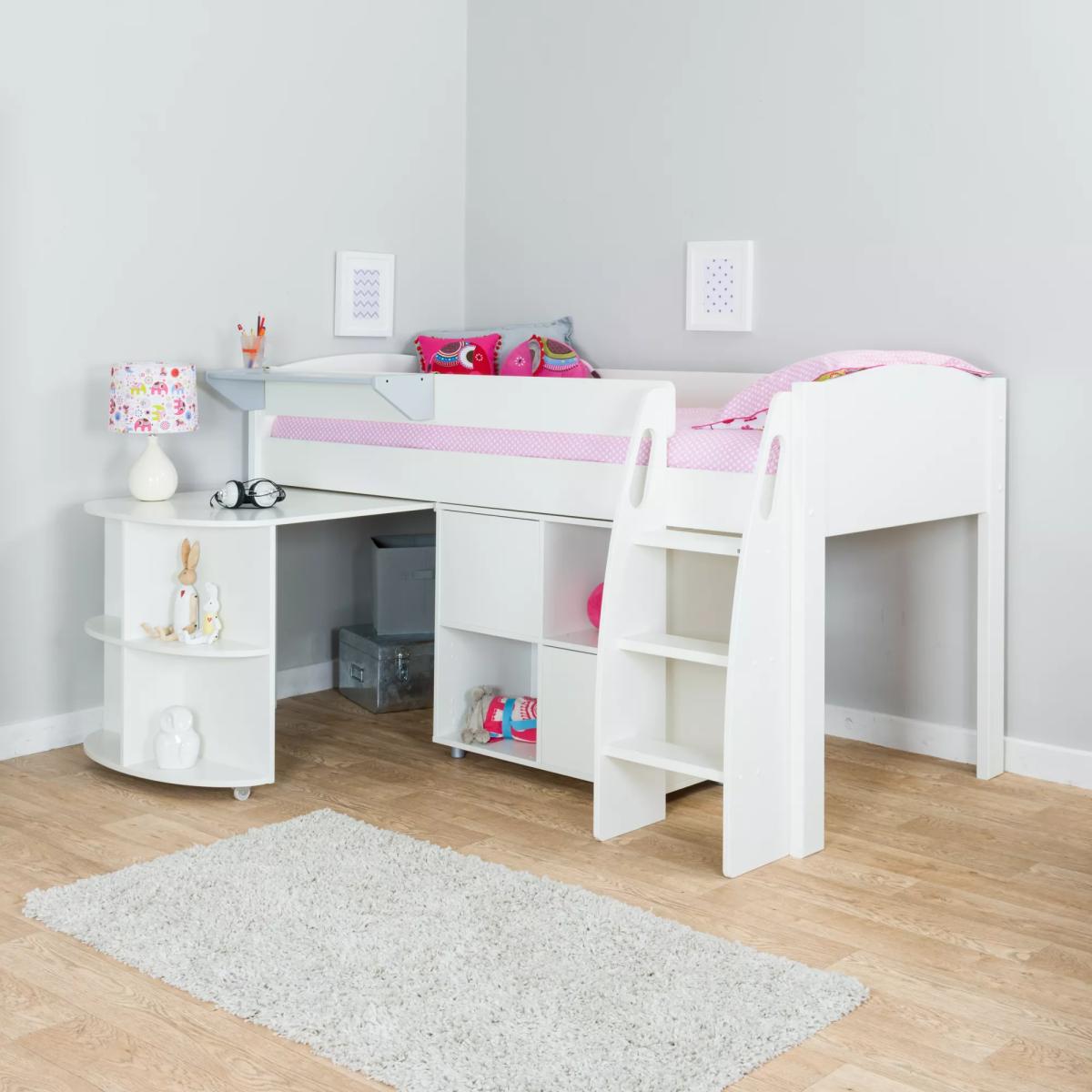 Made from pine and MDF, this Mid-Sleeper bed frame from Stompa lends unfaltering quality to practical appeal. Safe and sturdy, it's designed with solid wooden slats and an attractive rounded headboard, while the ladder has been ergonomically designed with comfortable treads, so you can rest assured that your child can climb easily up and down, with the added assistance of cut-out grab handles. The rounded pull-out desk has been designed with castors for ease of use, and can easily be stashed beneath the bed. Use this along with the cube unit to store books, games and craft materials, keeping everything close at hand for work and play. The unit features two push-to-open doors in a choice of popular colourways, helping you to keep clutter out of sight, and allowing you to truly tailor their space. Its neat lacquered finish and feature design elements make this furniture set the perfect option for adding a touch of space-saving fun to their room. Dimensions: Size of bed with pull-out desk closed - H112.9 x W125.5 x L208.3cm Size of bed with pull-out desk fully open - H112.9 x W175 x L208.3cm Size of cube unit - H72 x W80 x D39.9cm Please note: The ladder can be positioned on either side of the bed, while the cube unit can be positioned either beneath the bed or next to the pull-out desk. This bed requires a continental single mattress (W90 x L200cm), available to purchase separately. Not recommended for children under the age of 6 years. Stompa has been manufacturing safe furniture for active children for over half a century. Their furniture is functional and competitively priced aiming to fulfill all your child`s needs. Whether it`s a place to sleep, play, do homework or use their computer, Stompa provide storage and seating solutions that easily convert to an extra bed for sleepovers as well as a range of coordinating accessories. Our children's furniture ranges pass all British Standards safety and quality. We go beyond the legal requirements when we design our furniture, so that you and your child can both sleep soundly. Please note: not all our ranges are on display in our shops. 0% APR Representative: this product is eligible for Interest Free Credit, available when you spend £1000 or more on selected home products. Terms and conditions apply: find out more