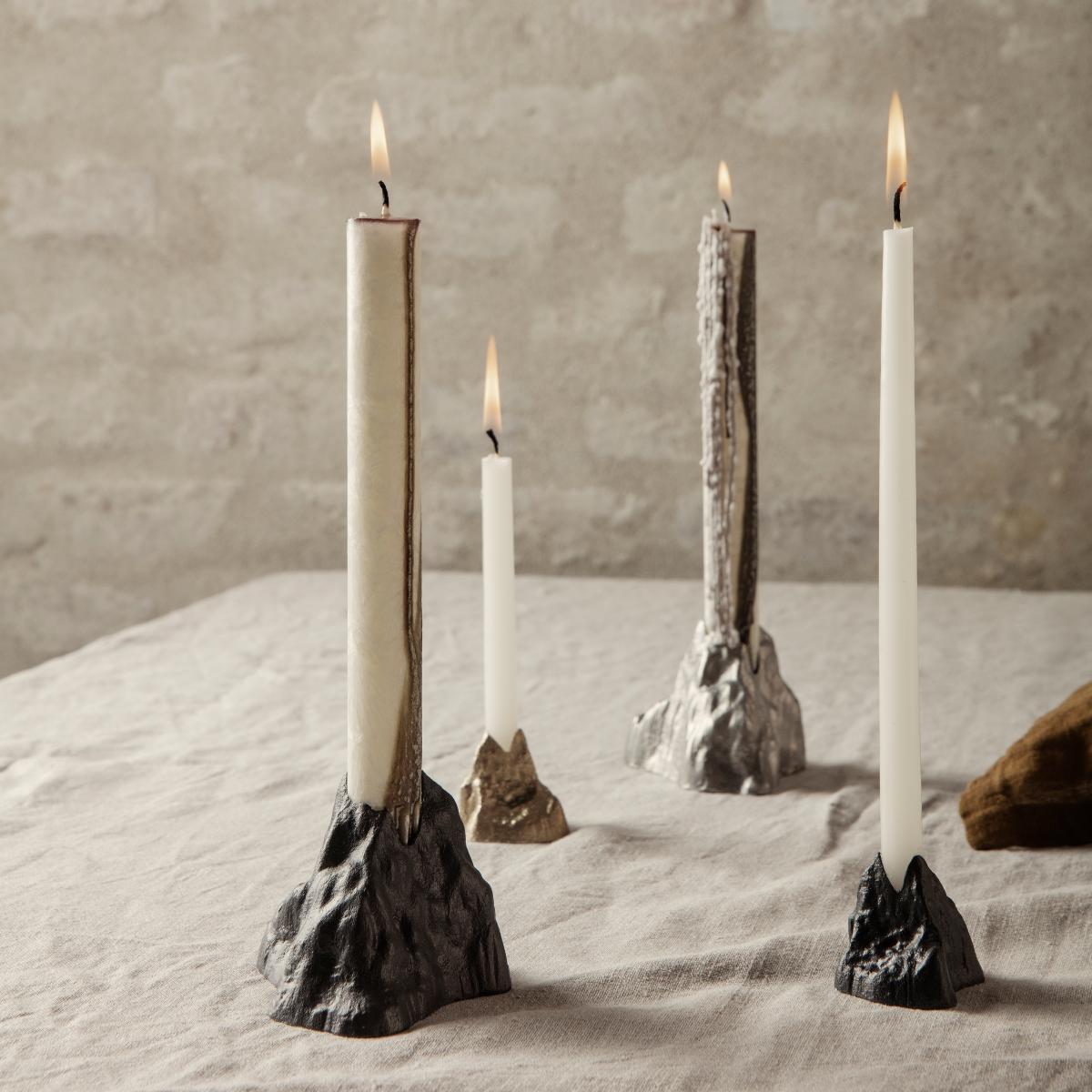 The Stone candlestick from Ferm Living is a stable candlestick made from solid aluminium or brass depending on the variant of your choice. The candle holder is designed for smaller candles with a diameter of 1. 2 cm: it can also be used to hold incense and fragrance sticks. True to its name, the candlestick takes the form of a solid stone or a majestic miniature mountain. Combine with the larger candlestick in the same collection to create a stylish interior display.