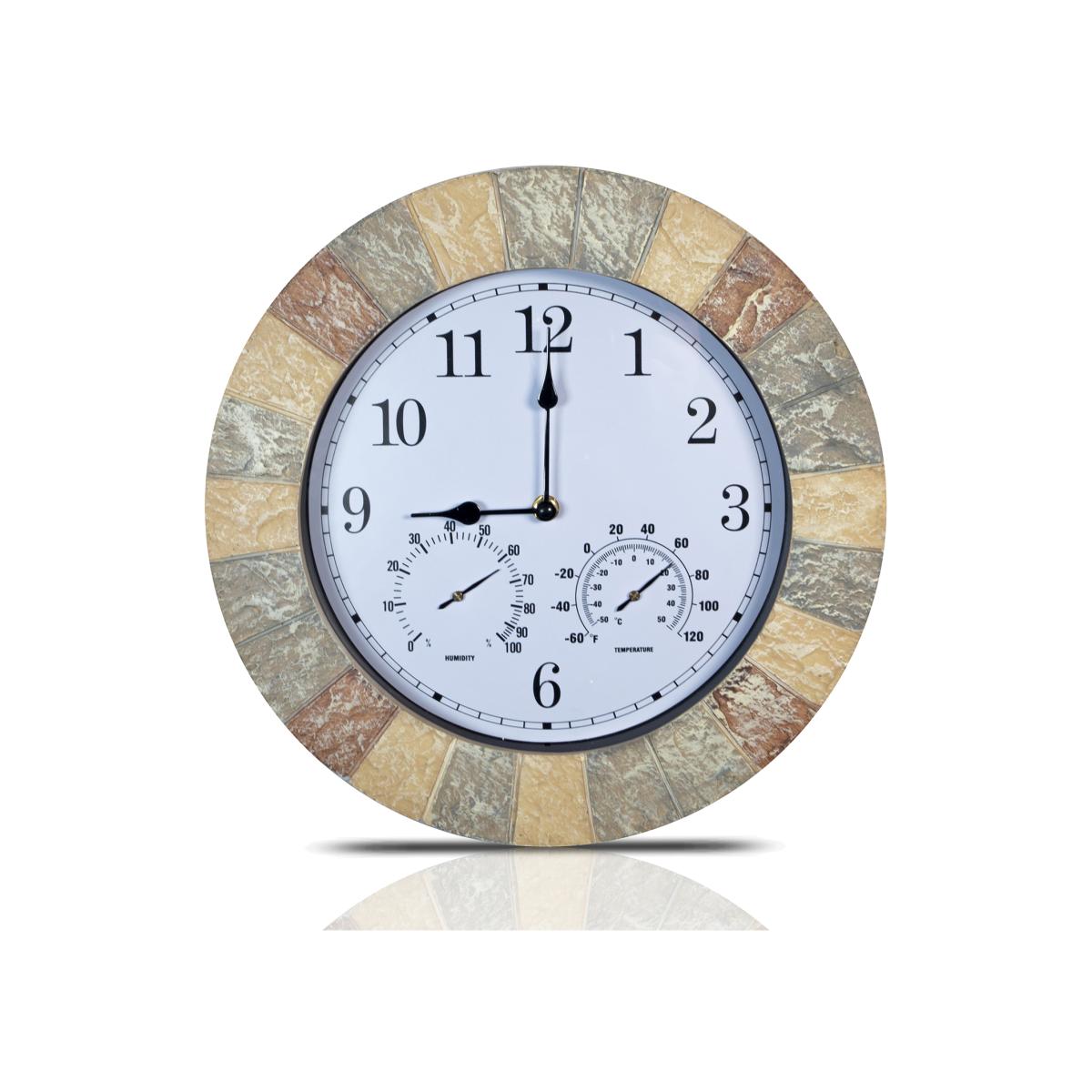This fabulous decorative outdoor wall clock with thermometer and hygrometer from St Helens & Home Garden would make a welcome addition to any garden thanks to its pleasing sandstone effect design. The clock is hand-painted and made from polyresin making it long-lasting and suitable for the rigours of outdoor use. Supplied with a key slot making it extremely quick and easy to mount on outdoor walls, fences, summer houses, conservatories and sheds. The clock also features a handy thermometer which displays the temperature in degrees Fahrenheit from -60 degrees F to 100 degrees F and a hygrometer which measures the percentage humidity of the air.