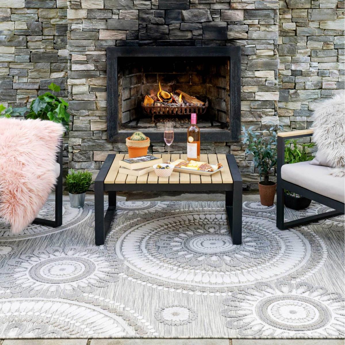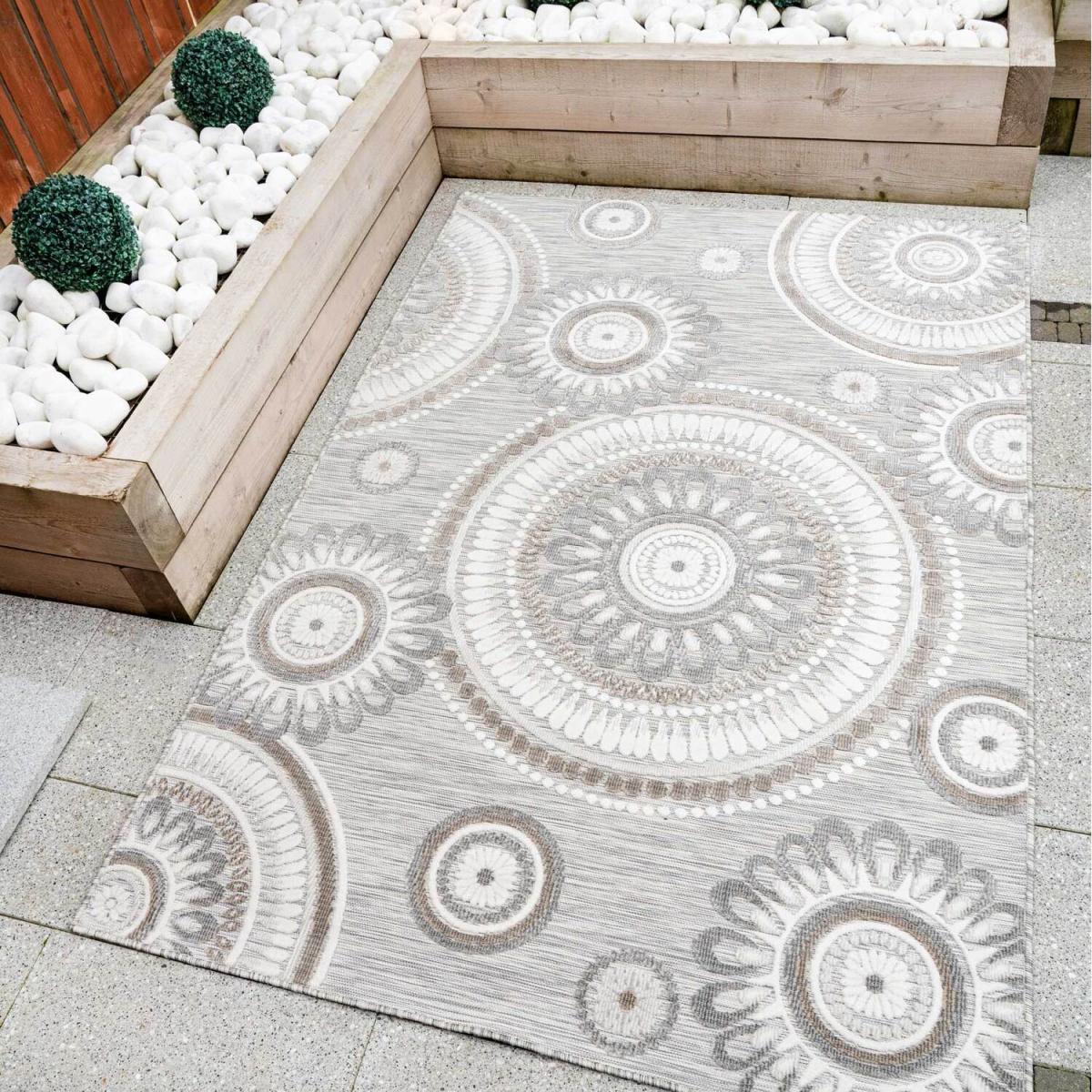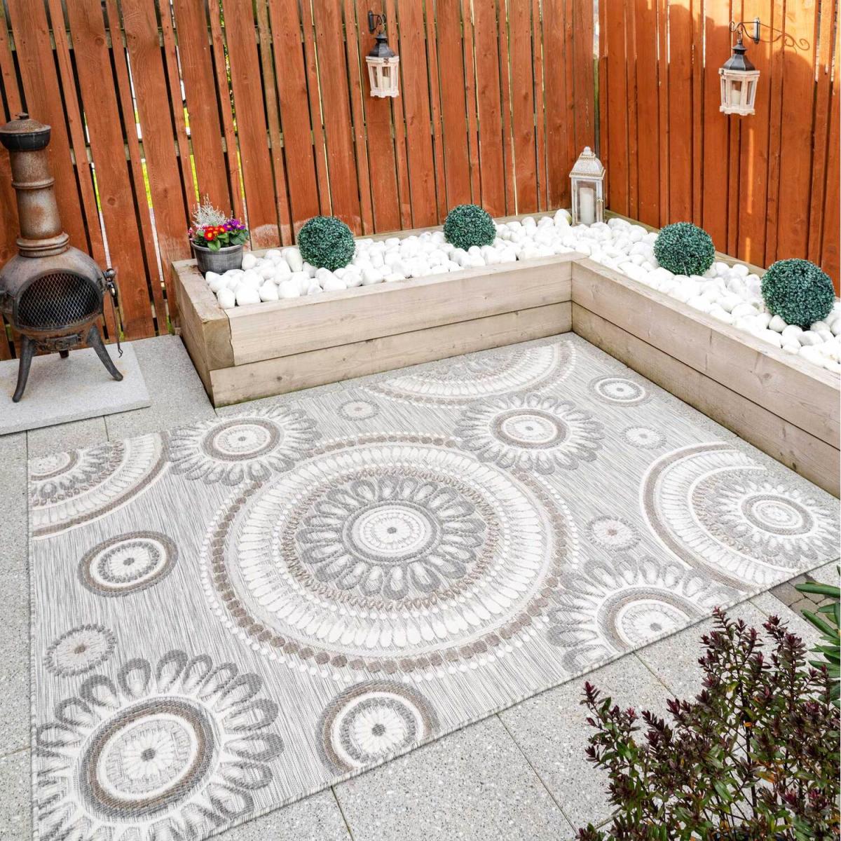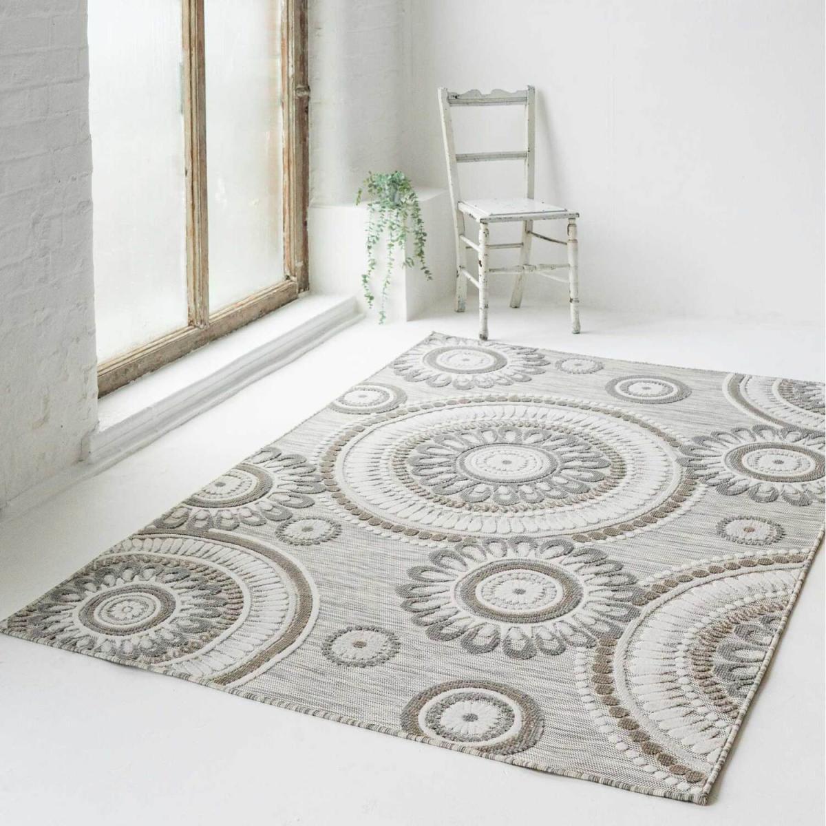 Introducing our flatweave Indoor Outdoor range of rugs. Made from polypropylene these rugs are easy care, hardwearing and can be wiped clean, perfect for placing under a dining table or in high traffic areas such as entrance halls and bedrooms. Featuring a tufted textured pile these really show off the beautiful floral and geometric designs. They are also weatherproof and stain resistant making them perfect for use in your garden and patio areas. Perfect for garden patios, entertaining guests in your outdoor space, and all manner of fun in the sun! We do recommend taking the rug inside during the winter months or storm weather to preserve the colour and keep your rug in perfect condition for longer.