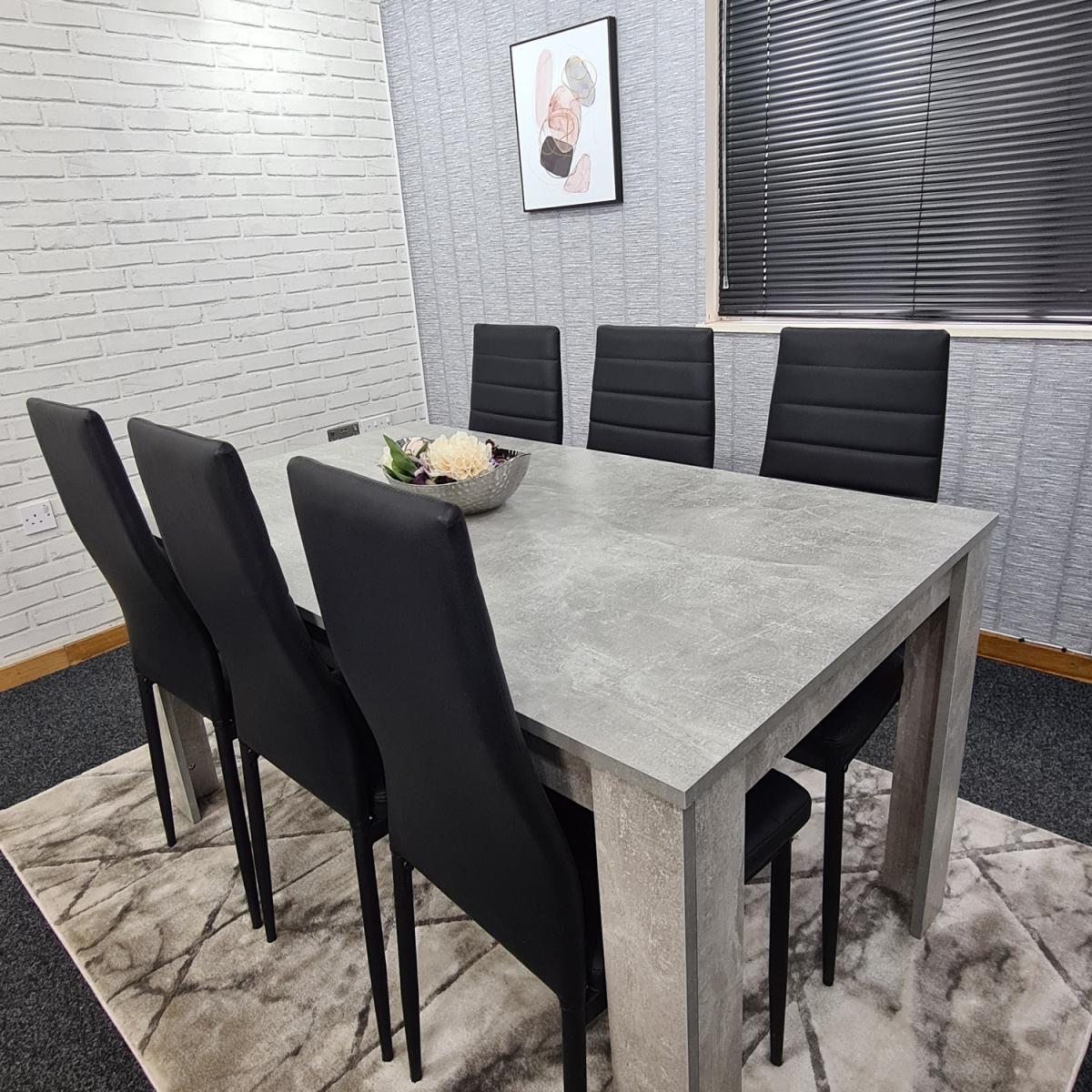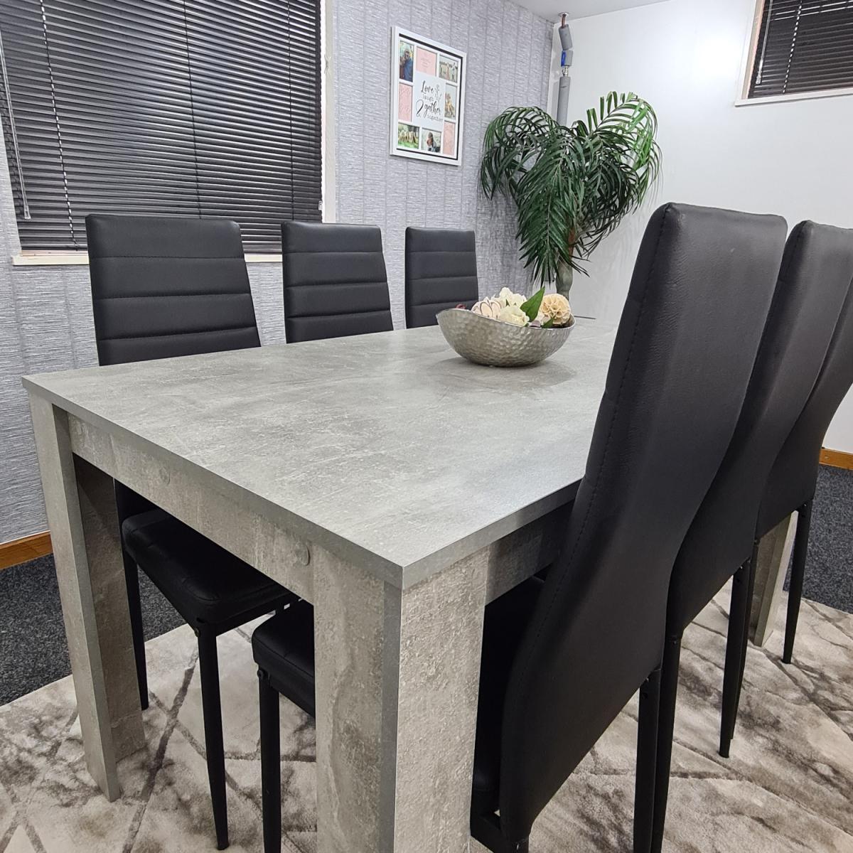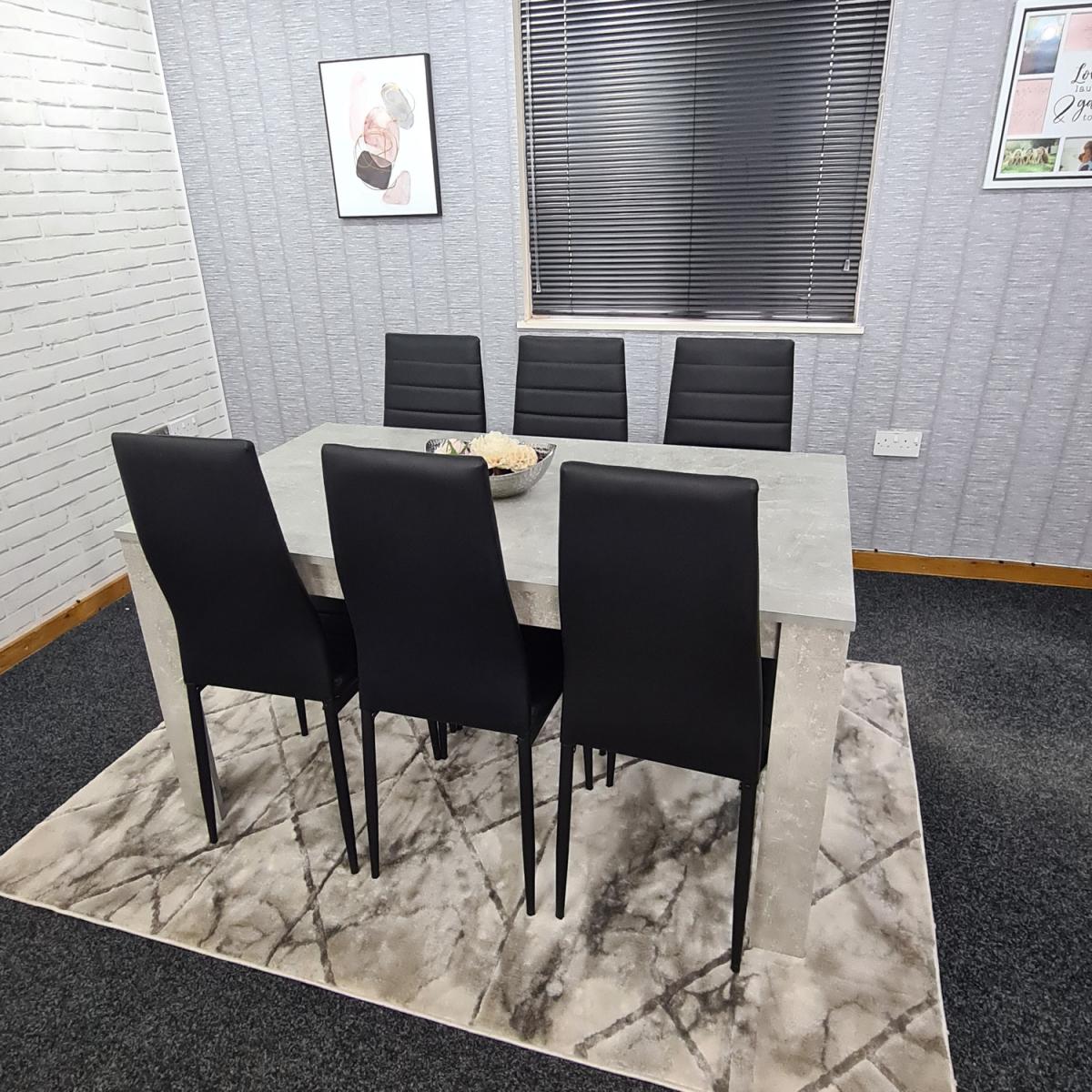 A Stunning Wooden Dining Table set comes with 6 gorgeous black metal chairs. The table is made from MDF wood and has a melamine laminated light stone grey effect. Transforming your dining room and looks so spectacular and unique. Simply wipe with a damp cloth and dry. The item comes flat packed and requires some home assembly.