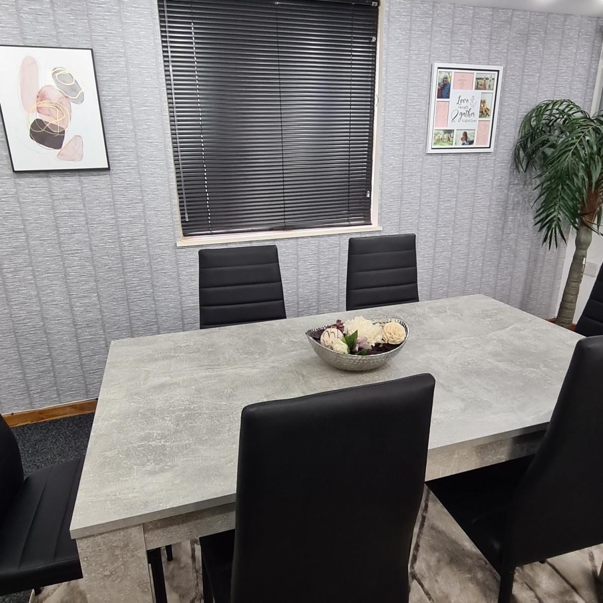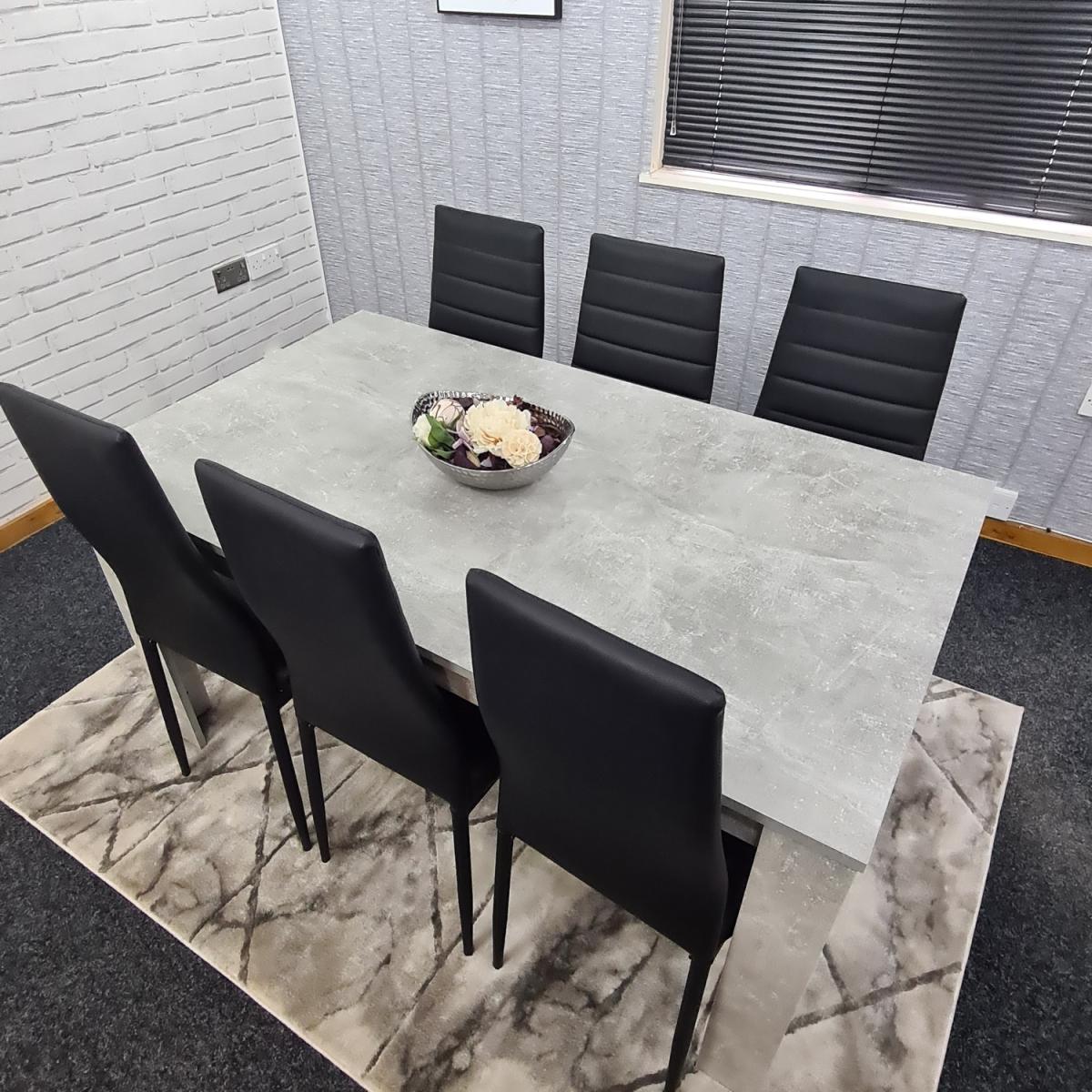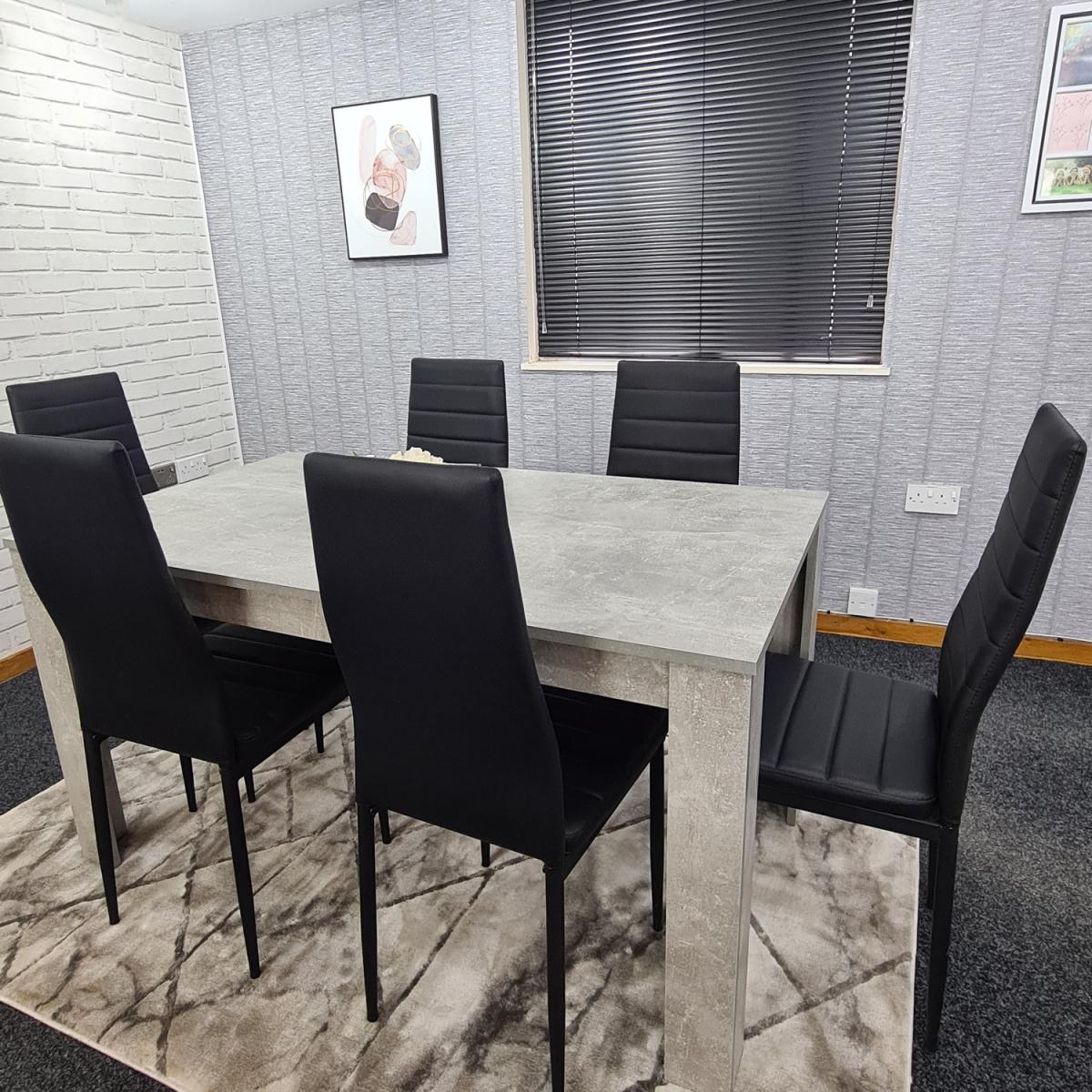 A Stunning Wooden Dining Table set comes with 6 gorgeous black metal chairs. The table is made from MDF wood and has a melamine laminated light stone grey effect. Transforming your dining room and looks so spectacular and unique. Simply wipe with a damp cloth and dry. The item comes flat packed and requires some home assembly.