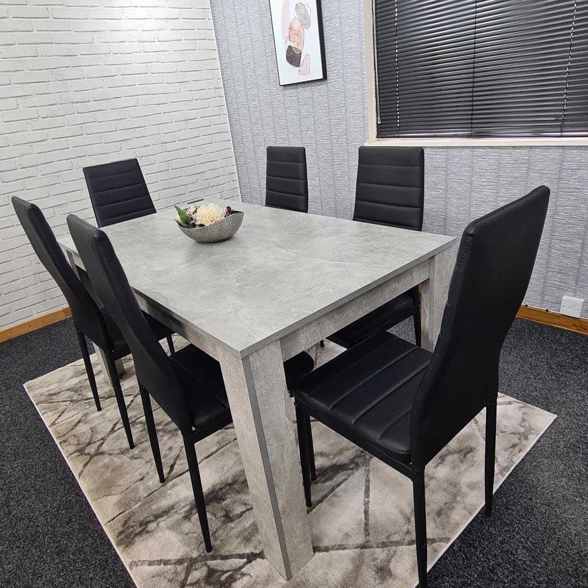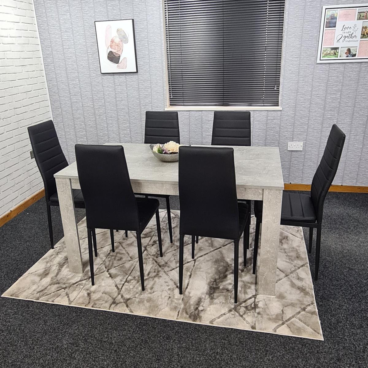 Stone Grey Table with 6 Black Metal Chairs Dining Set - Stone Grey Effect