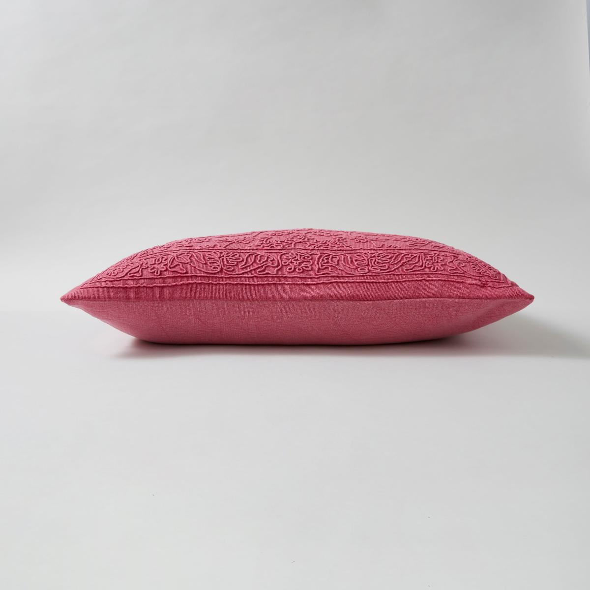 I love how this cushion adds a bold pop of colour and texture to various interiors. The stone-washed finish lends a relaxed, slightly boho feel that works beautifully in both contemporary and eclectic spaces. It pairs well with neutral tones for a striking contrast, or can complement other rich, jewel-like colours for a more layered look. Practical styling tips include mixing it with other patterned cushions to create visual interest or using it on a plain sofa or bed to make the pink stand out. Its size and tactile surface also make it a versatile choice for creating cosy corners or accenting larger sofas and beds.