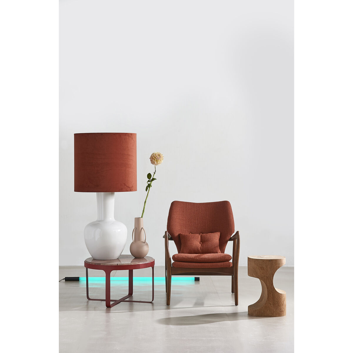 This coffee table is a clever mix of natural and industrial materials, making it a versatile piece for both modern and eclectic interiors. The travertine top adds texture and a touch of luxury, while the red metal frame injects colour and durability. It's perfect for adding visual interest to a neutral lounge or bringing warmth to otherwise minimalist spaces. Practical styling tips include layering with a few curated accessories-think a tray with candles or a small sculpture-to keep the surface functional without clutter. It works well styled with plush textured rugs and soft lighting for a welcoming yet contemporary vibe. This table is great for those looking to make a statement while maintaining practicality.