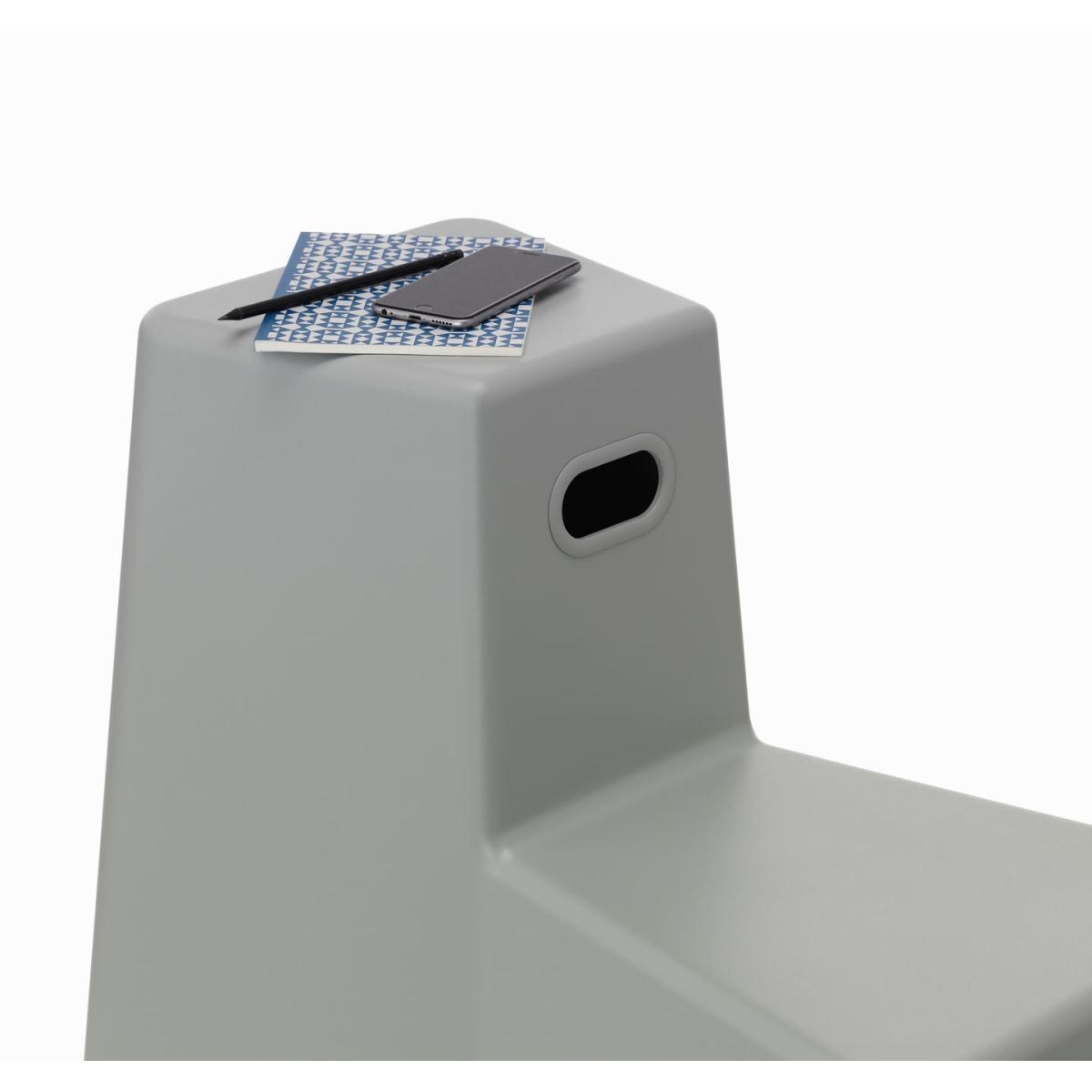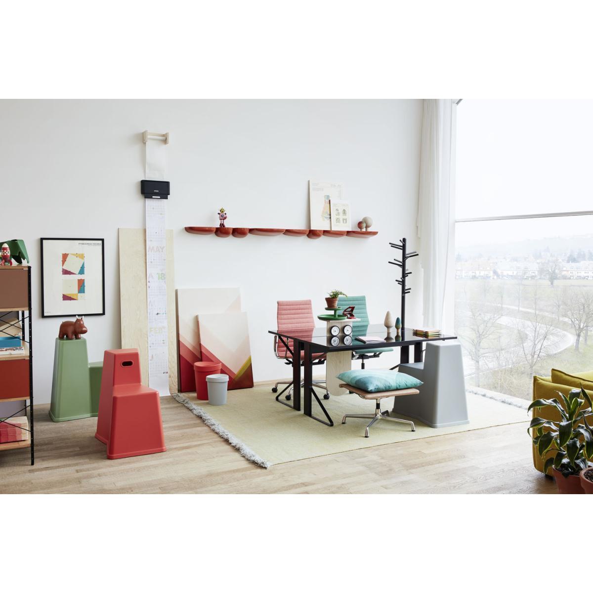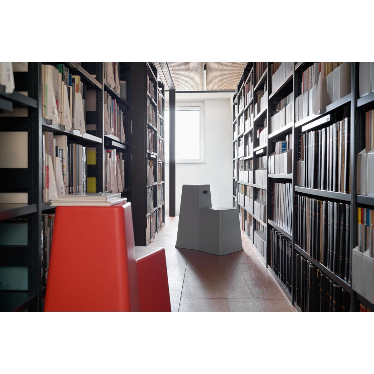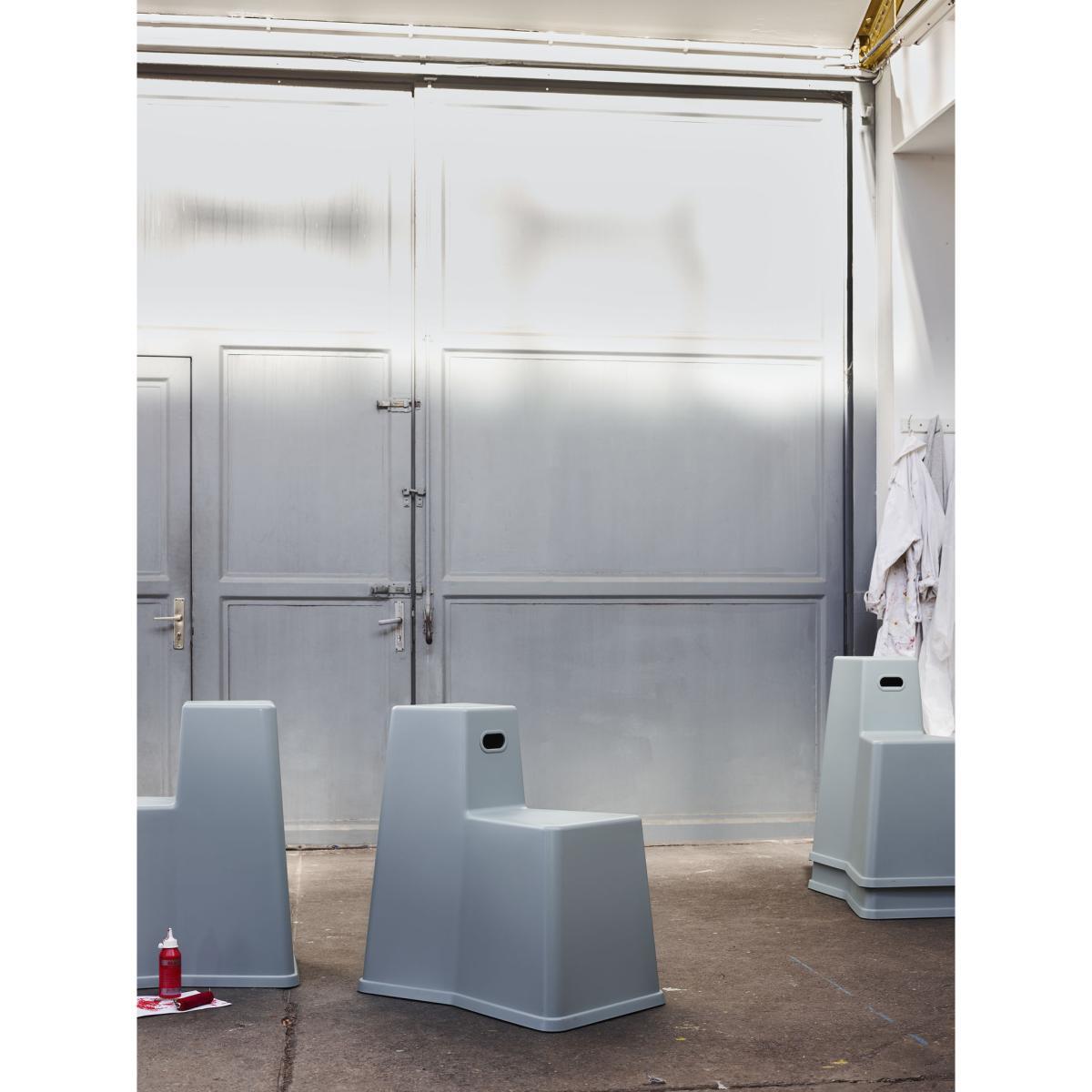 Many of German designer Konstantin Grcic's products have won international design awards and his work is part of the permanent collections of the most important design museums (such as MoMA in New York and the Centre Georges Pompidou in Paris). Created in 2016, the Stool-Tool looks like a monolithic sculpture and invites users to spontaneously try out its many options. With its step-shaped platforms, Stool-Tool unites chair and side table in a single object. Its use intuitively reveals lots of possible seating positions and functions: stool, step, side table. The backrest platform can be used as a small work or storage surface. Lightweight and stackable, the Stool-Tool can be easily transported thanks to a cut-out handle. It can be used indoors and out. A versatile work tool, Stool-Tool is a multifunctional piece of office furniture that brings added value to any workspace. Stool-Tool is suitable for the most varied fields of use: office as well as living room, library, children's room, including areas used as workshops and for meetings.