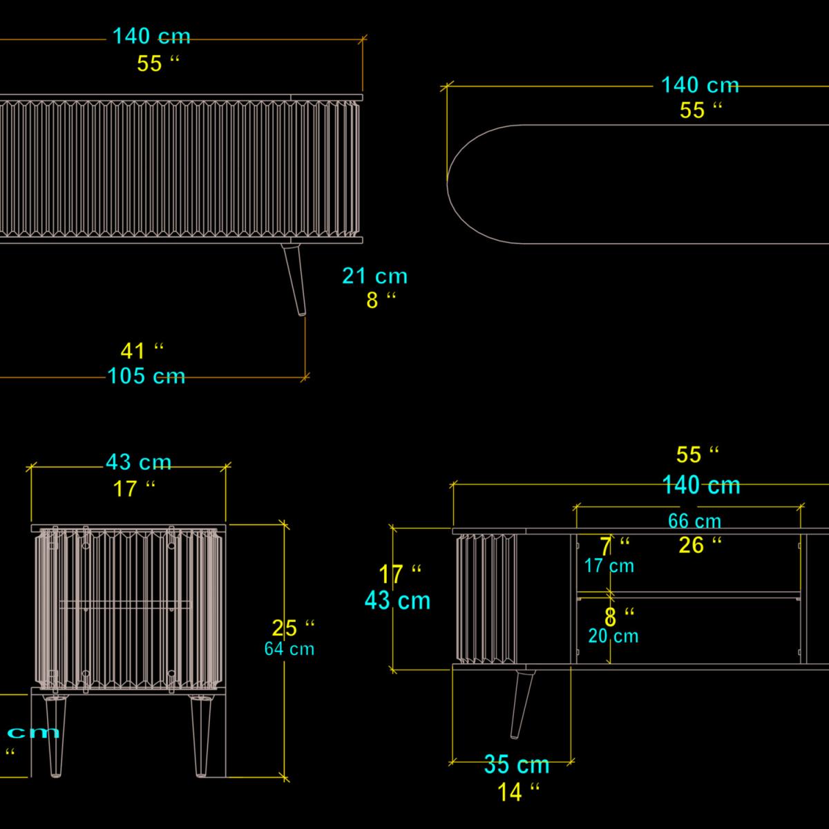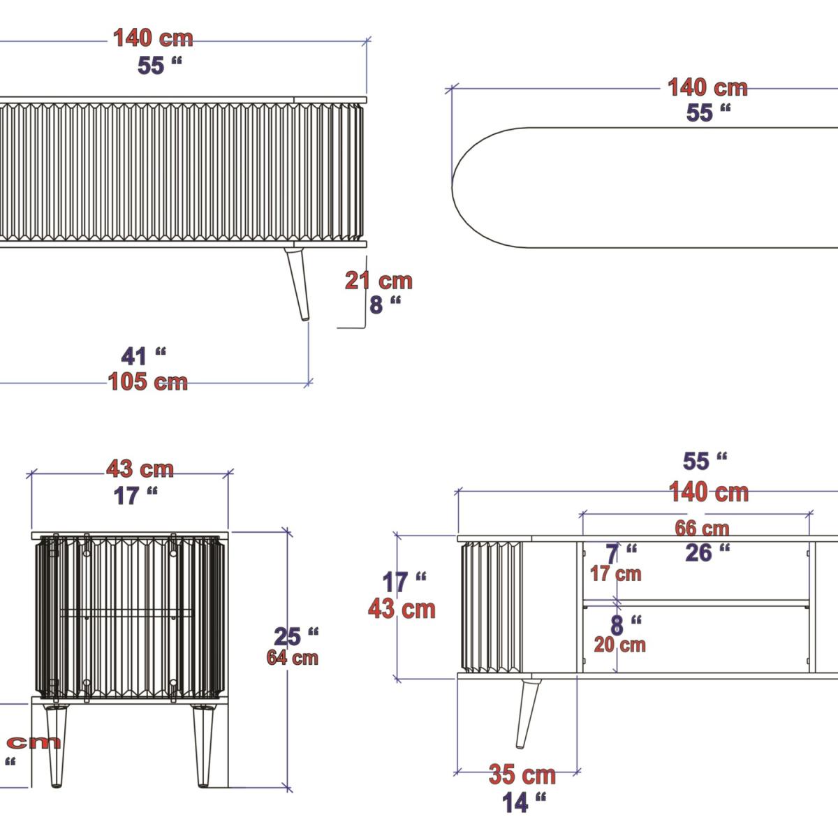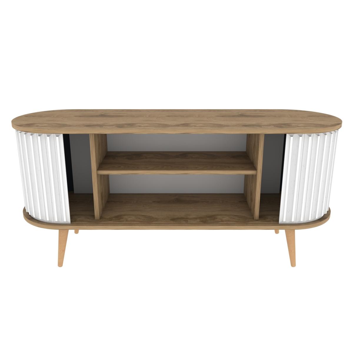Decorotika Store 140 cm wide TV stand with a unique and elegant oval design will become a new star in your house. It can accommodate up to 63" flat-screen TVs. Two flexible sliding decorative Tambour doors slide along the carved and curved track that continues around the oval board. The Tambour doors are made of thin slats of MDF and joined together with a flexible polyester canvas backing mechanism applying membrane vacuum press PVC foil 3D coatings. The stand offers 2 cubbies and 2 interior open shelves for storage.