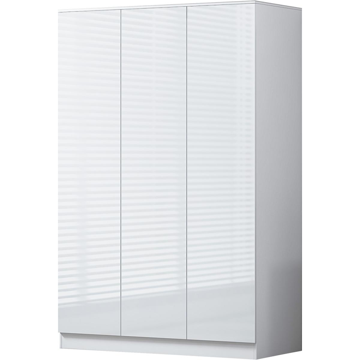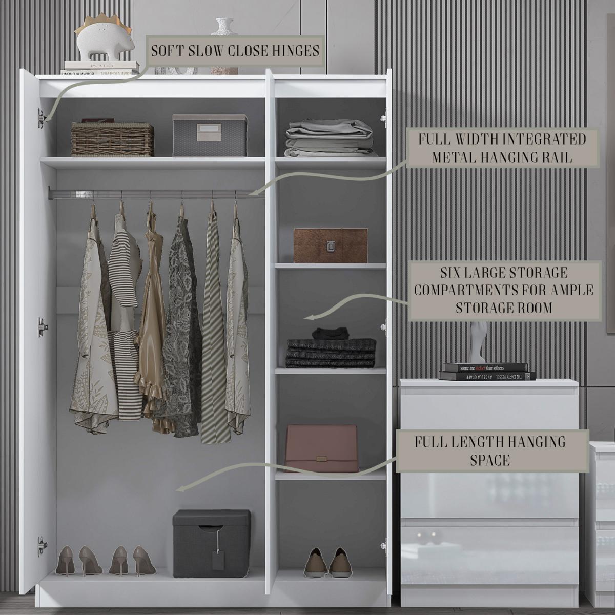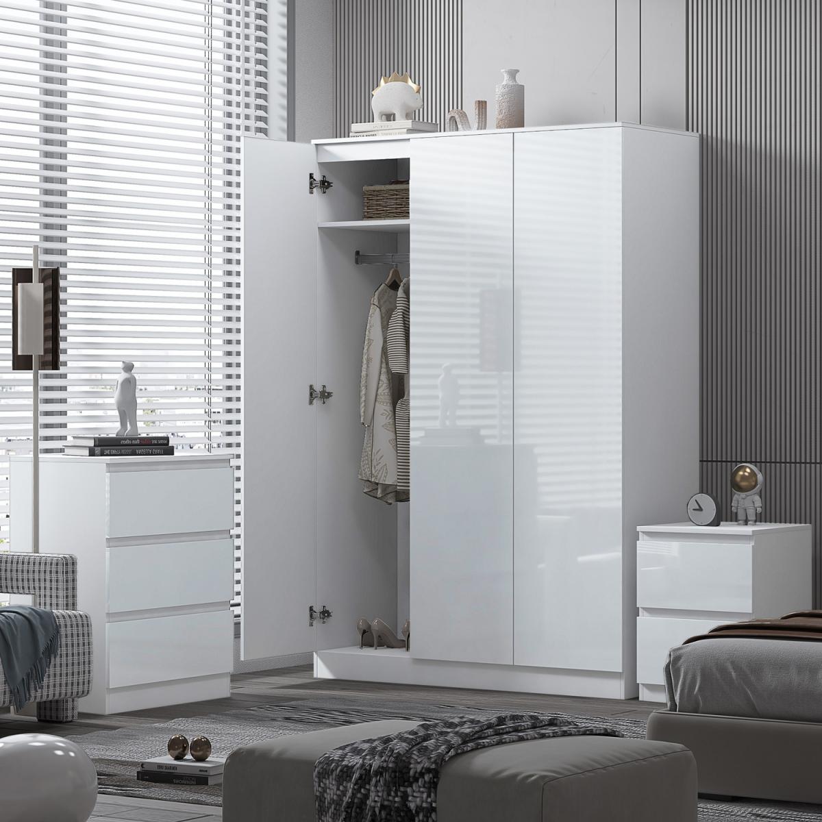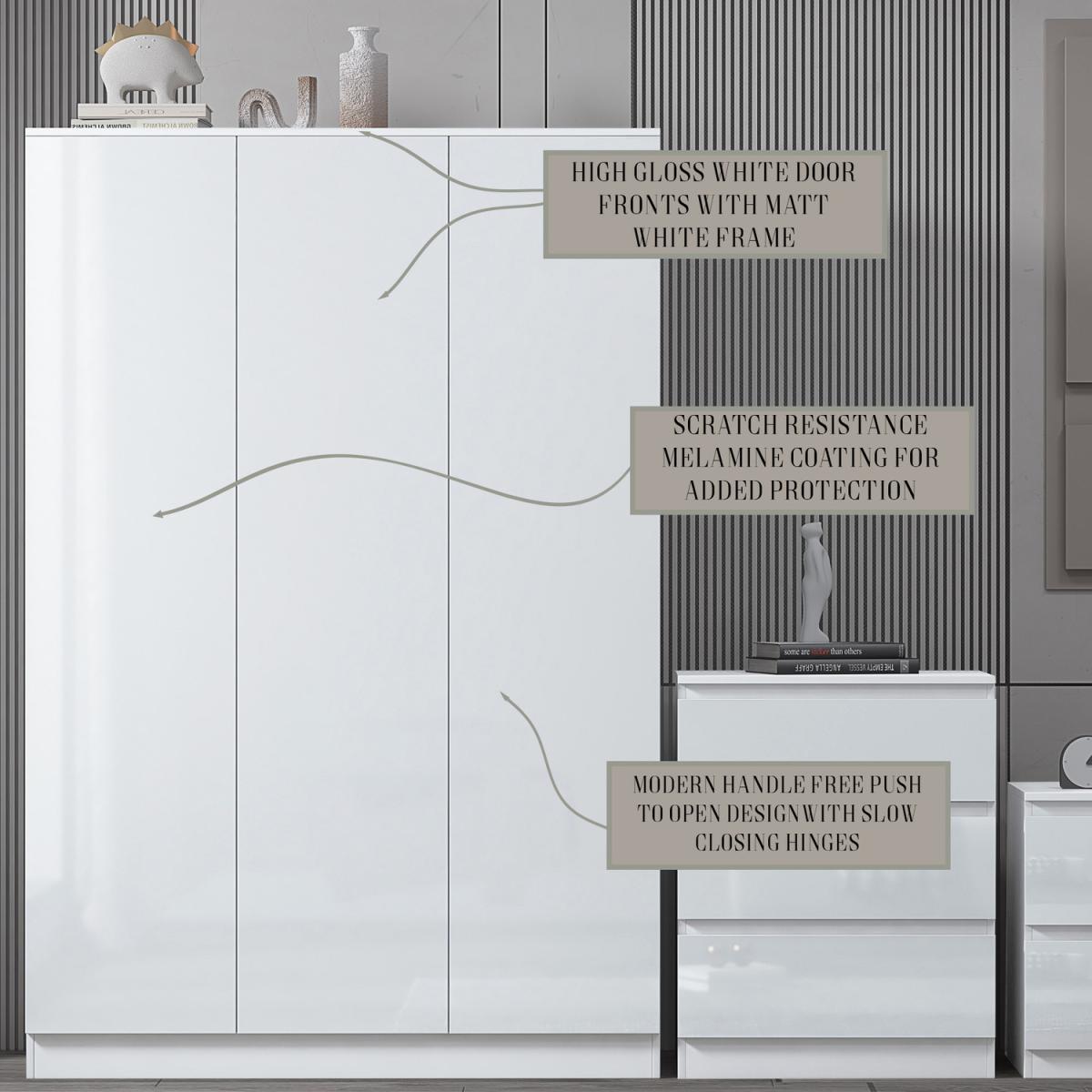 Introducing the Stora High Gloss White 3 Door Wardrobe, a stunning and luxurious storage solution designed to elevate the style of your bedroom. This wardrobe seamlessly blends modern aesthetics with functional features, offering you a sleek and practical addition to your living space. The wardrobe's high gloss white finish exudes elegance and sophistication, creating a focal point in any room. The scratch and UV resistant melamine coating ensure that your wardrobe maintains its pristine appearance for years to come, even in the face of daily wear and tear. Featuring three large high gloss white doors and a contrasting matt white frame, this wardrobe is a true statement piece. The glossy doors reflect light, creating a sense of spaciousness and adding a touch of glamour to your space. The matt white frame provides a sleek and contemporary backdrop, enhancing the overall visual appeal.