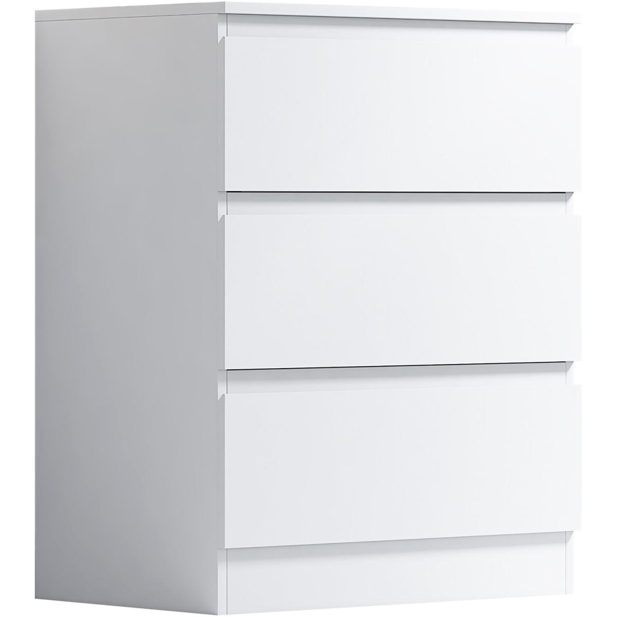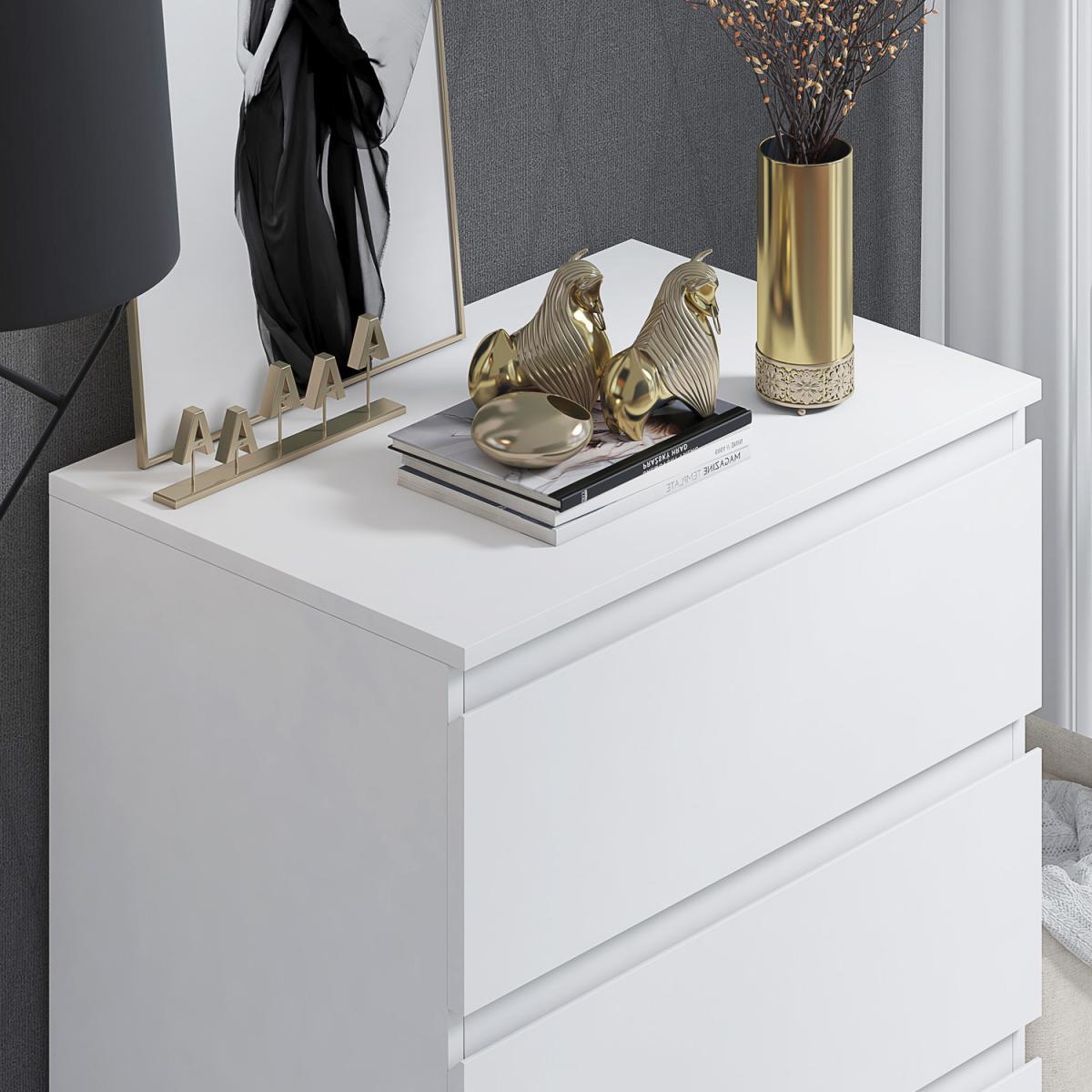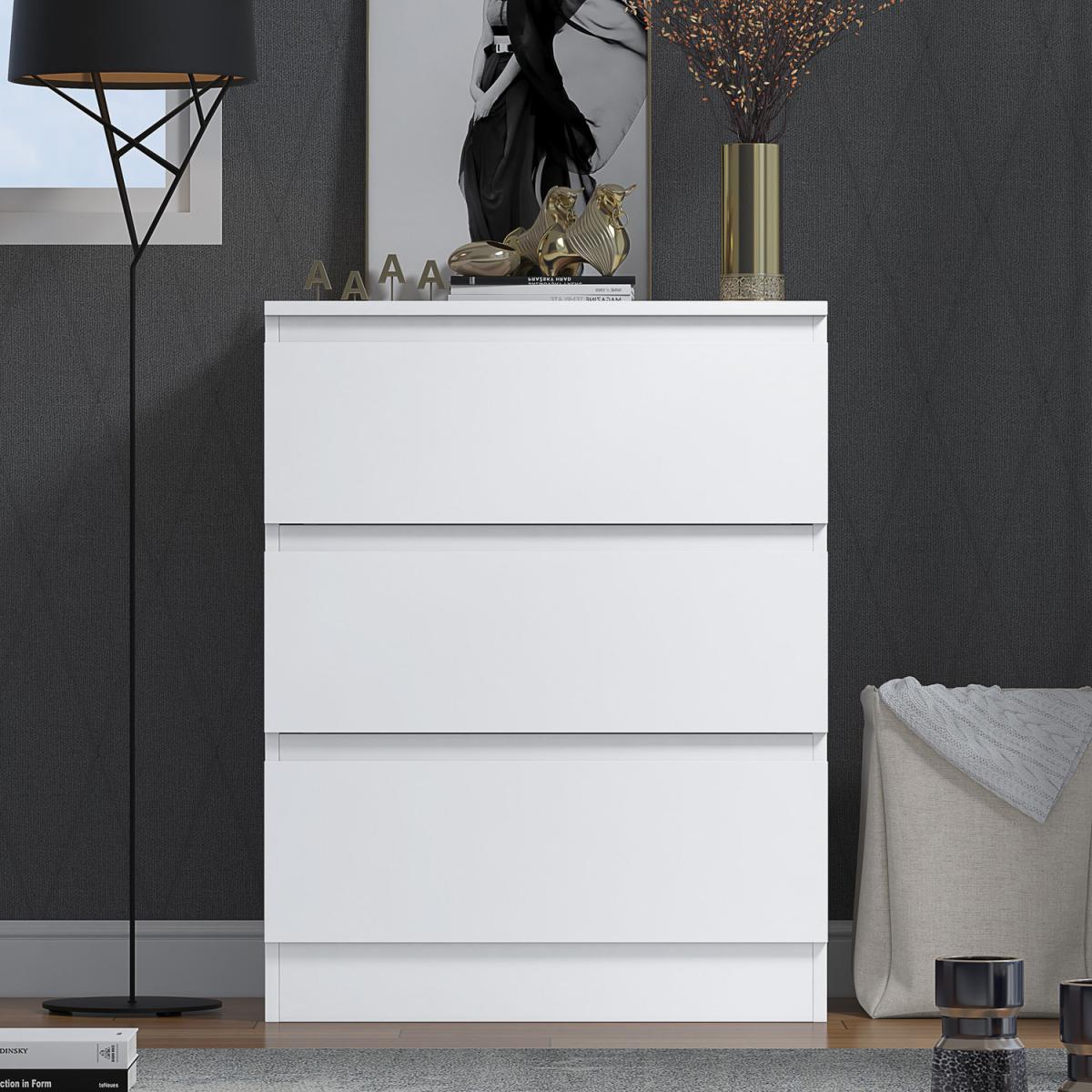 Introducing our 3 Drawer Matt White Bedside Chest with Chamfered Drawer Fronts - the perfect addition to any bedroom, living room, or hallway. This beautifully designed piece of furniture features centralised metal drawer runners that ensure smooth and effortless operation of each drawer. The chest is crafted from high quality materials and finished with a scratch and UV-resistant melamine coating, ensuring that it will withstand the test of time and remain as beautiful as the day you bought it. The matt white finish is sleek and modern, complementing any decor style and making a statement in any space.