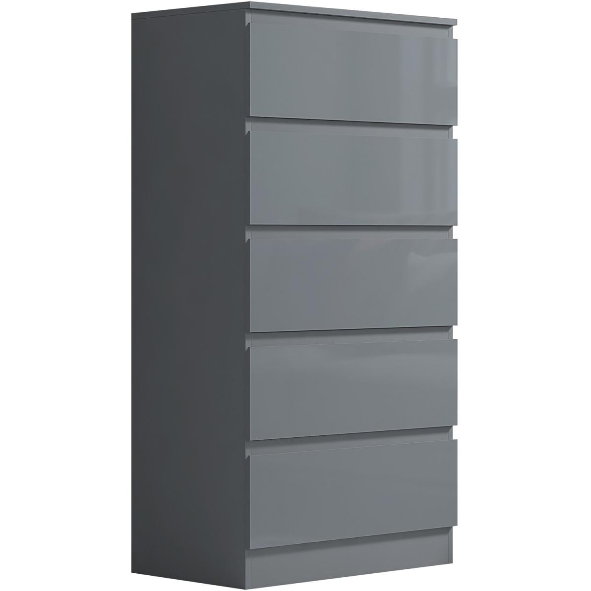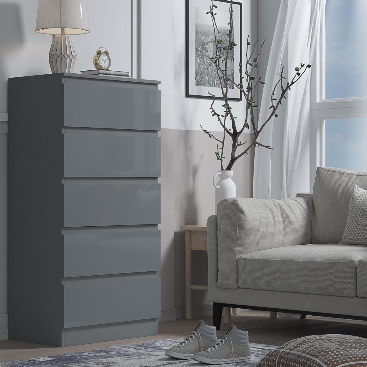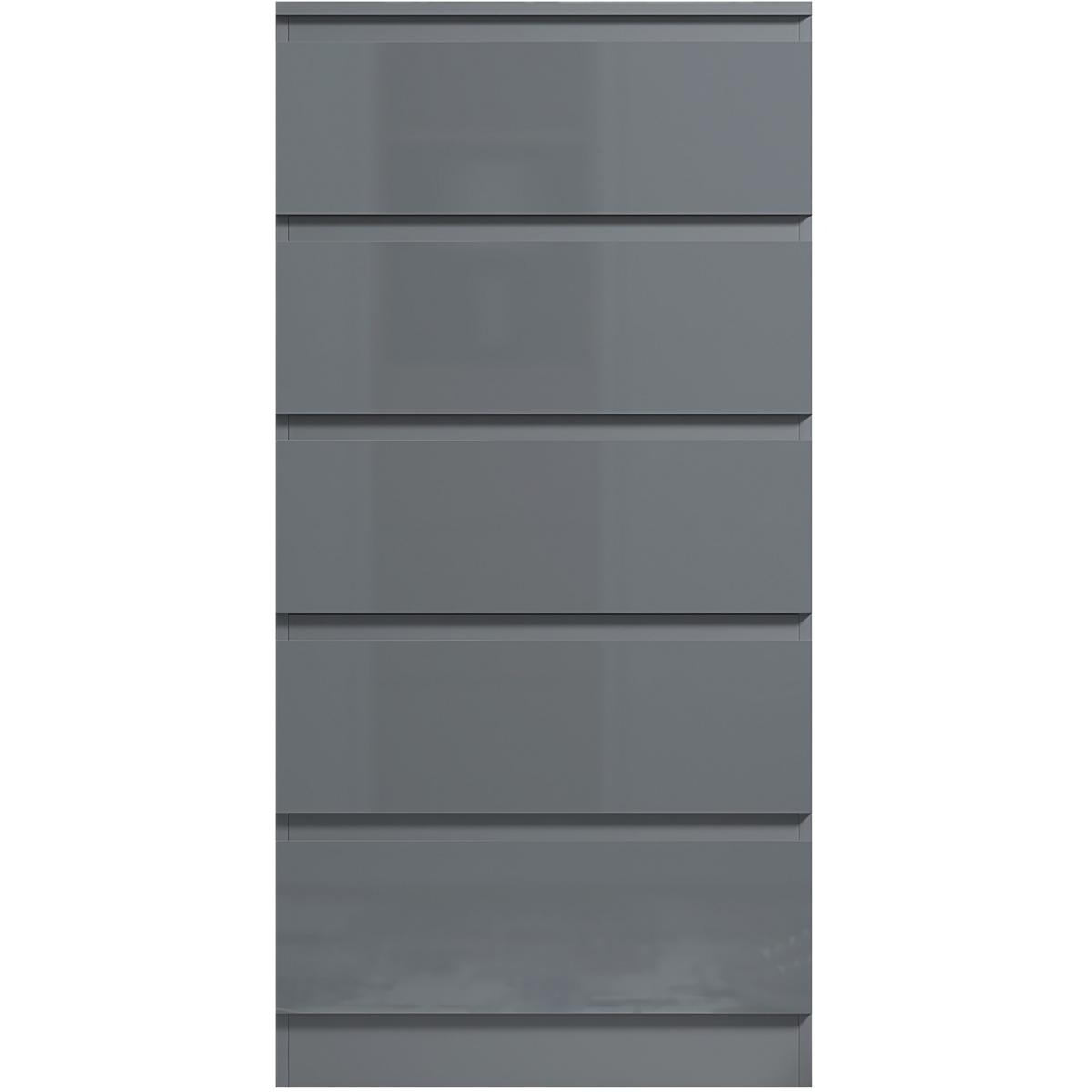 Introducing the Stora 5 Drawer Chest of Drawers, a stunning piece of furniture that combines style and practicality. The chest of drawers boasts a sleek, modern design with High Gloss Grey Drawer Fronts and a Matt Grey Frame that will complement any contemporary decor. Each drawer is equipped with centralized drawer runners for added strength and stability, ensuring that your belongings are securely stored. The chamfered drawer fronts provide a touch of elegance and make opening and closing the drawers effortless. To ensure durability and longevity, the Stora 5 Drawer Chest of Drawers is coated with a scratch and UV-resistant Melamine Coating. This coating protects the chest of drawers from daily wear and tear, making it the perfect investment for your bedroom. The Stora 5 Drawer Chest of Drawers provides ample storage space for your clothing, accessories, and other essentials. With five spacious drawers, you can keep your bedroom organized and clutter-free. The chest of drawers is also perfect for smaller living spaces, as it provides plenty of storage without taking up too much floor space.
