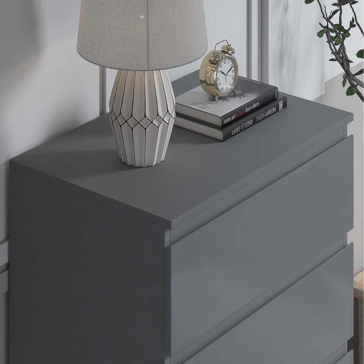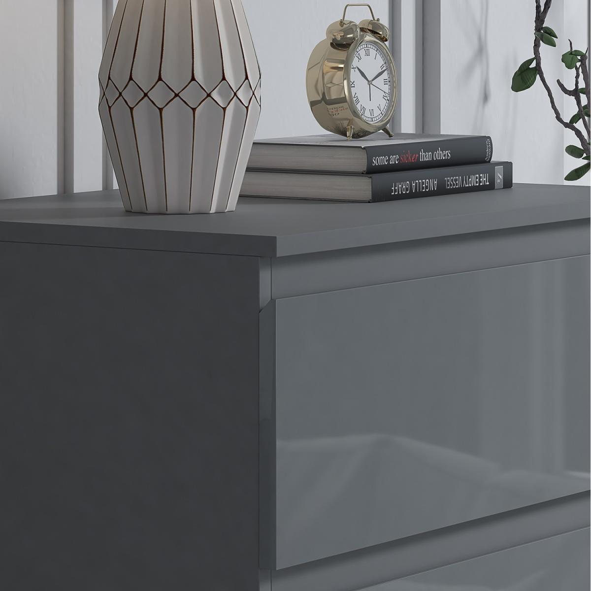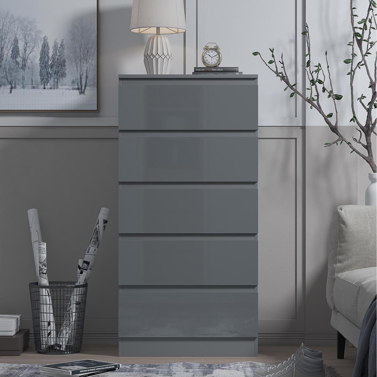 Introducing the Stora 5 Drawer Chest of Drawers, a stunning piece of furniture that combines style and practicality. The chest of drawers boasts a sleek, modern design with High Gloss Grey Drawer Fronts and a Matt Grey Frame that will complement any contemporary decor. Each drawer is equipped with centralized drawer runners for added strength and stability, ensuring that your belongings are securely stored. The chamfered drawer fronts provide a touch of elegance and make opening and closing the drawers effortless. To ensure durability and longevity, the Stora 5 Drawer Chest of Drawers is coated with a scratch and UV-resistant Melamine Coating. This coating protects the chest of drawers from daily wear and tear, making it the perfect investment for your bedroom. The Stora 5 Drawer Chest of Drawers provides ample storage space for your clothing, accessories, and other essentials. With five spacious drawers, you can keep your bedroom organized and clutter-free. The chest of drawers is also perfect for smaller living spaces, as it provides plenty of storage without taking up too much floor space.