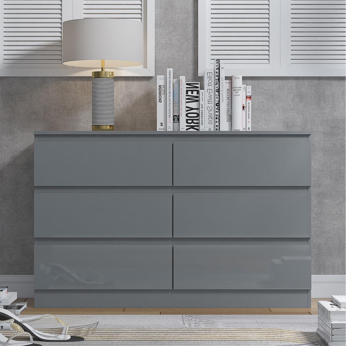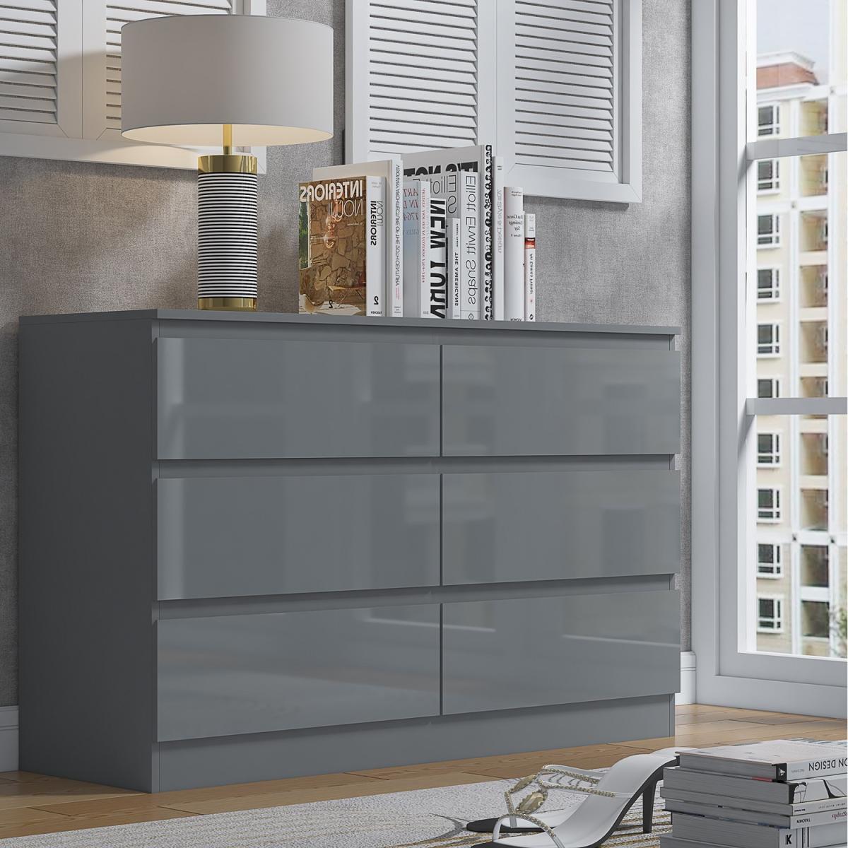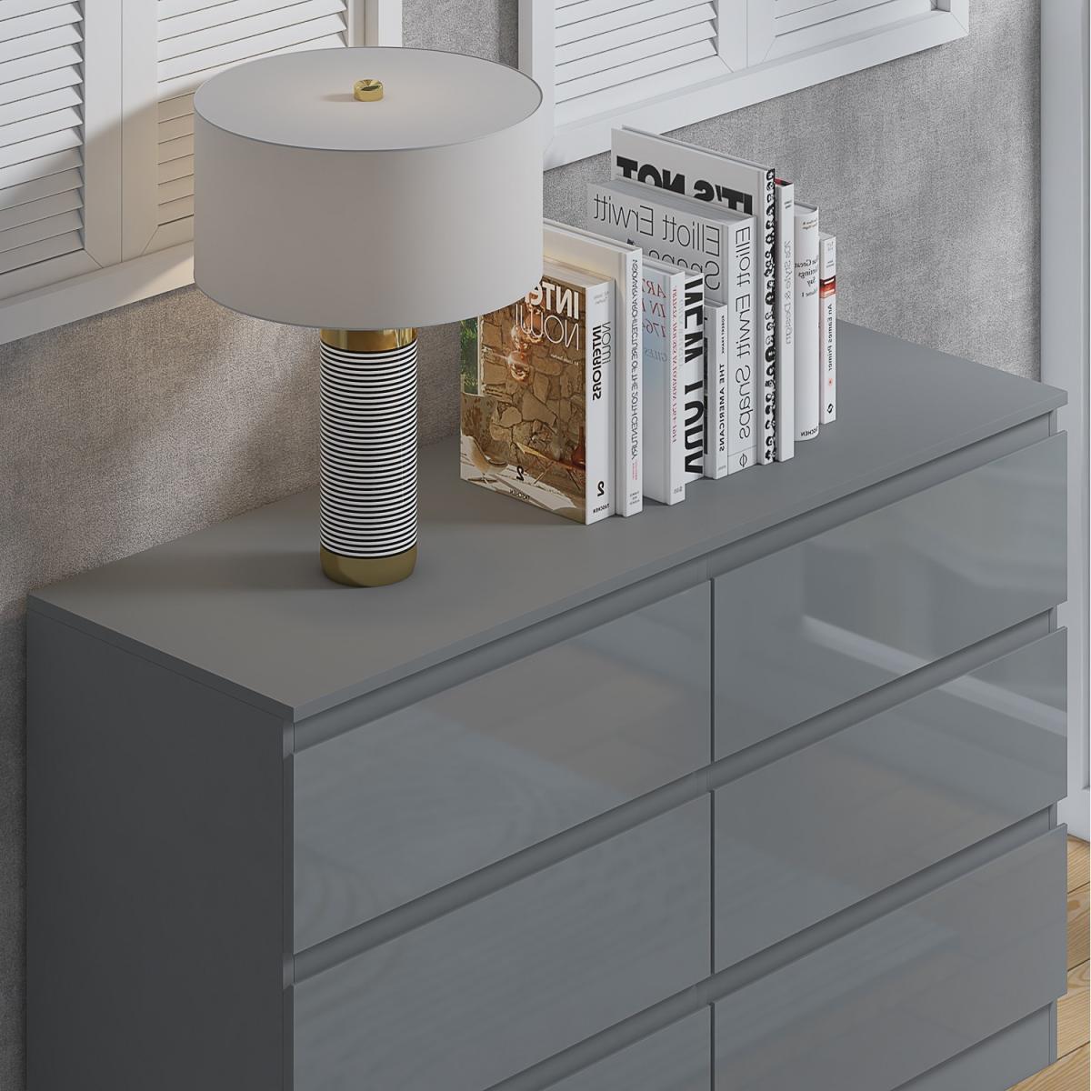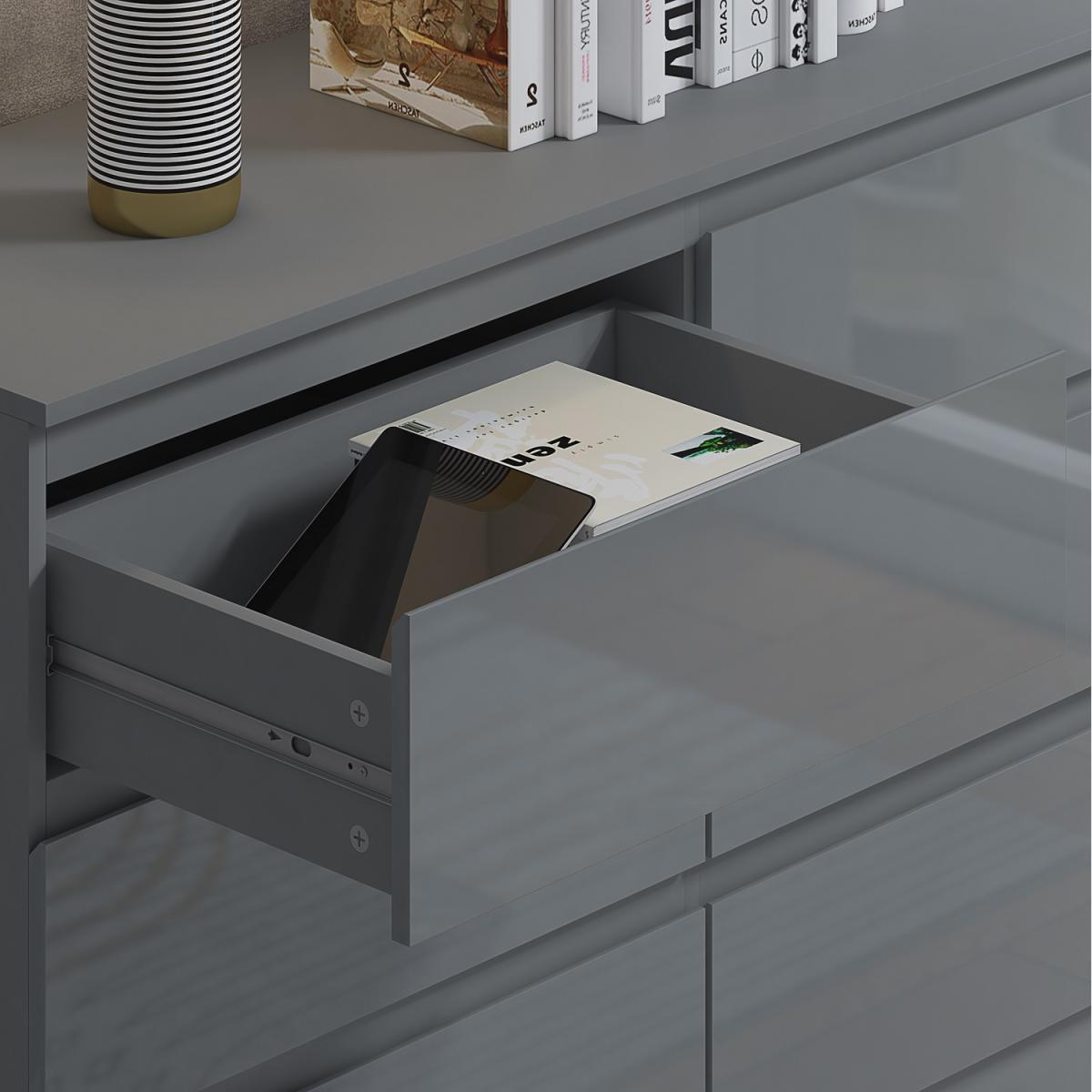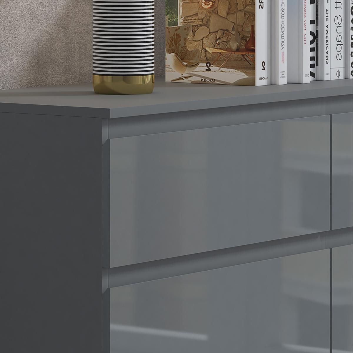 Introducing the Stora 6 Drawer Chest of Drawers, a stunning piece of furniture that combines style and practicality. The chest of drawers boasts a sleek, modern design with High Gloss Grey Drawer Fronts and a Matt Grey Frame that will complement any contemporary decor. Each drawer is equipped with centralized drawer runners for added strength and stability, ensuring that your belongings are securely stored. The chamfered drawer fronts provide a touch of elegance and make opening and closing the drawers effortless. To ensure durability and longevity, the Stora 6 Drawer Chest of Drawers is coated with a scratch and UV-resistant Melamine Coating. This coating protects the chest of drawers from daily wear and tear, making it the perfect investment for your bedroom. The Stora 6 Drawer Chest of Drawers provides ample storage space for your clothing, accessories, and other essentials. With five spacious drawers, you can keep your bedroom organized and clutter-free. The chest of drawers is also perfect for smaller living spaces, as it provides plenty of storage without taking up too much floor space.