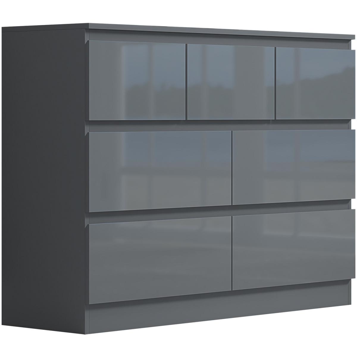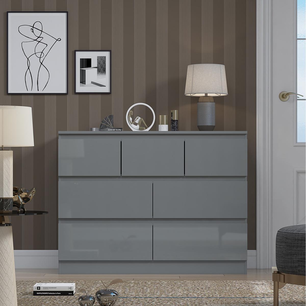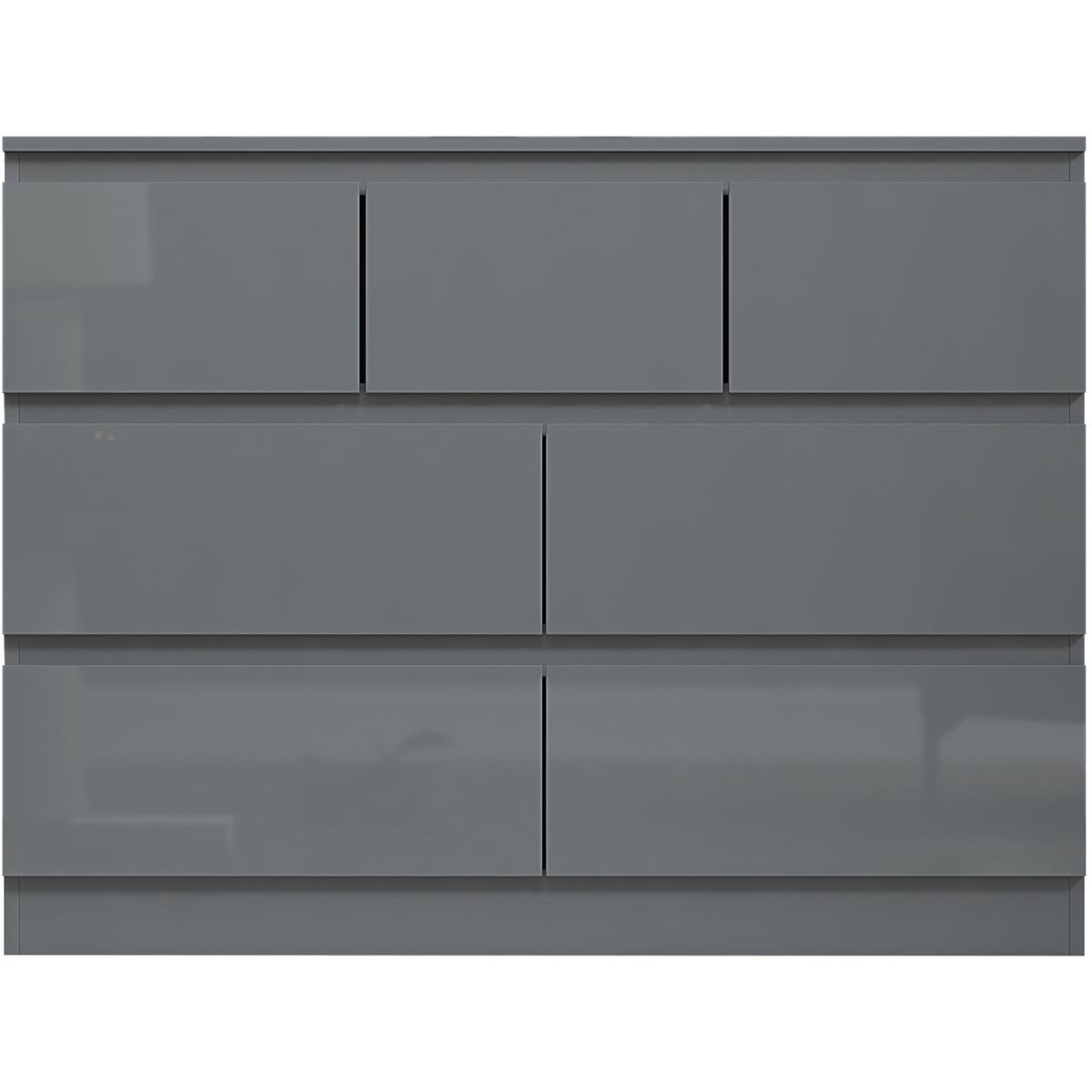 Introducing the Stora 7 Drawer Chest of Drawers, a stunning piece of furniture that combines style and practicality. The chest of drawers boasts a sleek, modern design with High Gloss Grey Drawer Fronts and a Matt Grey Frame that will complement any contemporary decor. Each drawer is equipped with centralized drawer runners for added strength and stability, ensuring that your belongings are securely stored. The chamfered drawer fronts provide a touch of elegance and make opening and closing the drawers effortless. To ensure durability and longevity, the Stora 7 Drawer Chest of Drawers is coated with a scratch and UV-resistant Melamine Coating. This coating protects the chest of drawers from daily wear and tear, making it the perfect investment for your bedroom. The Stora 7 Drawer Chest of Drawers provides ample storage space for your clothing, accessories, and other essentials. With five spacious drawers, you can keep your bedroom organized and clutter-free. The chest of drawers is also perfect for smaller living spaces, as it provides plenty of storage without taking up too much floor space.