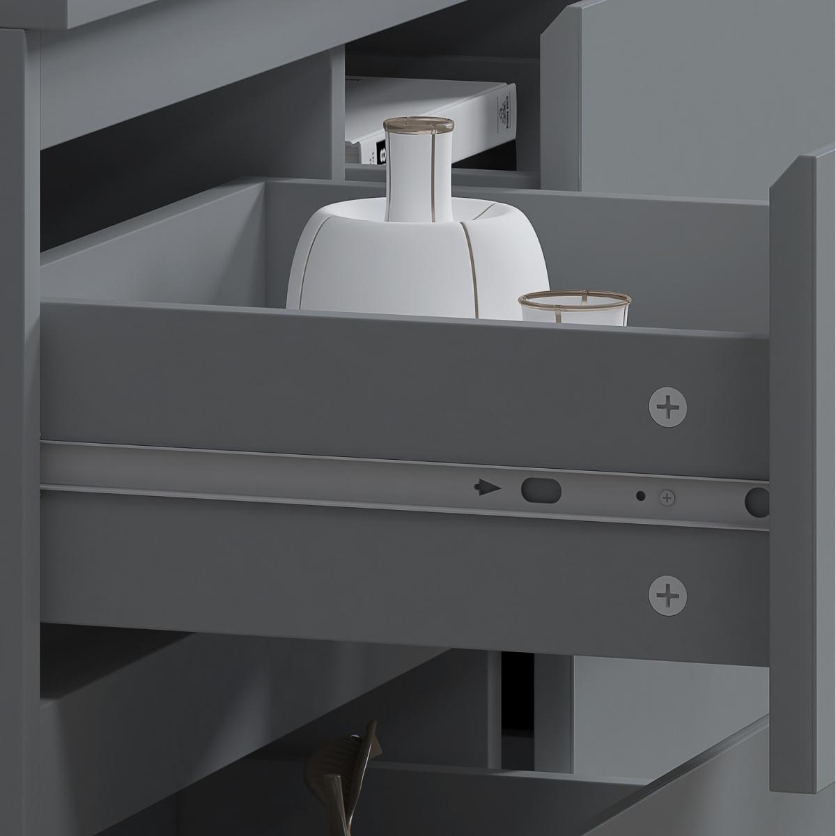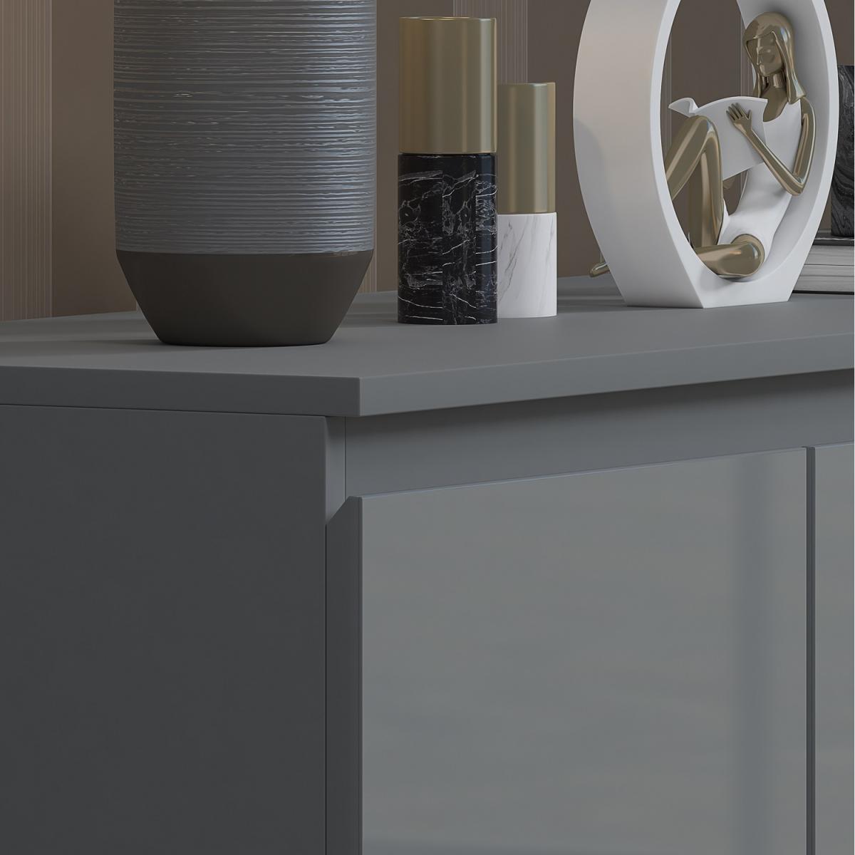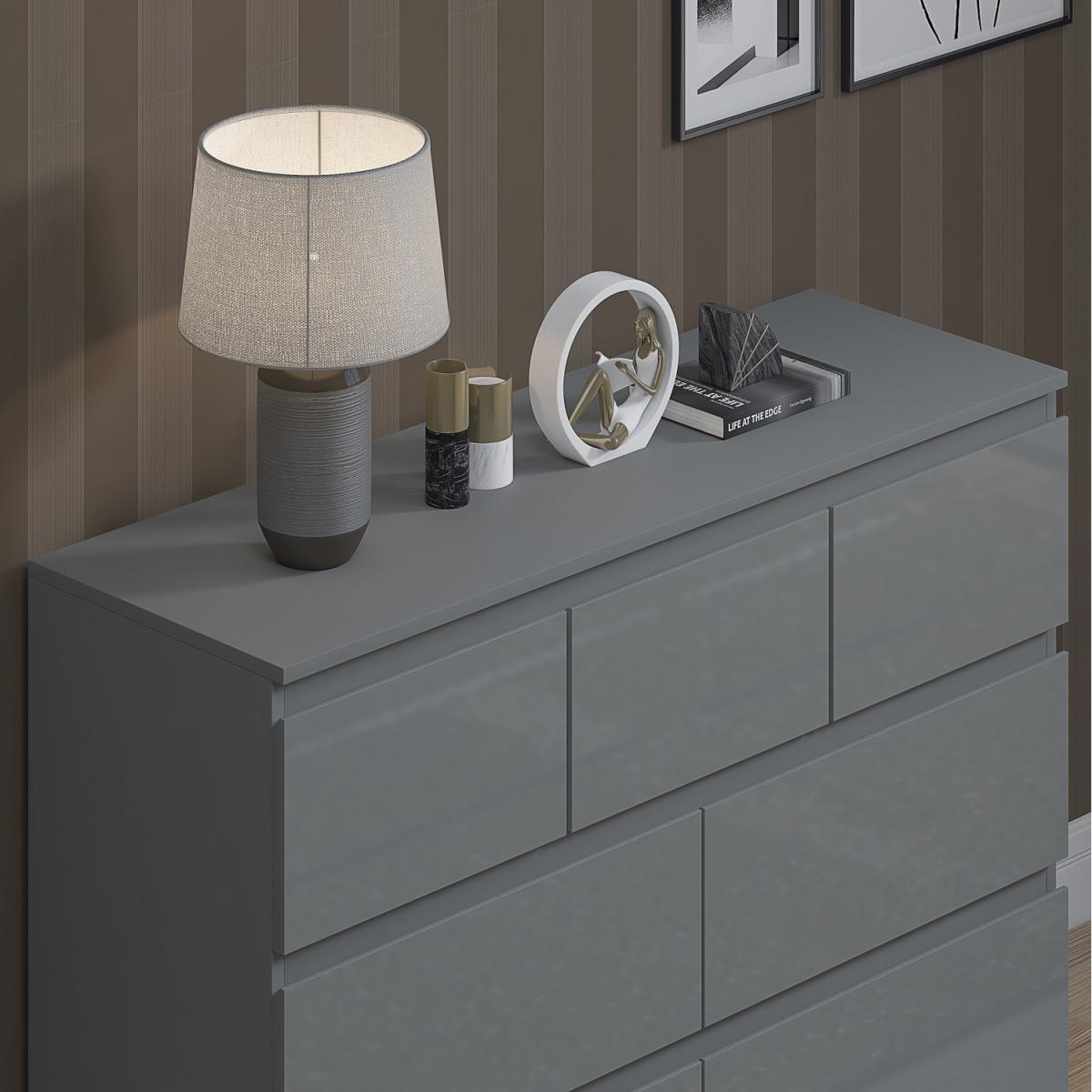 Introducing the Stora 7 Drawer Chest of Drawers, a stunning piece of furniture that combines style and practicality. The chest of drawers boasts a sleek, modern design with High Gloss Grey Drawer Fronts and a Matt Grey Frame that will complement any contemporary decor. Each drawer is equipped with centralized drawer runners for added strength and stability, ensuring that your belongings are securely stored. The chamfered drawer fronts provide a touch of elegance and make opening and closing the drawers effortless. To ensure durability and longevity, the Stora 7 Drawer Chest of Drawers is coated with a scratch and UV-resistant Melamine Coating. This coating protects the chest of drawers from daily wear and tear, making it the perfect investment for your bedroom. The Stora 7 Drawer Chest of Drawers provides ample storage space for your clothing, accessories, and other essentials. With five spacious drawers, you can keep your bedroom organized and clutter-free. The chest of drawers is also perfect for smaller living spaces, as it provides plenty of storage without taking up too much floor space.