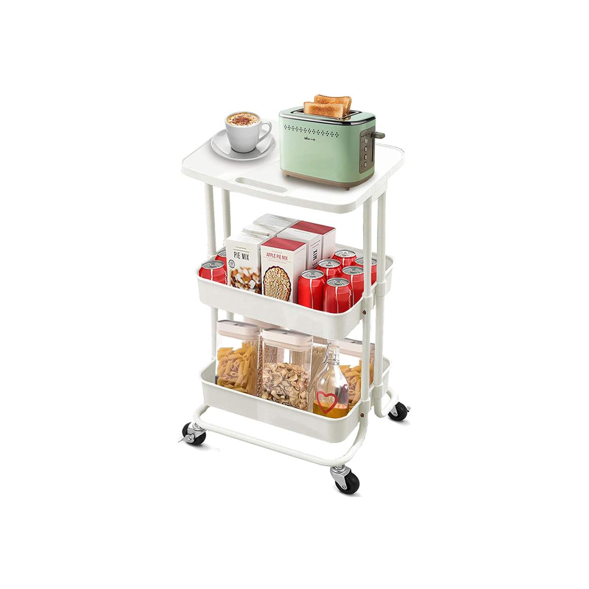 The 3-layer storage trolley cart is made of metal, which is sturdy and durable. The total load-bearing capacity is up to 60kg, and each basket bears 20kg. The rolling cart is ideal for the kitchen, bathroom, bedroom, living room, makeup, barber shop, etc. Size L43xW32xH7. 5cm. The storage rolling cart is equipped with a handle and 4 strong 360-degree rotating wheels(2 lockable). Even though the cart is full of things, you can push it anywhere in the house you want easily. Two of the wheels can be locked, so you can keep the cart safely in place without sliding. 2 larger baskets with elevated edges ensure that your items remain secure when the cart is moving. The kitchen trolley basket designed hollow-carved allows airflow to prevent odour and rustiness. The table top makes the trolley cart meet your extra needs. You can put books, laptops, makeup food, and drinks for your daily life. With the Card slot designed, it is easy to move anywhere and be in control. The Dripex organizer cart can decorate your indoor space, suit various styles of interior design, and provide useful storage space.