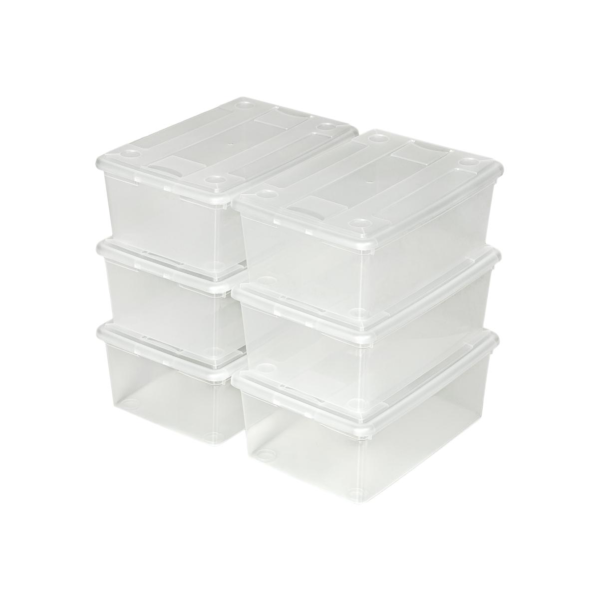 These practical and universal plastic storage boxes can be used for any type of storage. Whether for shoes, clothes, toys, tools or other items. Everything is tidied away and has its place with these. The boxes are transparent, so that the contents are immediately visible. Thanks to the design of the surface, the boxes can also be stacked in storage without slipping out of place.