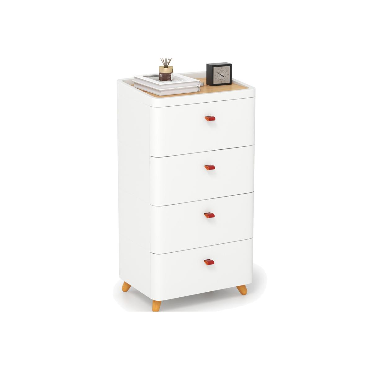 Optimize your storage with our white drawer chest. Featuring 4 spacious drawers and a removable organizer tray, this versatile chest offers ample space for organizing various items. It also comes with a detachable bamboo top board and solid wood legs, adding a touch of elegance. The minimalist and versatile design makes it suitable for various settings.