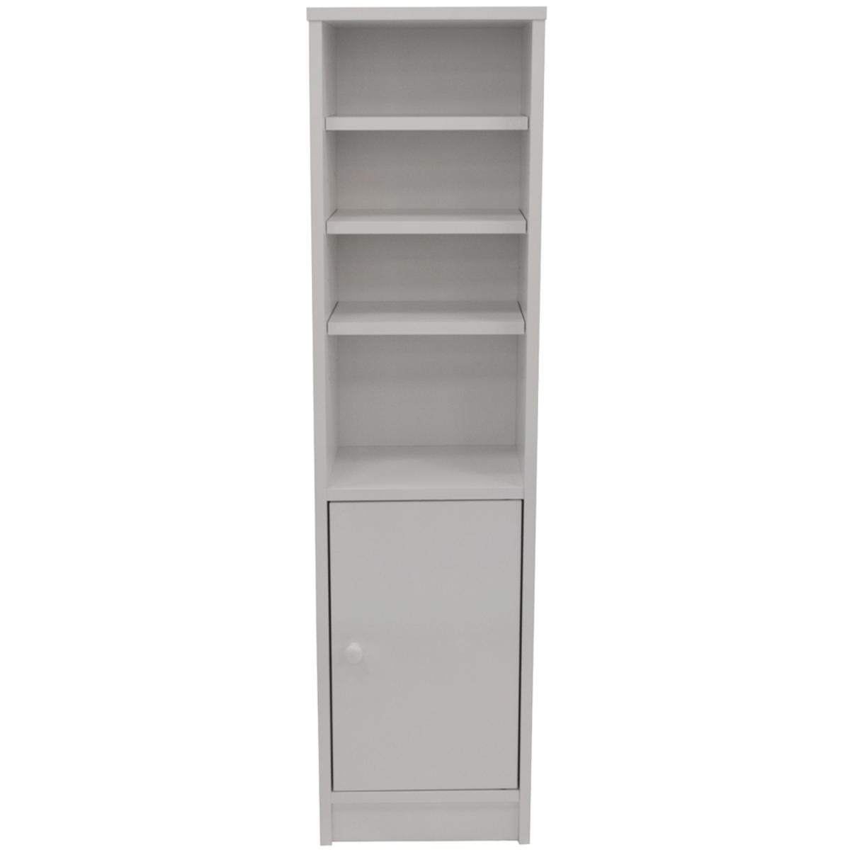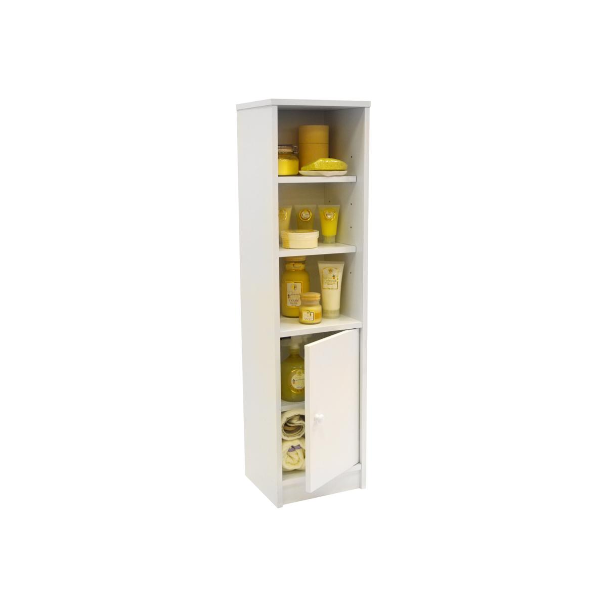 Small storage unit with lower cupboard section with adjustable shelf and open section at top with two adjustable shelves. Ideal for in your kitchen or bathroom. Top shelf section total 57.5h x 25w x 22.3d cm - Base cupboard section total 40.8h x 25w x 22.3cm. 3 x Adjustable shelves 25w x 19d x 1.7cm thick - which can be used in the top and base sections. Perfect for bathrooms due to its small footprint. Display items not included.