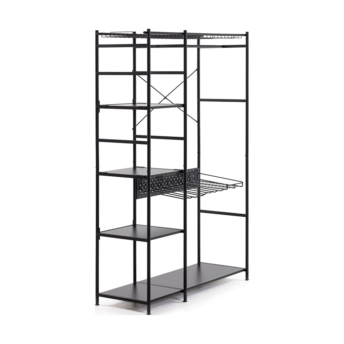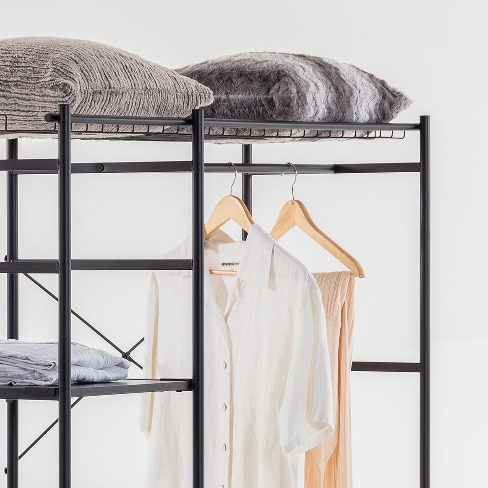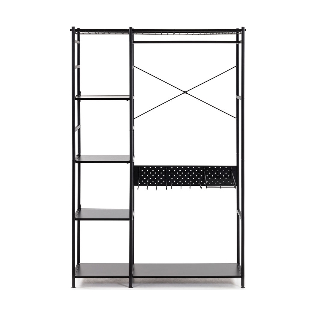 A contemporary alternative to your usual clothes storage, the Storn Open Wardrobe has shelving, shelving and more shelving! Perfect in the bedrooms; the strong steel and melamine Storn unit would also work really well in the hallway or utility as shoe and bag storage. With 4 separate compartments store jumpers, t-shirts and jeans and add a set of hangers to the clothes rail to keep shirts and dresses crinkle-free. Including 8 hooks, trousers even get a home! Designed with a large and a small rack; store bags and blankets at the top and belts and accessories can be organised in the smaller one below. With all of this space and an open design, getting up in the morning will be a pleasure!.