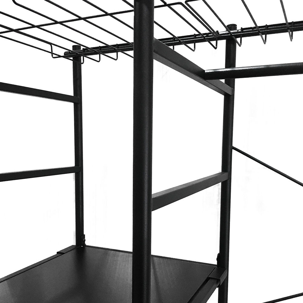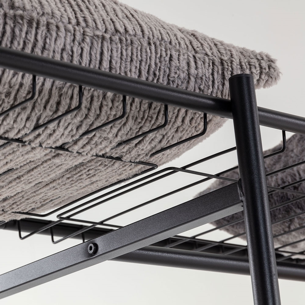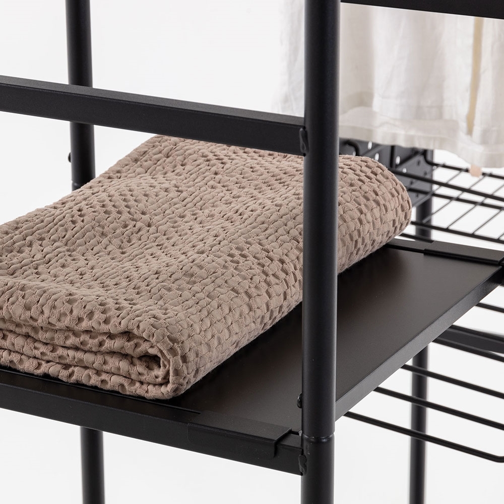 A contemporary alternative to your usual clothes storage, the Storn Open Wardrobe has shelving, shelving and more shelving! Perfect in the bedrooms; the strong steel and melamine Storn unit would also work really well in the hallway or utility as shoe and bag storage. With 4 separate compartments store jumpers, t-shirts and jeans and add a set of hangers to the clothes rail to keep shirts and dresses crinkle-free. Including 8 hooks, trousers even get a home! Designed with a large and a small rack; store bags and blankets at the top and belts and accessories can be organised in the smaller one below. With all of this space and an open design, getting up in the morning will be a pleasure!.