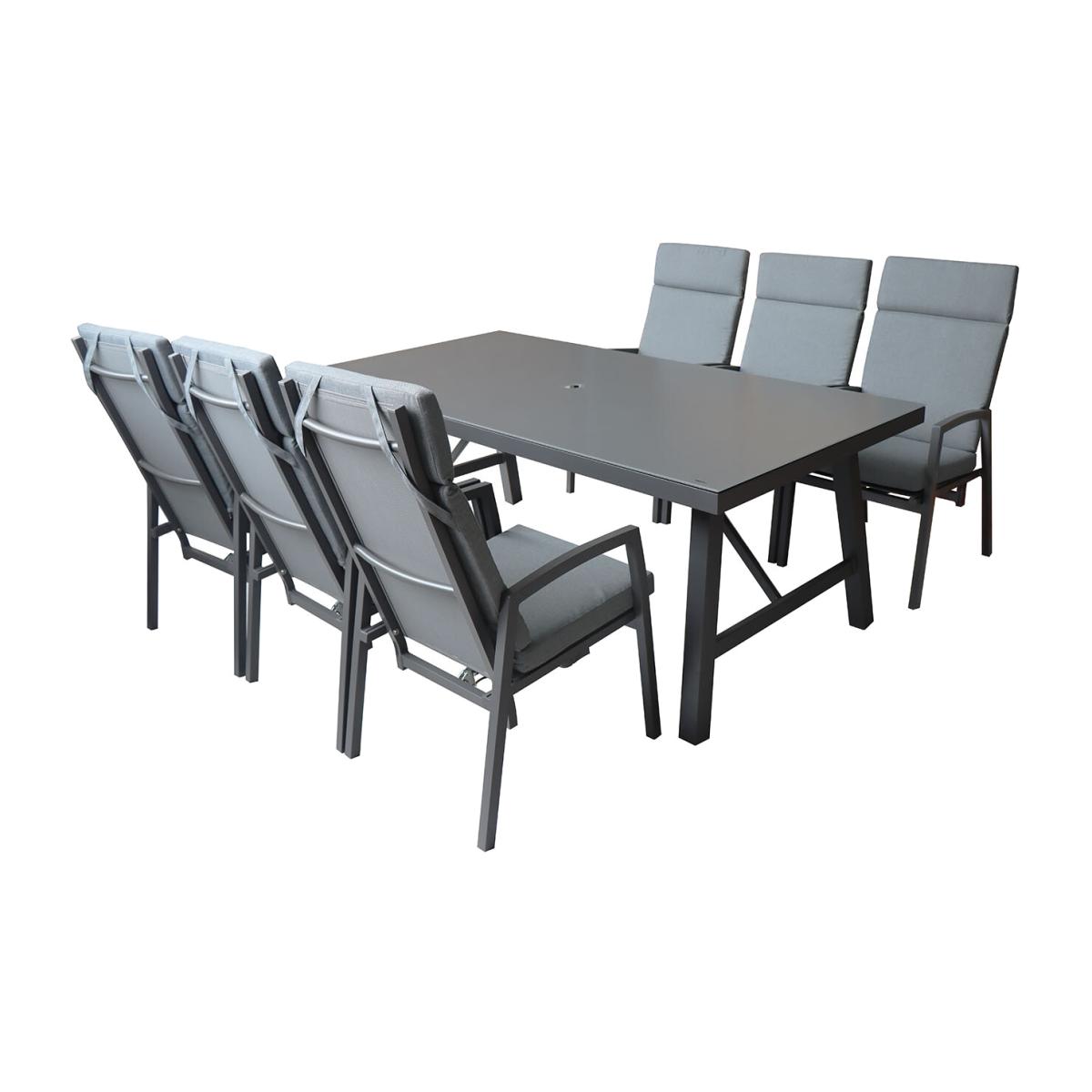 The Stowbridge 7 Piece Piston Dining Set is the ideal choice for family gatherings, BBQs, or outdoor dining in style. Featuring a durable aluminium frame with a powder-coated finish, this set is rust-resistant and built to last. Designed for up to six people, it's perfect for everyday meals or special occasions. The tempered glass tabletop offers high strength and enhanced longevity. The chairs are equipped with adjustable air cylinders, allowing you to customise your comfort to suit your preferences. They can serve as dining chairs or recline for a more relaxed seating option. Sturdy and built to endure, this dining set creates a stunning focal point that will undoubtedly impress your guests.