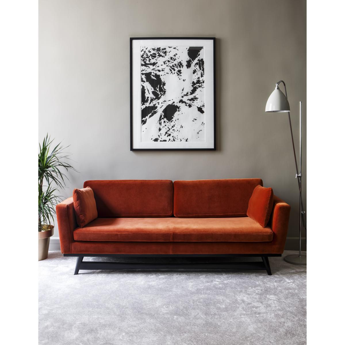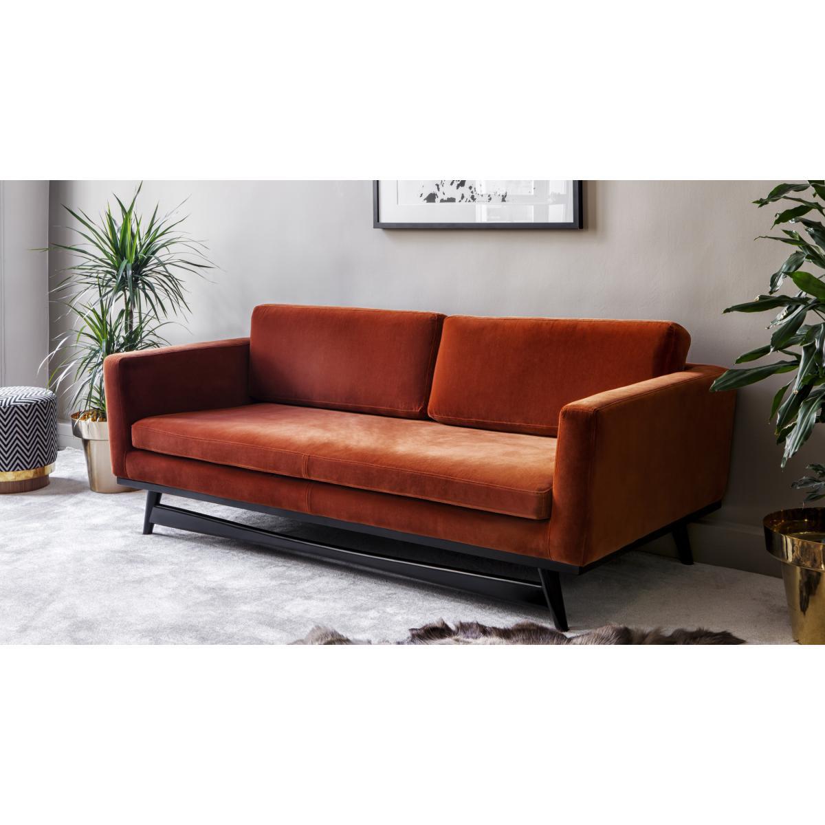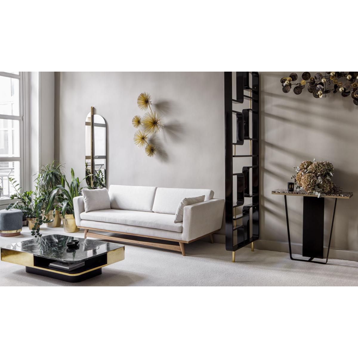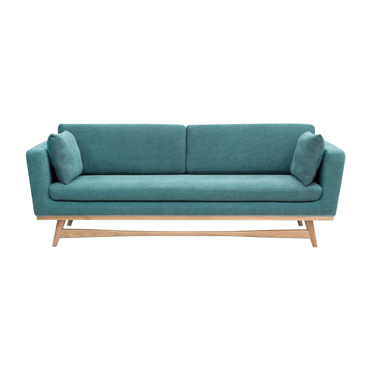 Fifties inspiration! An ingenious mix of retro lines and a contemporary design for this wonderful sofa. The clean lines and use of light wood give this sofa a natural Scandinavian look. The simple silhouette is enhanced by a soft seat covered with quality cotton. Made of solid oak, the sofa’s compass legs are underlined by a line of soft wood which gives this piece of furniture a contemporary look. This sofa is as gorgeous in front as behind: its upholstered back lets you position it in the middle of a room or against a wall. The considerable seat depth makes this sofa extremely comfortable. It can comfortably accommodate 3 people. This sofa will add a very trendy neo-vintage touch to your interior design. This timeless piece will be the centrepiece of your living room.