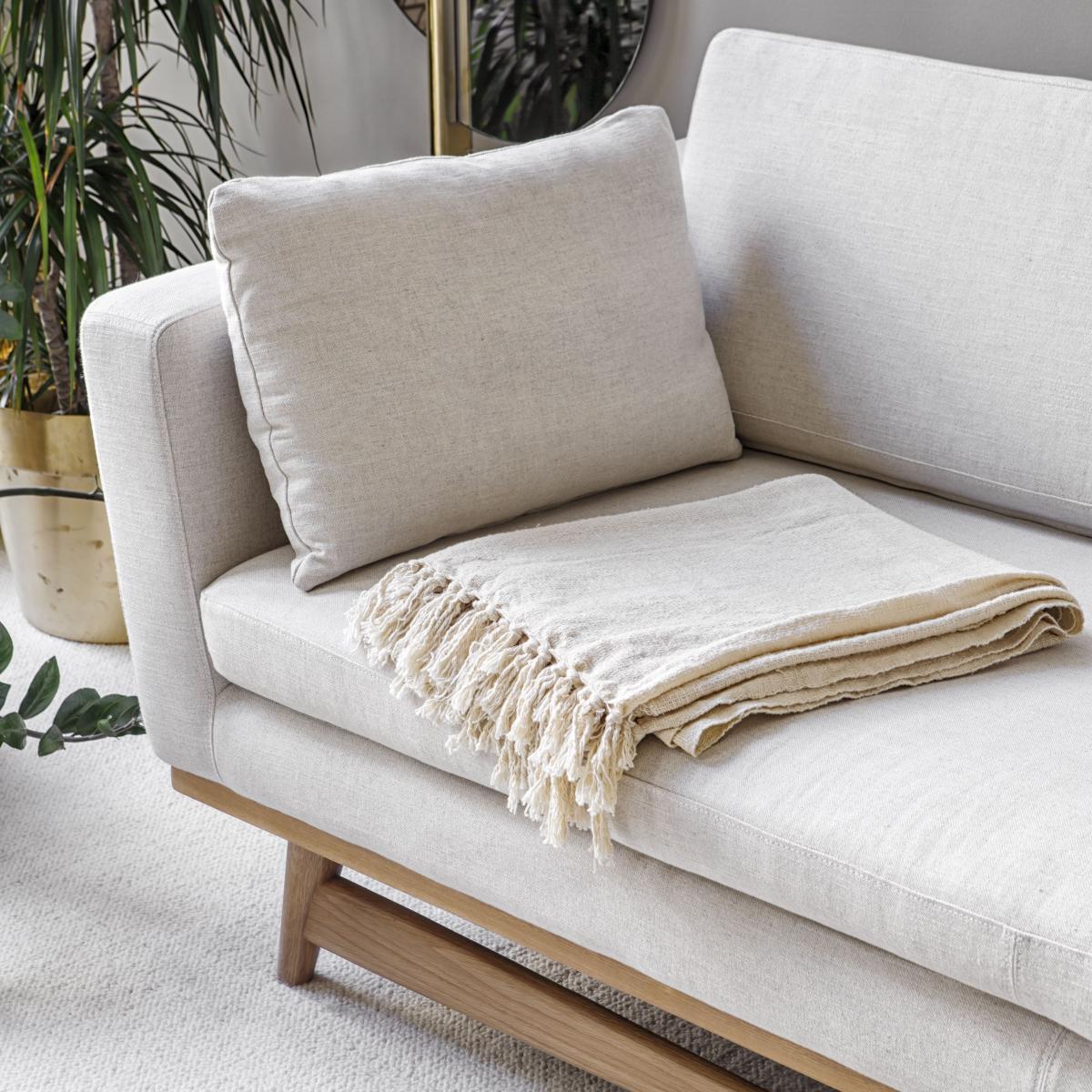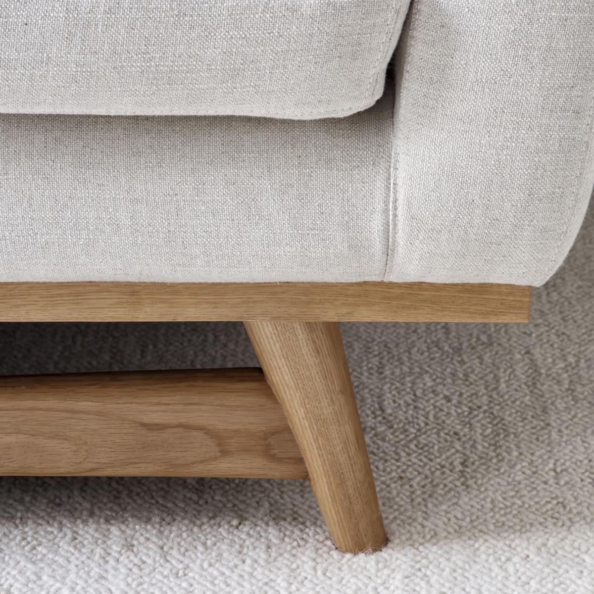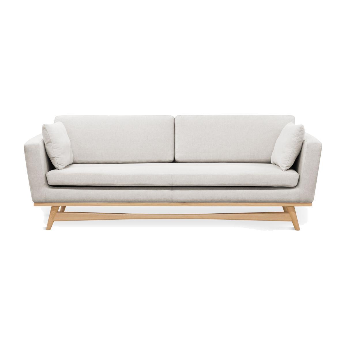 Fifties inspiration! An ingenious mix of retro lines and a contemporary design for this wonderful sofa. The clean lines and use of light wood give this sofa a natural Scandinavian look. The simple silhouette is enhanced by a soft seat covered with quality cotton. Made of solid oak, the sofa’s compass legs are underlined by a line of soft wood which gives this piece of furniture a contemporary look. This sofa is as gorgeous in front as behind: its upholstered back lets you position it in the middle of a room or against a wall. The considerable seat depth makes this sofa extremely comfortable. It can comfortably accommodate 3 people. This sofa will add a very trendy neo-vintage touch to your interior design. This timeless piece will be the centrepiece of your living room.
