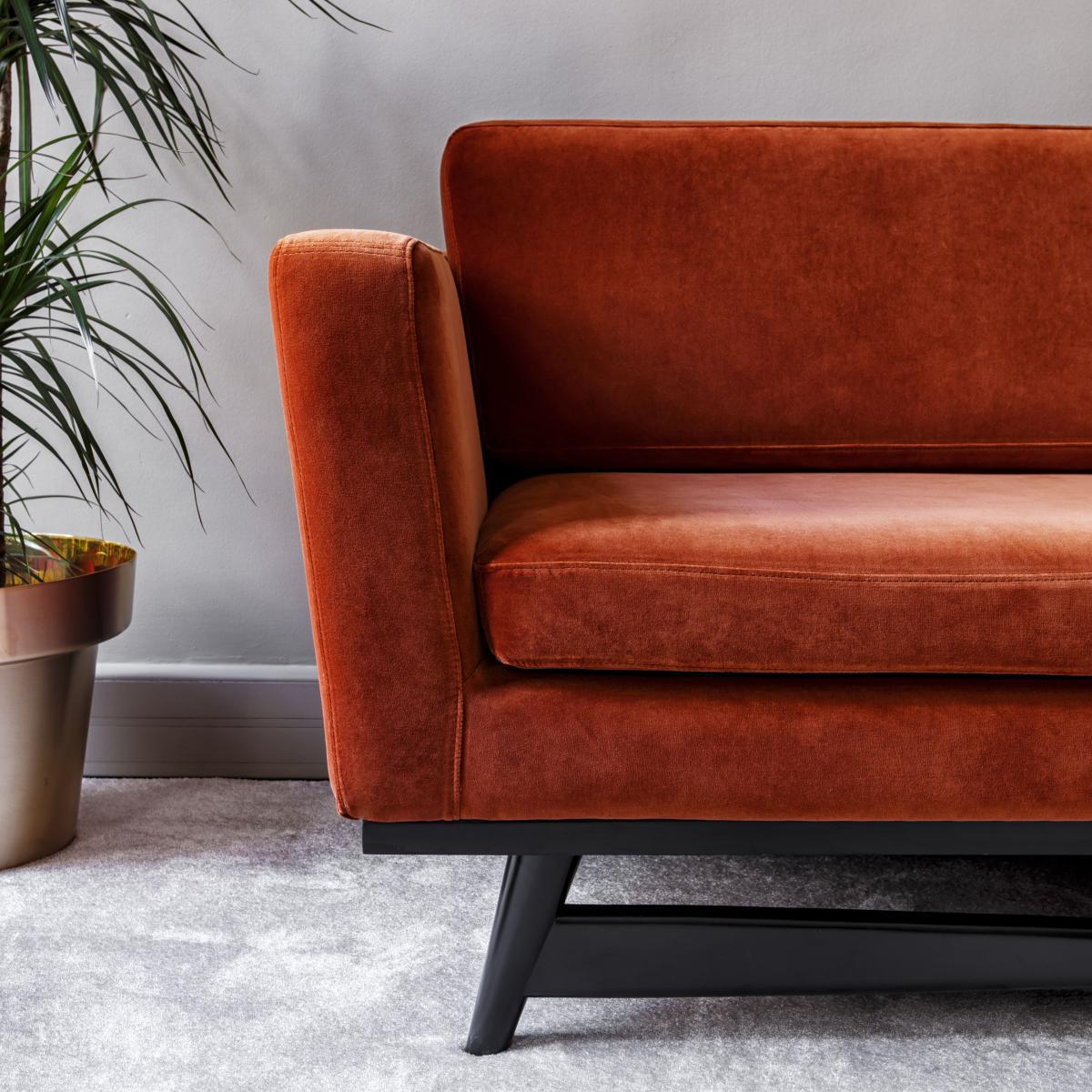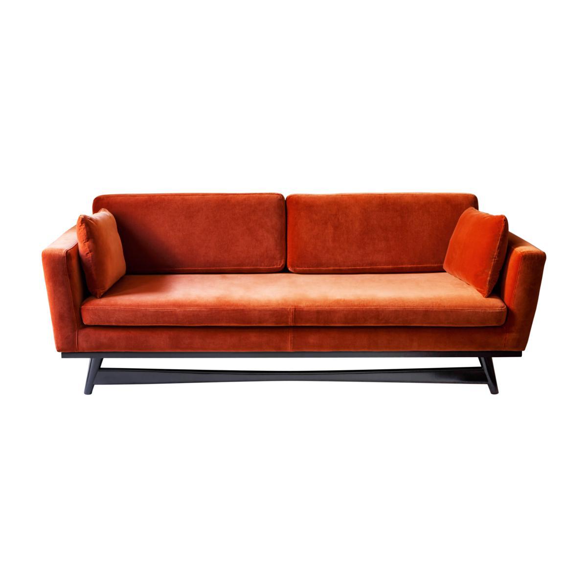 Fifties inspiration! An ingenious mix of retro lines and a contemporary design for this wonderful sofa. The clean lines and use of light wood give this sofa a natural Scandinavian look. The simple silhouette is enhanced by a soft seat covered with luxurious velvet. Made of solid oak, the sofa’s compass legs are underlined by a line of soft wood which gives this piece of furniture a contemporary look. This sofa is as gorgeous in front as behind: its upholstered back lets you position it in the middle of a room or against a wall. The considerable seat depth makes this sofa extremely comfortable. It can comfortably accommodate 3 people. This sofa will add a very trendy neo-vintage touch to your interior design. This timeless piece will be the centrepiece of your living room.
