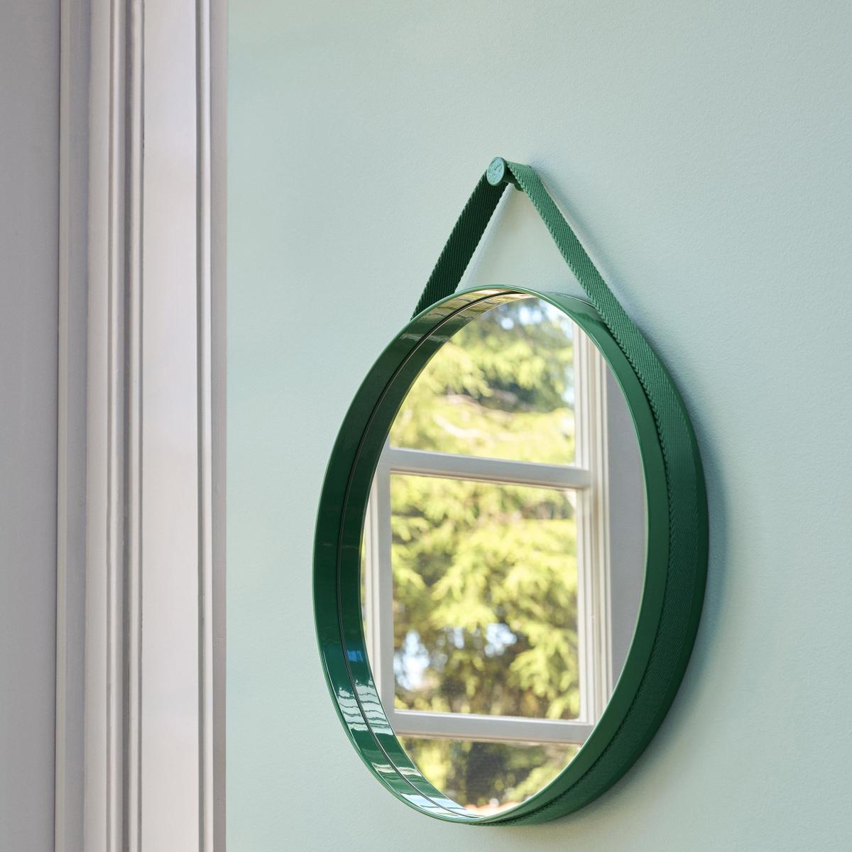 A fun, urban mirror... Strap is inspired by a ritual habit we perform when we arrive home: throwing your scarf on a coat rack. The hanging scarf turns into a fabric strap used to hold the mirror! This design, resulting from a simple idea, provides a very original aesthetic. The frame of the mirror as well as the peg (included) used to suspend it are in lacquered steel. This mirror will dress your wall with elegance. It’s ideal in a bathroom, entrance or bedroom.