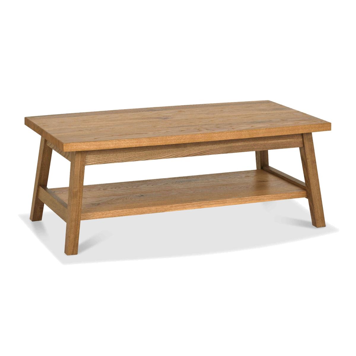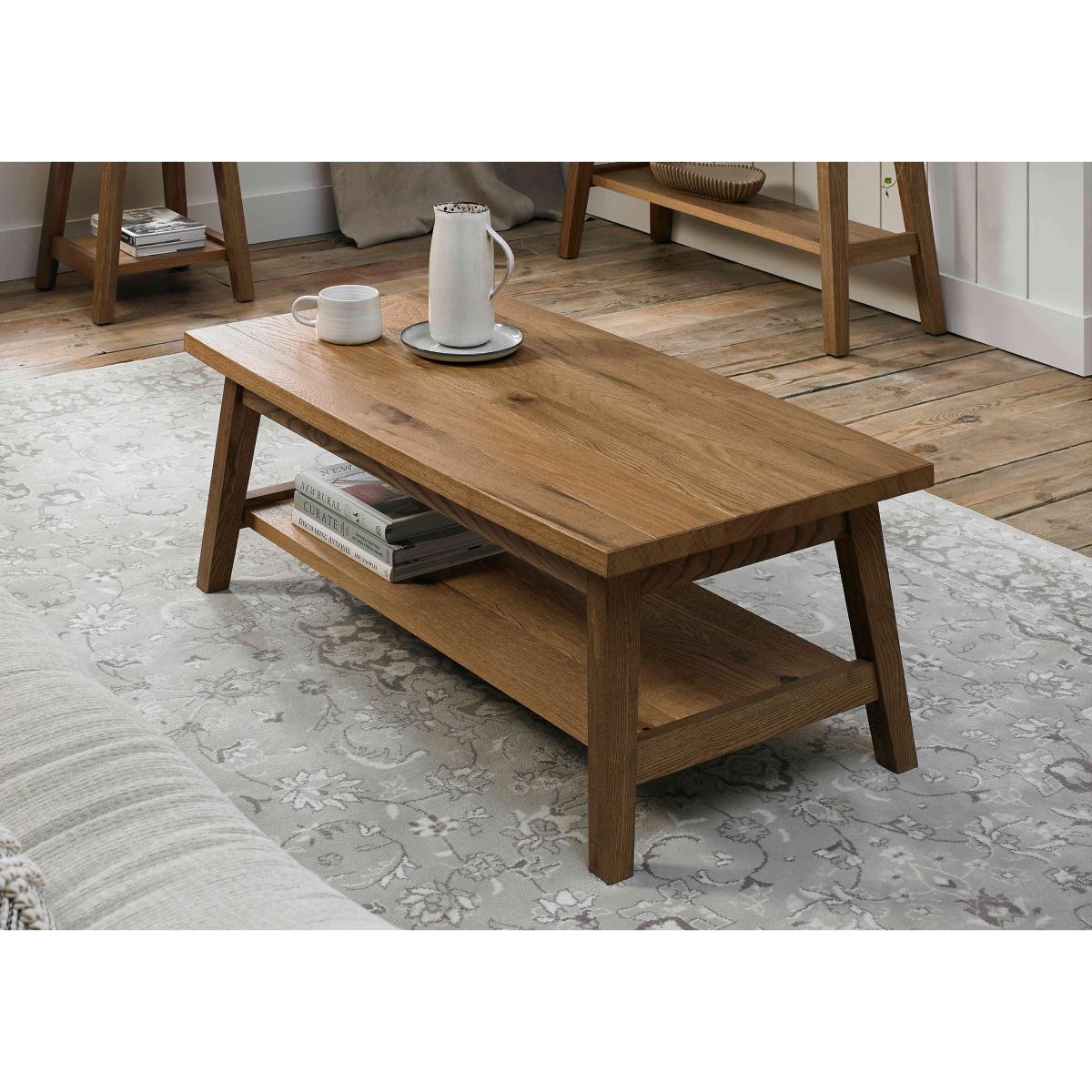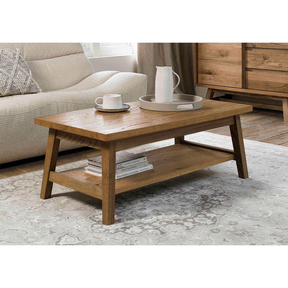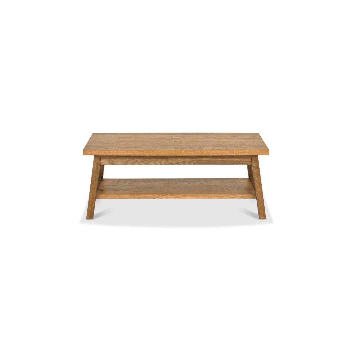 The beauty and craftsmanship of traditional oak furniture meets contemporary finishes and striking urban details in our Stratford range. Offering an extensive choice of pieces for stylish living rooms and dining rooms, the collection’s signature style motifs include planked table tops and surfaces, wire brushed and oiled finishes, H-frame bases and creative space-saving storage solutions. Extending dining tables have striking boat-shaped tops and dining sets include versatile seating options – dining benches and the range’s on-trend dining and dining arm chairs that are inspired by mid-century design. A fantastic choice for classic, modern country and industrial interiors. This contemporary oak coffee table is beautifully crafted and has a stylish rustic brushed finish, planked top and ash wood legs. Why you'll love it Traditional oak furniture reimagined for fans of contemporary industrial design. This large coffee table with a shelf marries style with practicality. Planked top is made with oak and oak veneer. Wire brushed for a rustic finish. Carefully oiled and then sealed so it’ll never need re-oiling. Handy lower shelf doubles the surface space. Ash wood frame and legs. This coffee table is part of our Stratford range. What you need to know Made with oak, oak veneer and solid ash. Every piece of wood has unique and natural marks, knots and colour variation. Avoid placing in direct sunlight or close to a heat source. Shop our Stratford range for well-crafted wood furniture for living and dining.