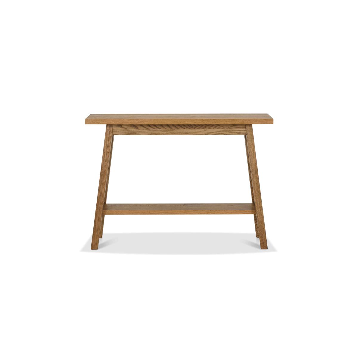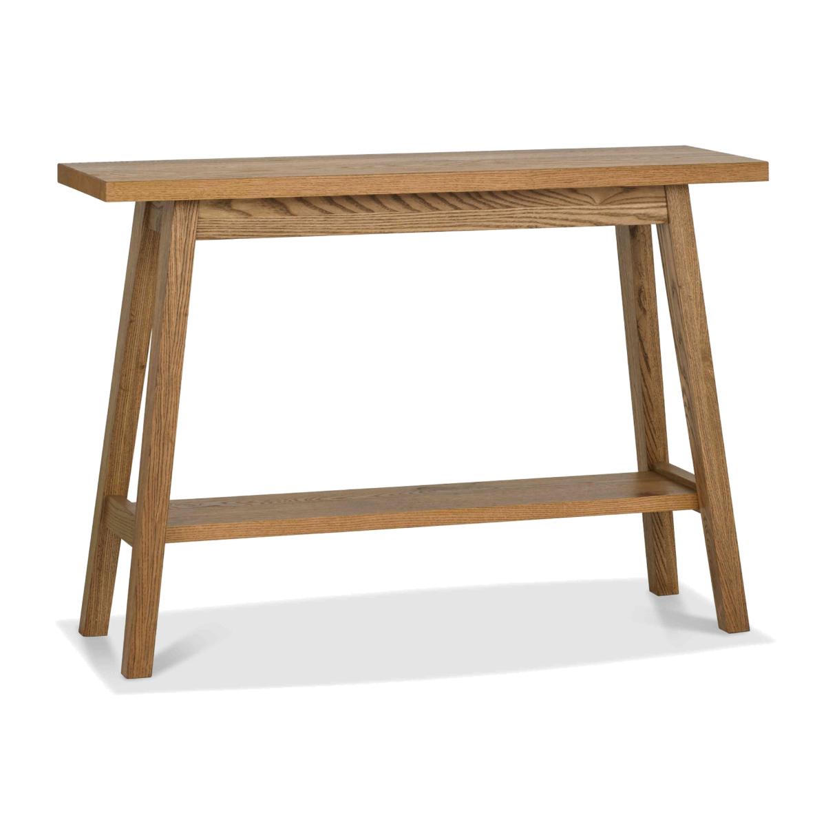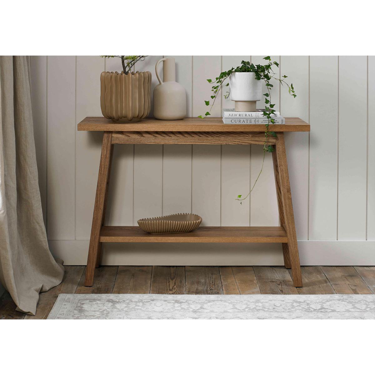 The beauty and craftsmanship of traditional oak furniture meets contemporary finishes and striking urban details in our Stratford range. Offering an extensive choice of pieces for stylish living rooms and dining rooms, the collection’s signature style motifs include planked table tops and surfaces, wire brushed and oiled finishes, H-frame bases and creative space-saving storage solutions. Extending dining tables have striking boat-shaped tops and dining sets include versatile seating options – dining benches and the range’s on-trend dining and dining arm chairs that are inspired by mid-century design. A fantastic choice for classic, modern country and industrial interiors. You'll always find a place in your home for a useful console table – especially if it’s as stylish as this one. We love its rustic brushed and oiled oak finish. Why you'll love it Traditional oak furniture reimagined for fans of contemporary industrial design. This console table with a shelf marries style with practicality. Planked top is made with oak and oak veneer. Wire brushed for a rustic finish. Carefully oiled and then sealed so it’ll never need re-oiling. Handy lower shelf doubles the surface space. Ash wood frame and legs. This console table is part of our Stratford range. What you need to know Made with oak, oak veneer and solid ash. Every piece of wood has unique and natural marks, knots and colour variation. Avoid placing in direct sunlight or close to a heat source. Shop our Stratford range for well-crafted wood furniture for living and dining.