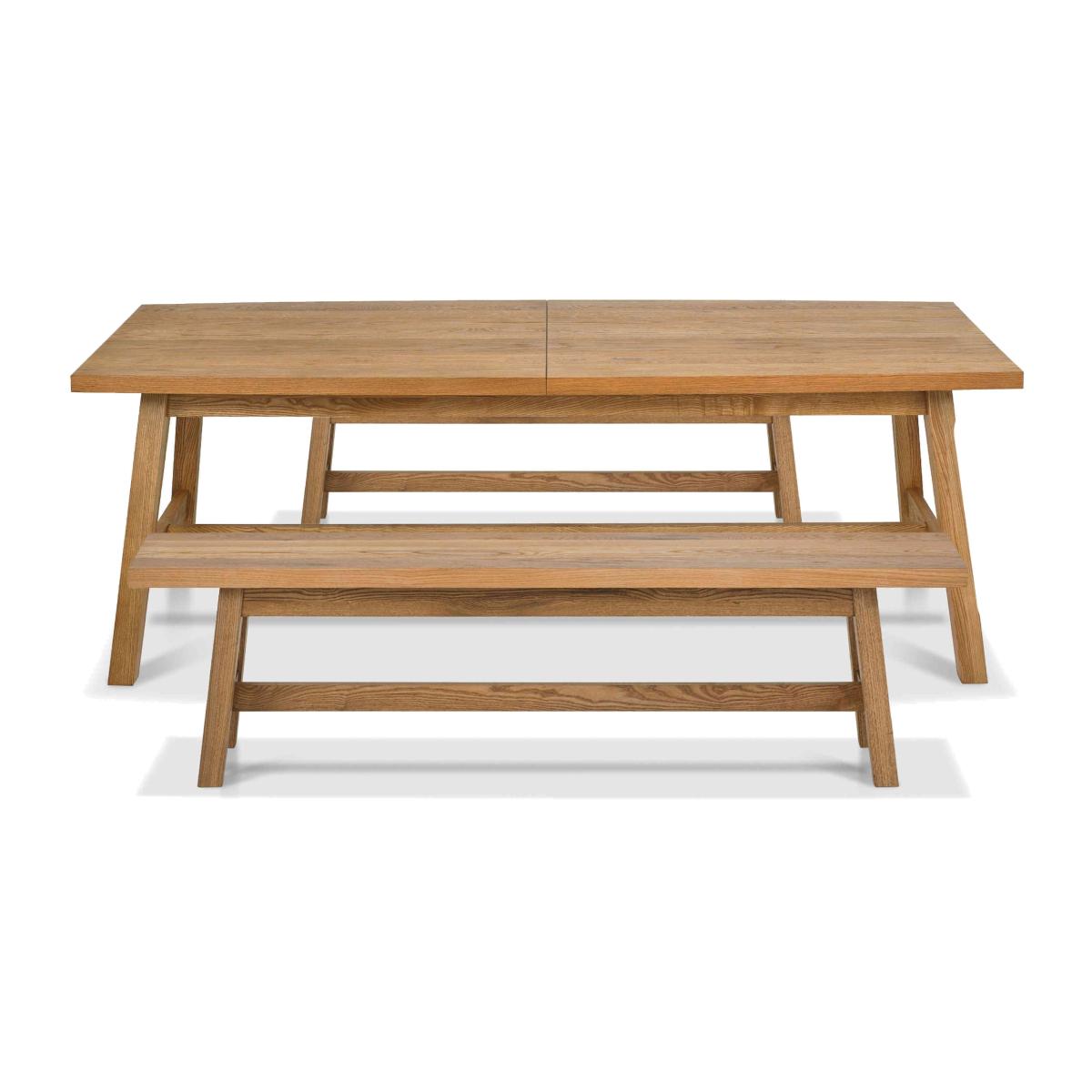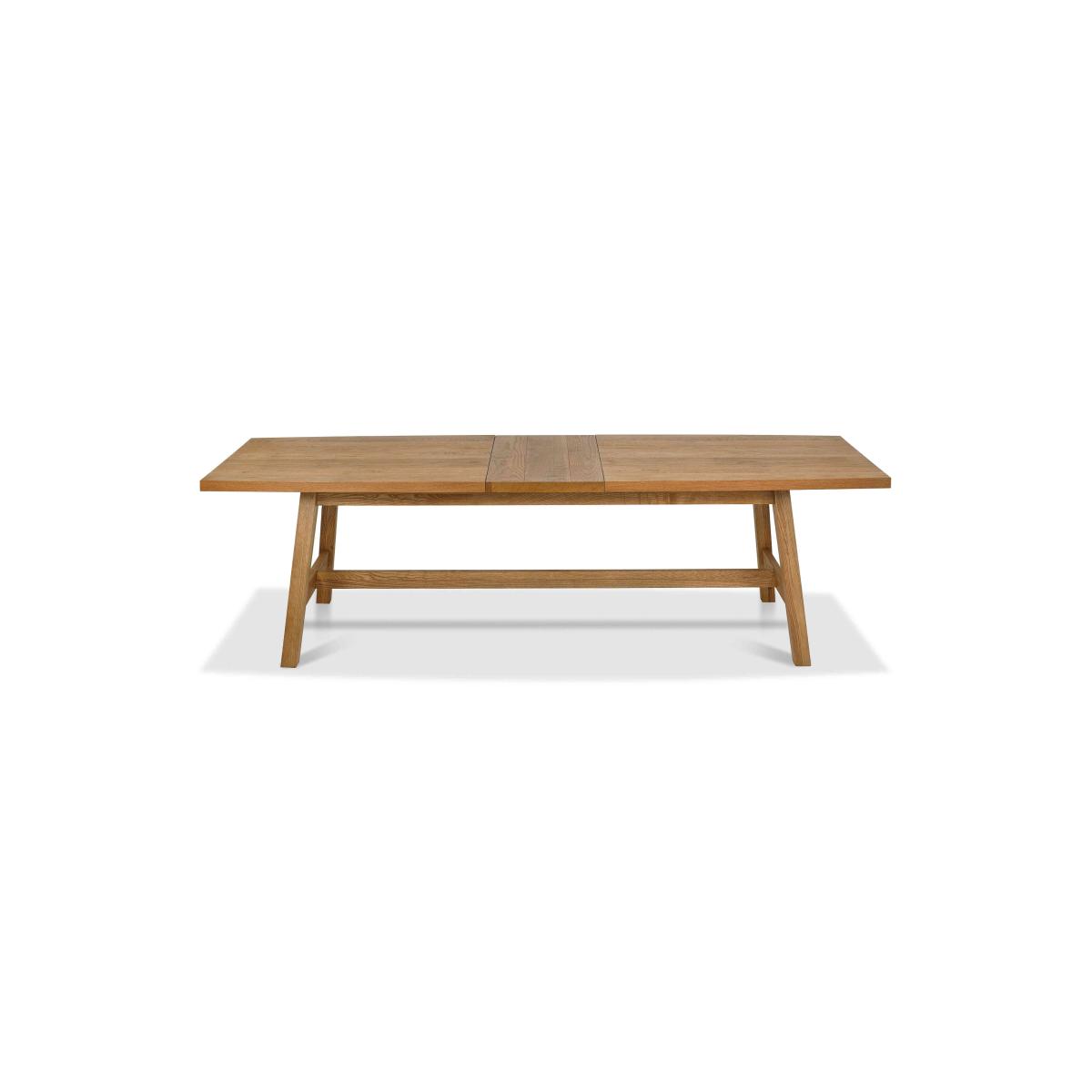 The beauty and craftsmanship of traditional oak furniture meets contemporary finishes and striking urban details in our Stratford range. Offering an extensive choice of pieces for stylish living rooms and dining rooms, the collection’s signature style motifs include planked table tops and surfaces, wire brushed and oiled finishes, H-frame bases and creative space-saving storage solutions. Extending dining tables have striking boat-shaped tops and dining sets include versatile seating options – dining benches and the range’s on-trend dining and dining arm chairs that are inspired by mid-century design. A fantastic choice for classic, modern country and industrial interiors. Here's a generously proportioned dining set that actually saves space thanks to its two dining benches. The boat-shaped extending dining table has a planked finish and seats up to eight. Why you'll love it Traditional oak furniture reimagined for fans of contemporary industrial design. Farmhouse-inspired dining table with extra leaf extends to seat 8. Curved boat-shaped top with an H-frame base. Planked table top is made with oak and oak veneer. Wire brushed for a rustic finish. Top is carefully oiled and then sealed so it’ll never need re-oiling. Dining set includes 2 small dining benches. Compact dining space? There’s a smaller version of this dining set seating 6. This large dining set is part of our Stratford range. What you need to know Small dining bench seats 3. Dining table seats 6 and extends to seat 8. Made with oak, oak veneer and solid ash. Every piece of wood has unique and natural marks, knots and colour variation. Avoid placing in direct sunlight or close to a heat source. We recommend using coasters and placemats at all times. Please note that the woodgrain of the extension leaf is perpendicular to the woodgrain of the table top. Shop our Stratford collection for well-crafted wood furniture for living and dining.
