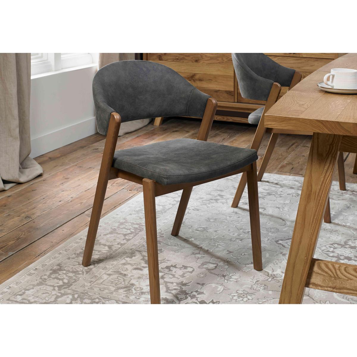 The beauty and craftsmanship of traditional oak furniture meets contemporary finishes and striking urban details in our Stratford range. Offering an extensive choice of pieces for stylish living rooms and dining rooms, the collection’s signature style motifs include planked table tops and surfaces, wire brushed and oiled finishes, H-frame bases and creative space-saving storage solutions. Extending dining tables have striking boat-shaped tops and dining sets include versatile seating options – dining benches and the range’s on-trend dining and dining arm chairs that are inspired by mid-century design. A fantastic choice for classic, modern country and industrial interiors. This stylish dining set includes a rustic-finished boat-shaped extending dining table and four mid-century inspired dining chairs. Why you'll love it Traditional oak furniture reimagined for fans of contemporary industrial design. Farmhouse-inspired dining table with extra leaf extends to seat 8. Curved boat-shaped top with an H-frame base. Planked table top is made with oak and oak veneer. Wire brushed for a rustic finish. Top is carefully oiled and then sealed so it’ll never need re-oiling. Dining set includes 4 stylish and versatile dining chairs. Chairs are comfortably curved with well-cushioned backs. Solid ash frames and legs. In a choice of fabric styles, including velvet, and colours. Compact dining space? There’s a smaller version of this dining set seating 6. This large dining set is part of our Stratford range. What you need to know Dining chairs have foam seat cushioning. Dining table seats 6 and extends to seat 8. Made with oak, oak veneer and solid ash. Every piece of wood has unique and natural marks, knots and colour variation. Avoid placing in direct sunlight or close to a heat source. We recommend using coasters and placemats at all times. Please note that the woodgrain of the extension leaf is perpendicular to the woodgrain of the table top. Shop our Stratford collection for well-crafted wood furniture for living and dining.