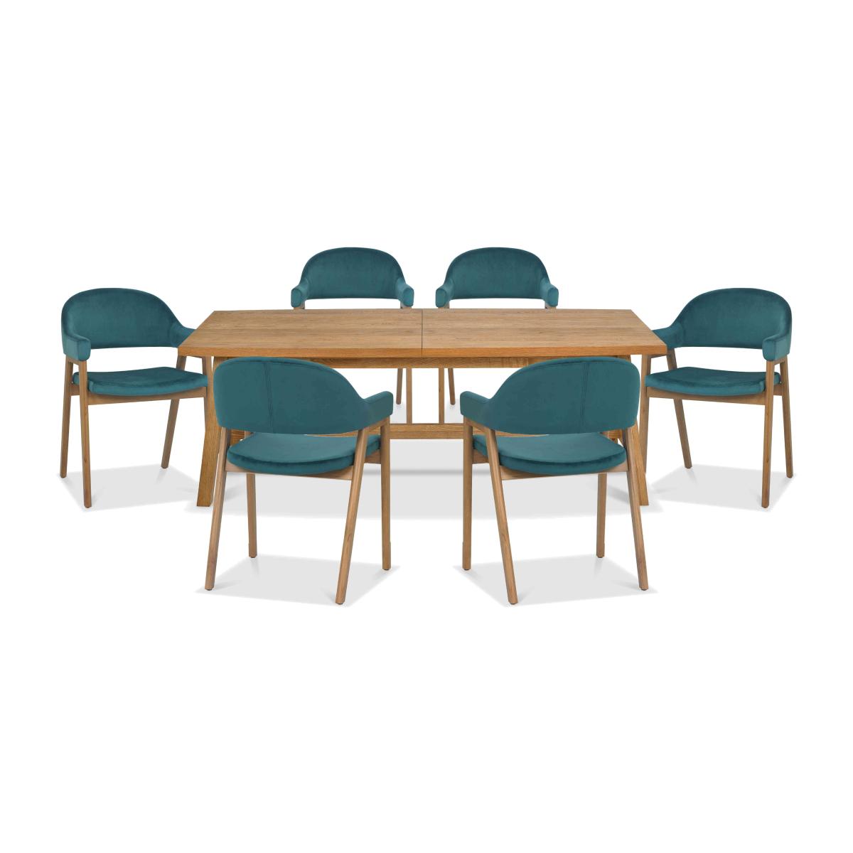 The beauty and craftsmanship of traditional oak furniture meets contemporary finishes and striking urban details in our Stratford range. Offering an extensive choice of pieces for stylish living rooms and dining rooms, the collection’s signature style motifs include planked table tops and surfaces, wire brushed and oiled finishes, H-frame bases and creative space-saving storage solutions. Extending dining tables have striking boat-shaped tops and dining sets include versatile seating options – dining benches and the range’s on-trend dining and dining arm chairs that are inspired by mid-century design. A fantastic choice for classic, modern country and industrial interiors. This dining set with a large extending table brings rustic style and charm to any dining room. The table has a striking boat-shaped top and the set includes six dining arm chairs. Why you'll love it Traditional oak furniture reimagined for fans of contemporary industrial design. Farmhouse-inspired dining table with extra leaf extends to seat 8. Curved boat-shaped top with an H-frame base. Planked table top is made with oak and oak veneer. Wire brushed for a rustic finish. Top is carefully oiled and then sealed so it’ll never need re-oiling. Dining set includes 6 stylish and versatile dining arm chairs. Chairs are comfortably curved with well-cushioned backs and arms. Solid ash frames and legs. In a choice of fabric styles, including velvet, and colours. Compact dining space? There’s a smaller version of this dining set seating 6. This large dining set is part of our Stratford range. What you need to know Dining chairs have foam seat cushioning. Dining table seats 6 and extends to seat 8. Made with oak, oak veneer and solid ash. Every piece of wood has unique and natural marks, knots and colour variation. Avoid placing in direct sunlight or close to a heat source. We recommend using coasters and placemats at all times. Please note that the woodgrain of the extension leaf is perpendicular to the woodgrain of the table top. Shop our Stratford collection for well-crafted wood furniture for living and dining.