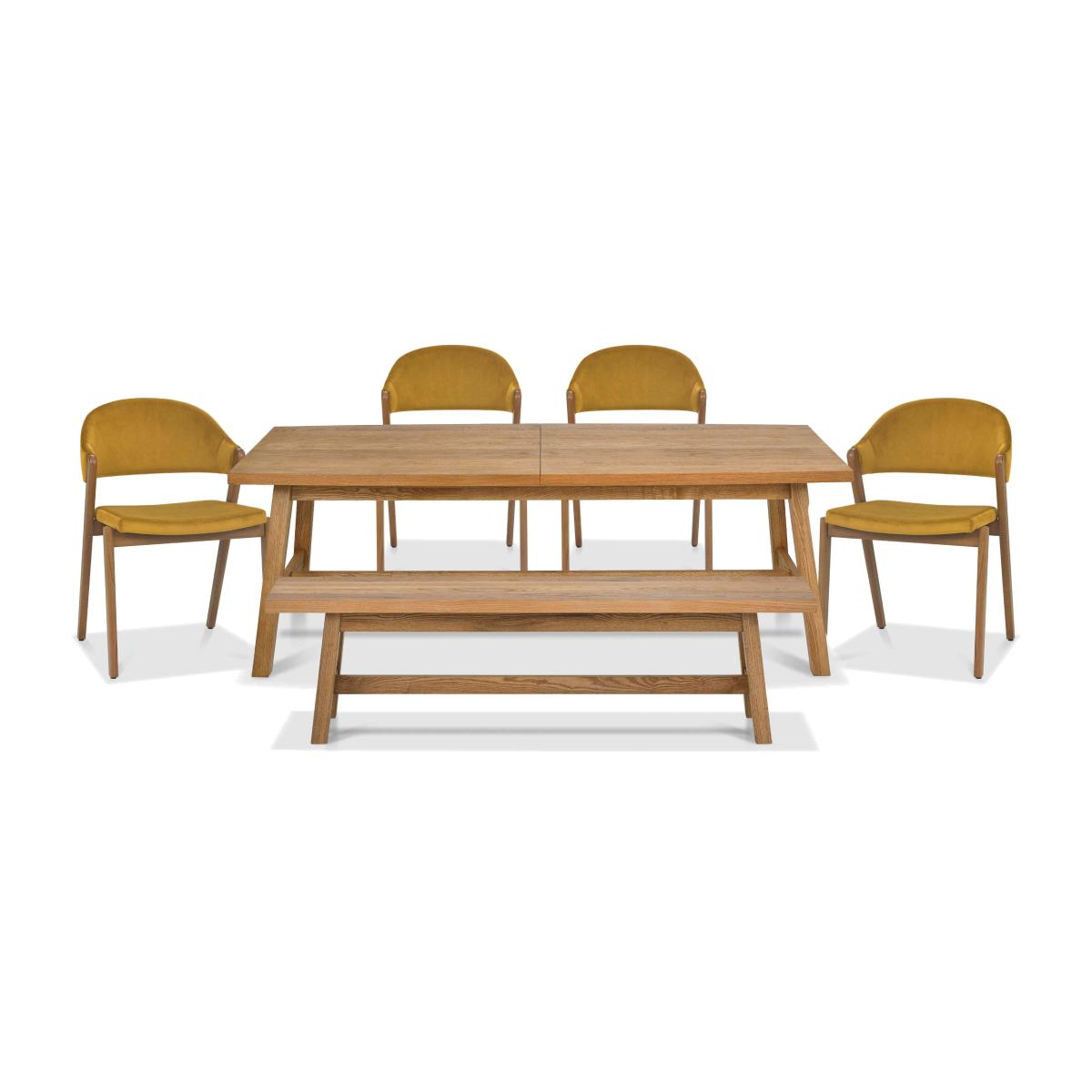 The beauty and craftsmanship of traditional oak furniture meets contemporary finishes and striking urban details in our Stratford range. Offering an extensive choice of pieces for stylish living rooms and dining rooms, the collection’s signature style motifs include planked table tops and surfaces, wire brushed and oiled finishes, H-frame bases and creative space-saving storage solutions. Extending dining tables have striking boat-shaped tops and dining sets include versatile seating options – dining benches and the range’s on-trend dining and dining arm chairs that are inspired by mid-century design. A fantastic choice for classic, modern country and industrial interiors. Gather family and friends around this stylish extending dining table with its rustic planked top. This dining set includes four dining chairs and a practical dining bench. Why you'll love it Traditional oak furniture reimagined for fans of contemporary industrial design. Farmhouse-inspired dining table with extra leaf extends to seat 8. Curved boat-shaped top with an H-frame base. Planked table top is made with oak and oak veneer. Wire brushed for a rustic finish. Top is carefully oiled and then sealed so it’ll never need re-oiling. Dining set includes a small dining bench and 4 dining chairs. Chairs are comfortably curved with well-cushioned backs. Solid ash frames and legs. In a choice of fabric styles, including velvet, and colours. Compact dining space? There’s a smaller version of this dining set seating 6. This large dining set is part of our Stratford range. What you need to know Dining chairs have foam seat cushioning. Small dining bench seats 3. Dining table seats 6 and extends to seat 8. Made with oak, oak veneer and solid ash. Every piece of wood has unique and natural marks, knots and colour variation. Avoid placing in direct sunlight or close to a heat source. We recommend using coasters and placemats at all times. Please note that the woodgrain of the extension leaf is perpendicular to the woodgrain of the table top. Shop our Stratford collection for well-crafted wood furniture for living and dining.