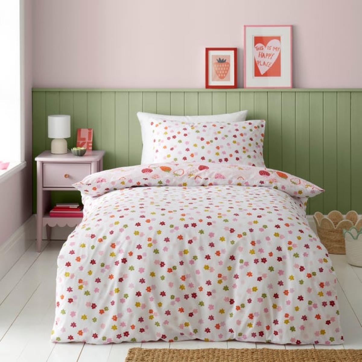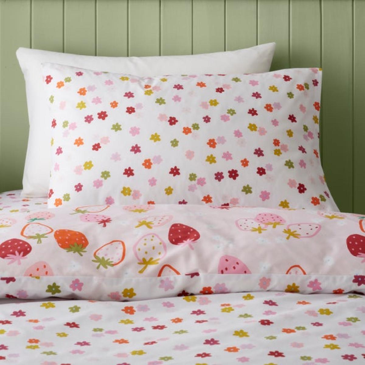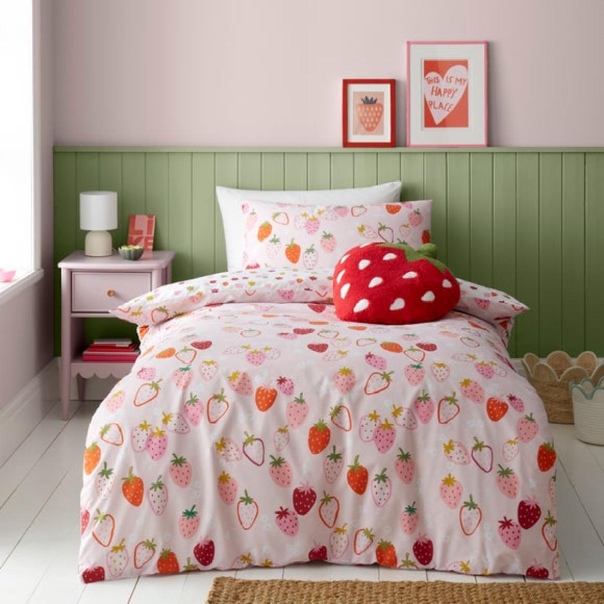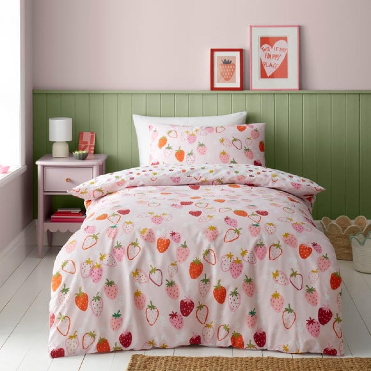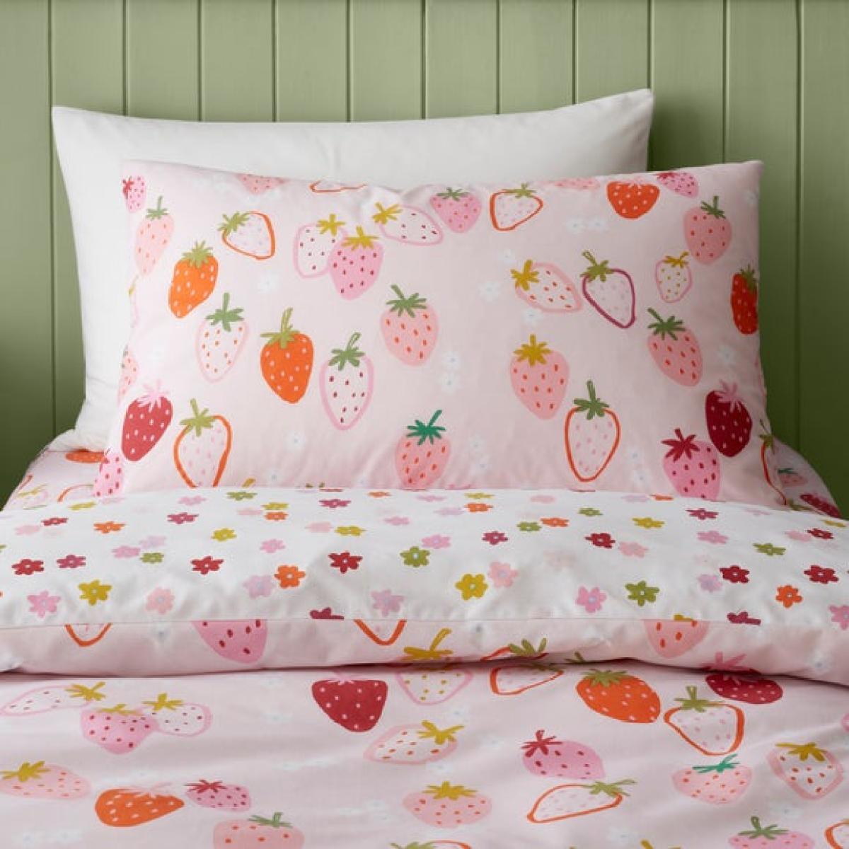 * Reversible design with two playful prints * Printed with a fun strawberry pattern * Soft and breathable for a comfy night’s sleep * Machine washable for everyday convenience Turn their bed into a berry-bright dream with this reversible duvet cover and pillowcase set. One side’s packed with juicy strawberries, the other’s dotted with a softer print for a quick switch-up. It’s made from breathable fabric that’s gentle on skin and built to handle everyday adventures. Pop it in the wash, dry it fast, and it’s ready for the next bedtime story.