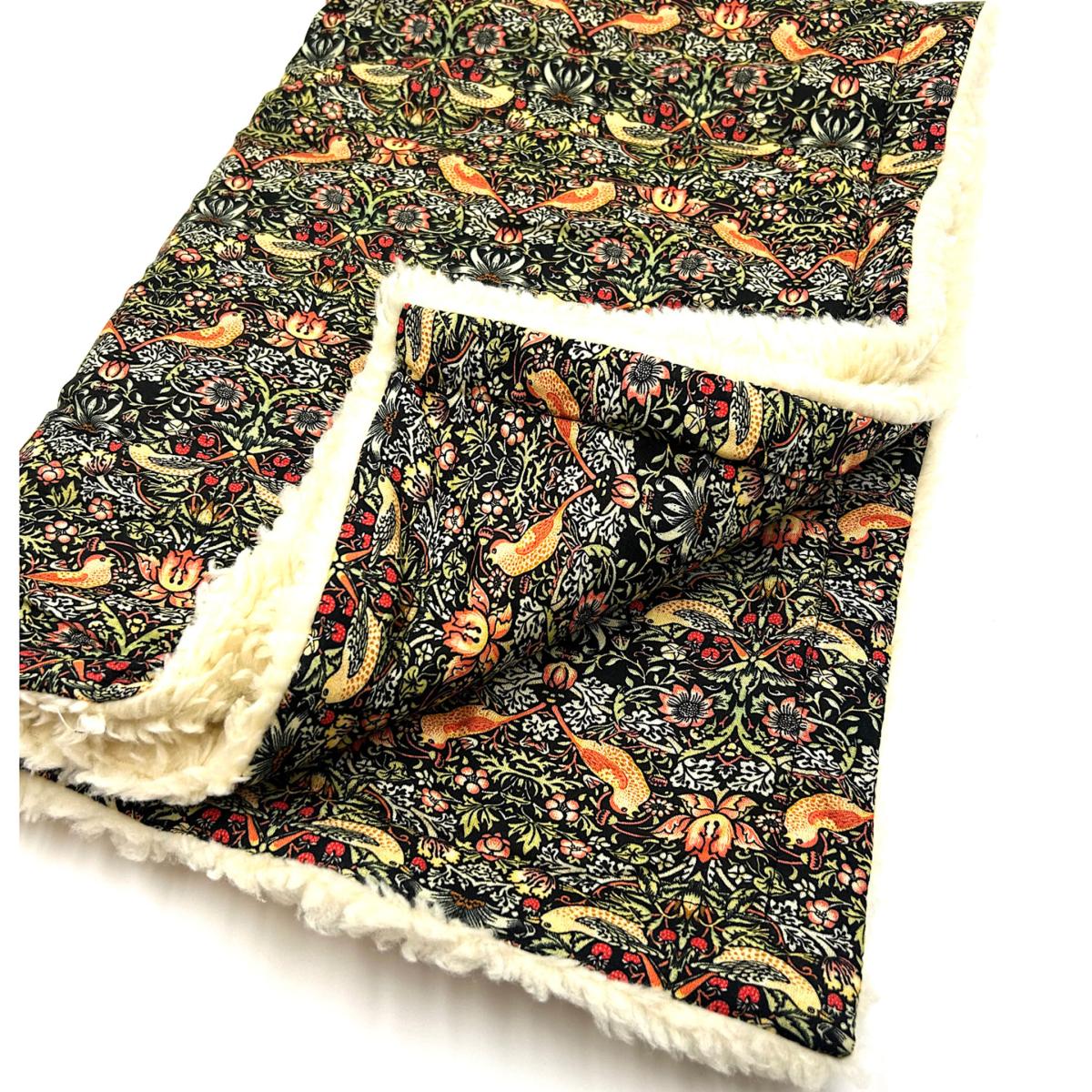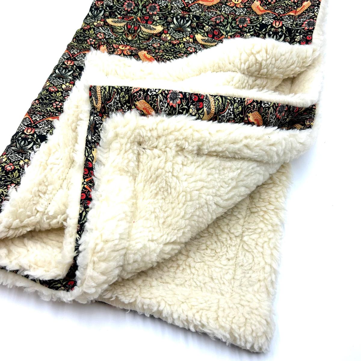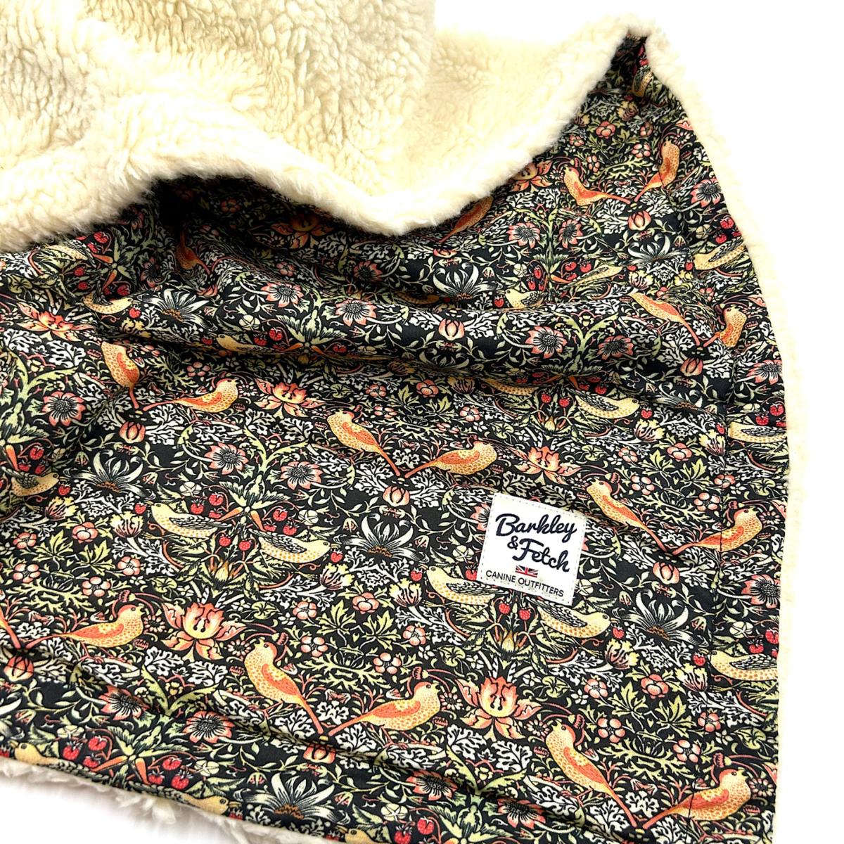 Made from licensed William Morris Strawberry Thief printed cotton fabric with a cream sherpa fleece on the other side for your dog to lie on in comfort. Great for using on the sofa at home, in your dog's bed or for travelling. Can be rolled up easily and taken on picnics too.