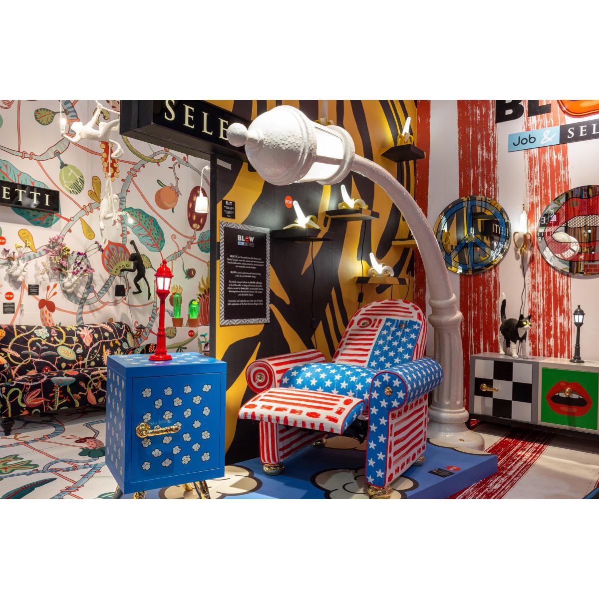 A crazy cartoon feel for this incredible Street Lamp. A true light sculpture, this masterfully proportioned lamp was designed by Studio Job (Job Smeets and Nynke Tynagel). The Flemish couple of artist-designers work between the industrial world and the world of applied arts, creating projects with an avant-garde language, strongly expressive and rich in symbols. With the Street Lamp, Studio Job revisits the archetypal traditional gas street lamps that were found in cities in the early twentieth century. It delivers up a breathtaking, ultra-colourful and completely offbeat version. The material, as if soft, seems to have been bent, subjected to strong wind! The designers were inspired by the curvature and XXL proportions of the iconic Arco lamp by Achille Castiglioni.