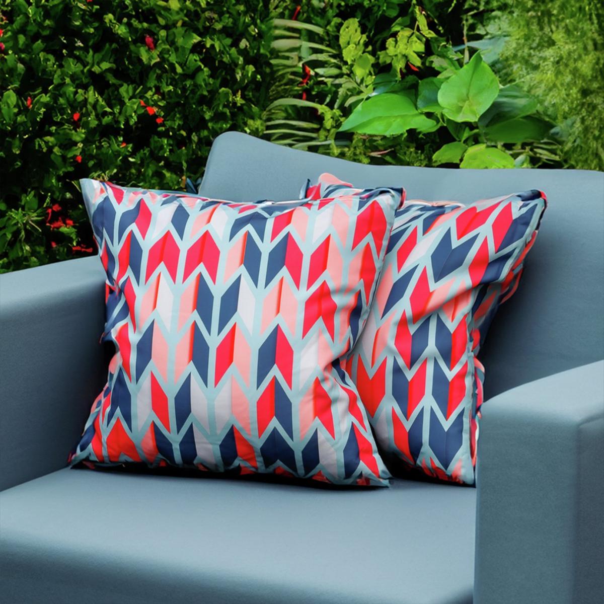 I love these arrow outdoor cushions for their bold, graphic print and versatility. They work well in contemporary and coastal-style settings, adding a pop of colour and pattern to patio furniture or outdoor lounges. To style them effectively, pair with neutral furniture to let the cushions be the focal point, or mix with other patterns for an eclectic look. Practical tips include using them in covered outdoor spaces to prolong their lifespan and combining with simple, solid-colour accessories to keep the setting looking fresh and cohesive. Their vibrant design makes them a great choice for injecting colour into your garden or balcony area without overwhelming the space.