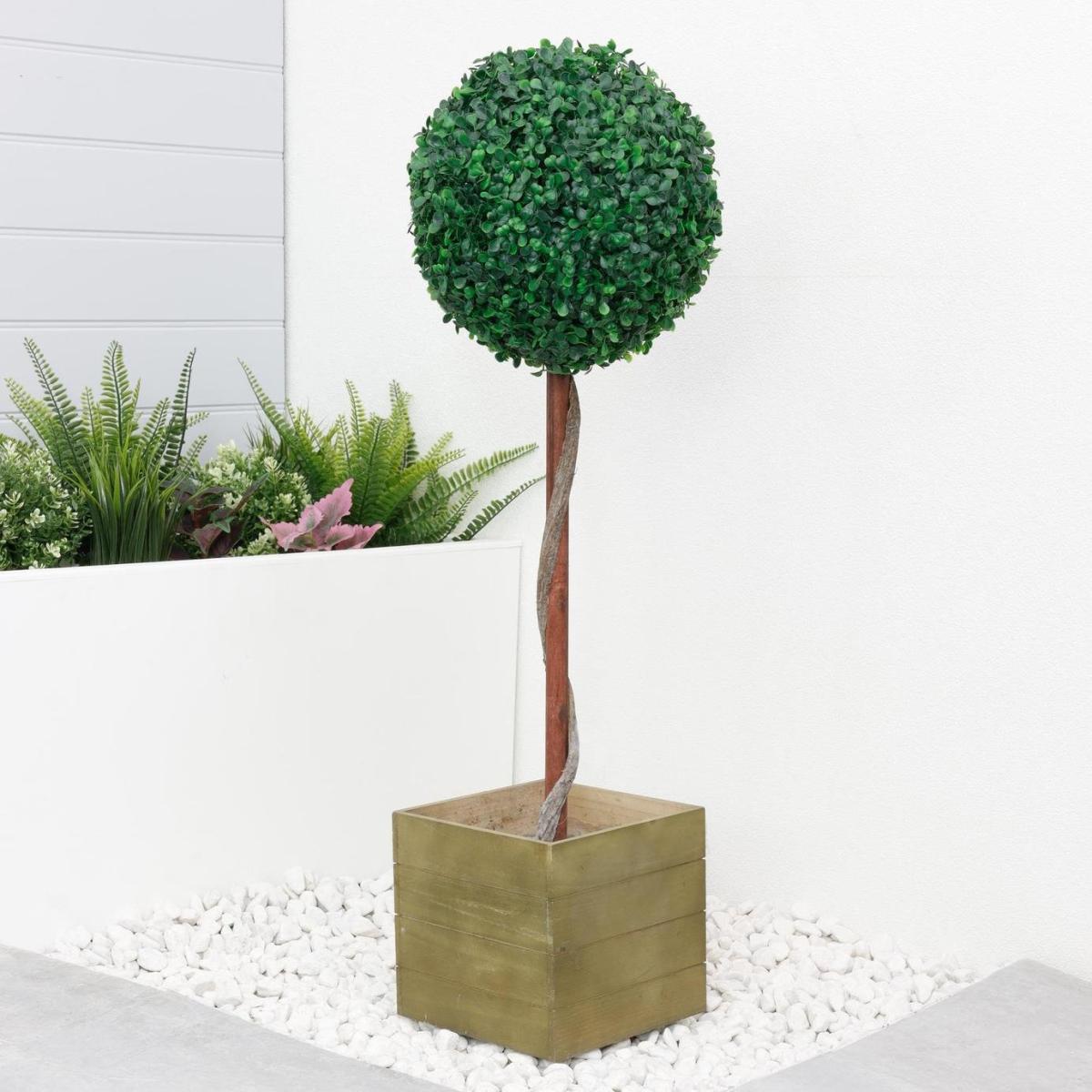 This solar single bay ball plant is a wonderful addition to any garden setting. While this is an artificial garden plant, it has been specifically designed and crafted to look like a well-maintained garden plant. It comes with 100 LED solar string lights for decorating the plant. These string lights are powered entirely by solar energy. Suitable for patios, decking areas, balconies and terraces. Suitable for outdoor use. Plant composition: polyethylene. Pot Composition: wood. Size H85, W26, D26cm. Pot size: H19, W20, D20cm.