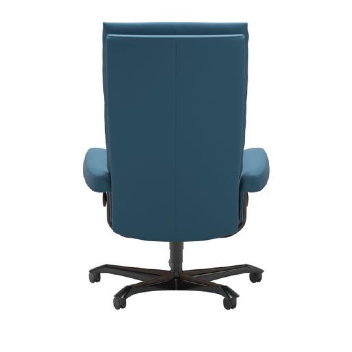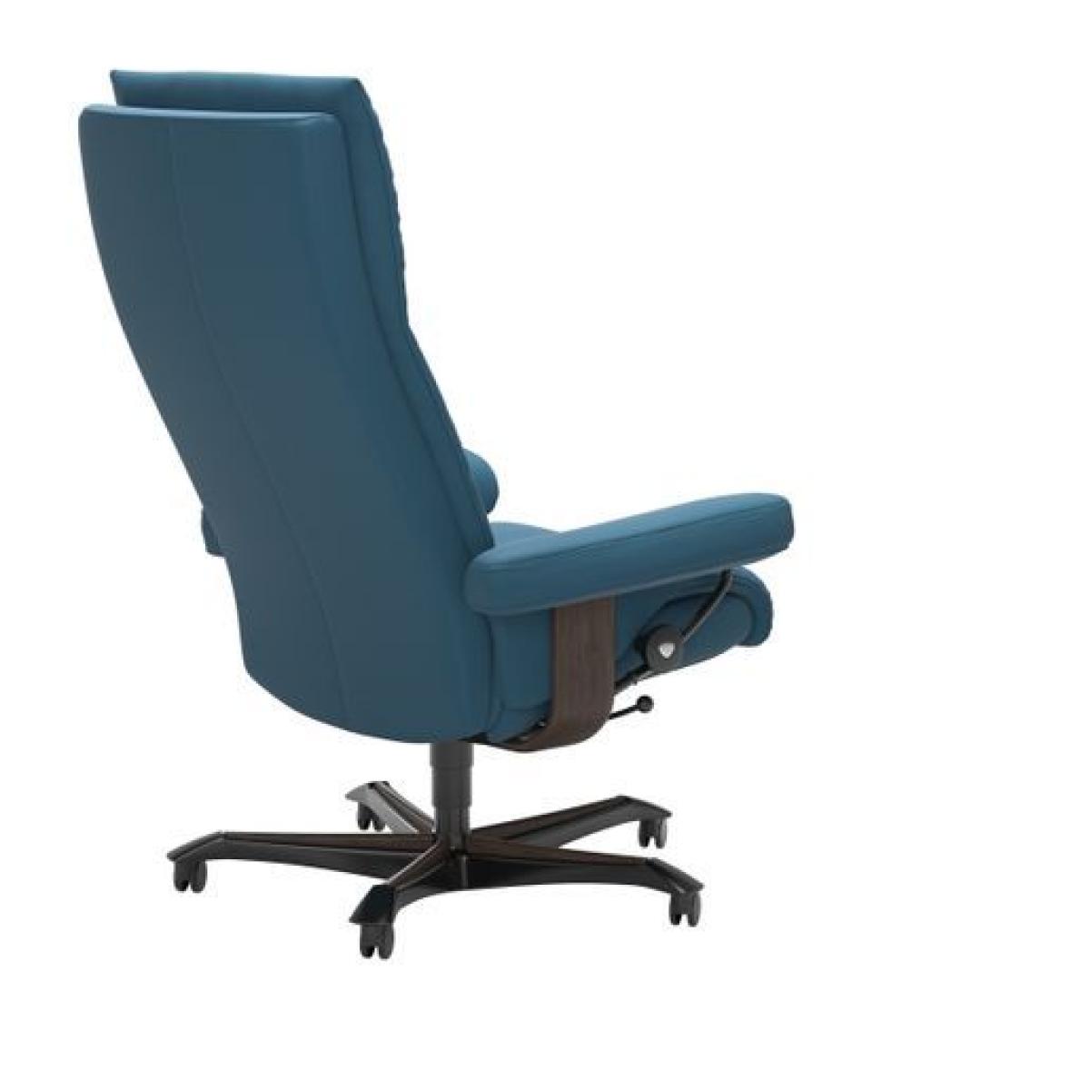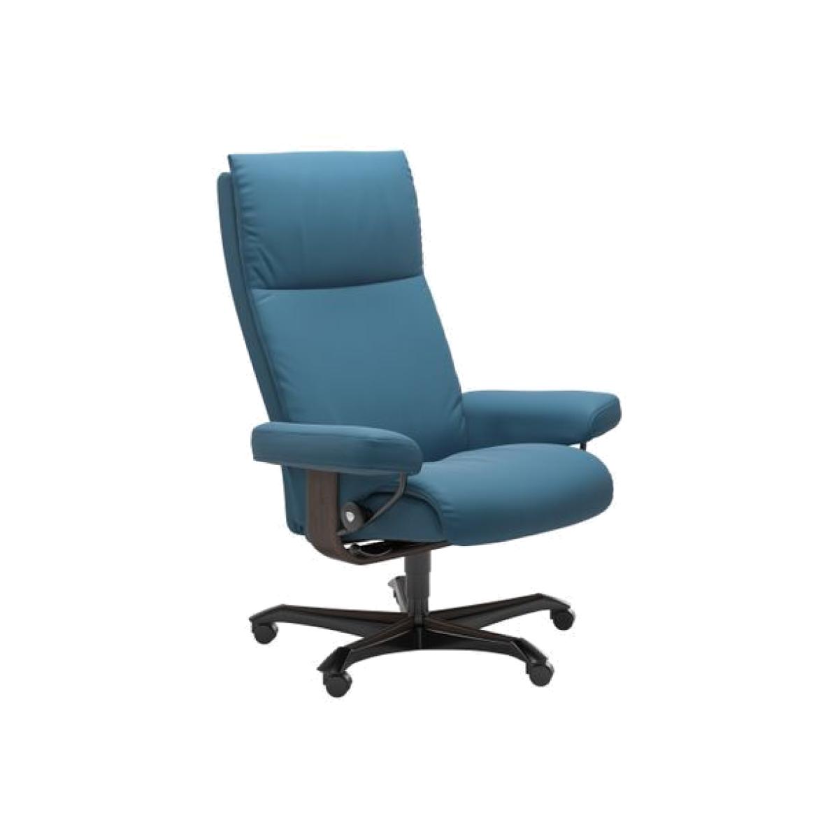 Tall comfort with slim and modern looks. From the moment you sit down the Stressless Aura has an enclosing effect on your body. The tight and elegant back combined with the enveloping back and seat cushion provides an exciting and eye catching look. All Stressless comfort features are of course in place and will deliver that great Stressless experience year after year. The office chair will change its character over time and gain patina, so will the cushions, giving it a distinct look. Glide System - Set the friction of the Stressless wheels once and adjust your sitting position simply by using your body weight. BalanceAdapt - Subtle rocking increases the comfort - it's all about finding the right balance. With BalanceAdapt the sitting angle automatically adjusts to your body's tiniest movement. Plus System - Lean back and notice how the chair follows your movements. The unique Plus system always gives you maximum comfort and support for your neck and lumbar region. 10-year guarantee on the internal mechanism. Large choice of leathers and fabrics. Assembly required. Dimensions: 77cm W x 78cm D x 118cm H. Max Height: 125cm. Colours shown are for guidance purposes only. Pictured here in Paloma Crystal Blue Leather with Wenge wood base.