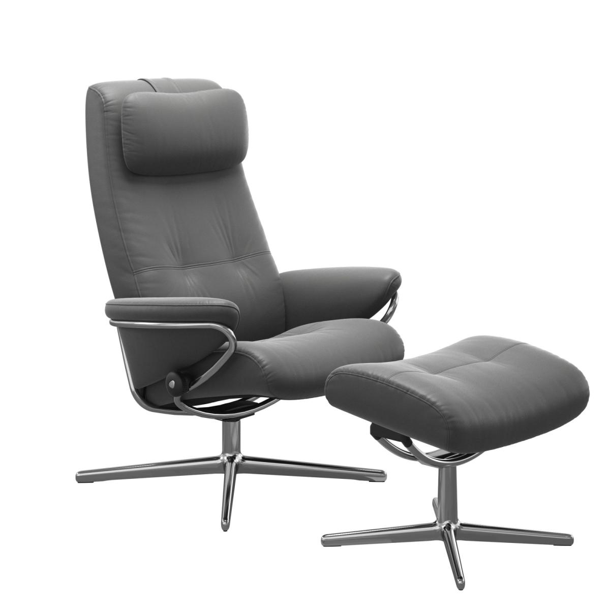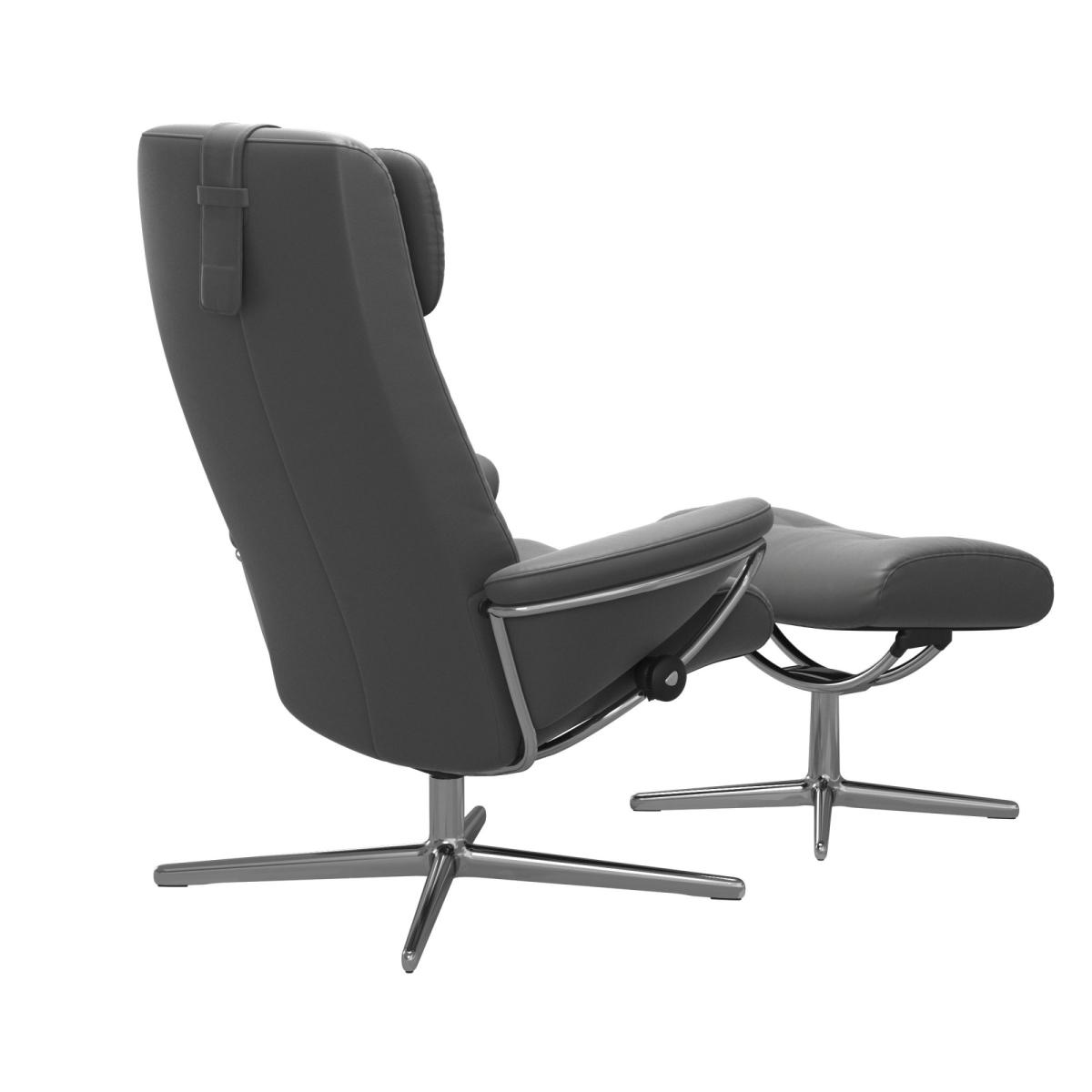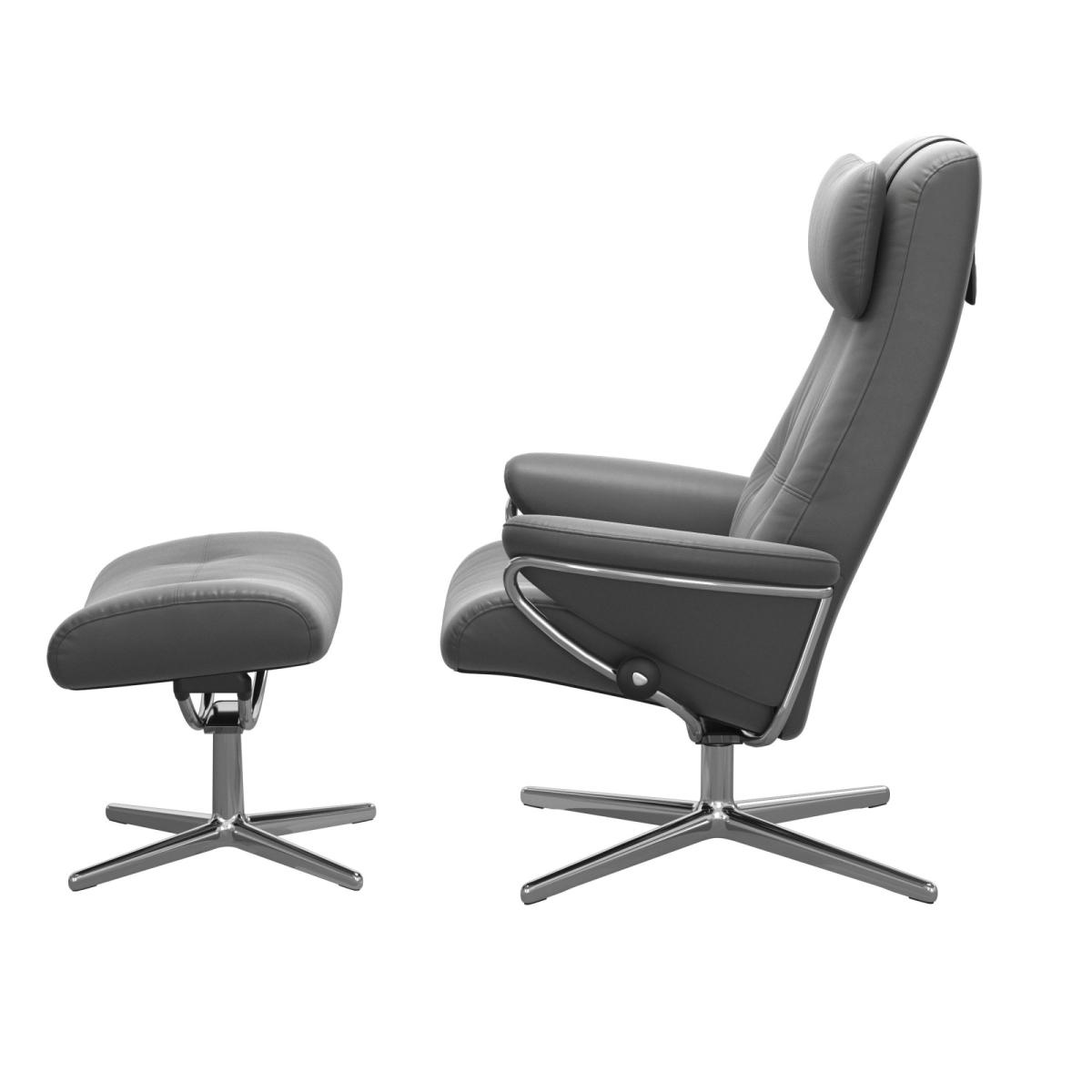 The Stressless® Berlin recliner has a retro vibe that has withstood the test of time for decades. While the sleek outline gives it a modern edge, on the inside you will find all the classic Stressless® comfort technology. This model comes with a high back and footstool so you can put your feet up and relax, and the cross base offers both support and style which is always a winning combination. Choose from different leather grades and colours to make this recliner and footstool truly your own!.