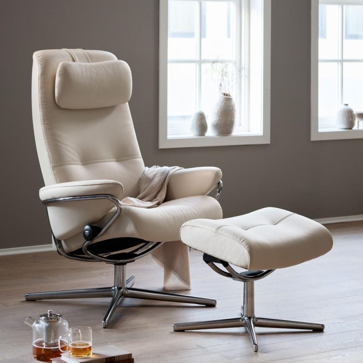 The Stressless® Berlin recliner has a retro vibe that has withstood the test of time for decades. While the sleek outline gives it a modern edge, on the inside you will find all the classic Stressless® comfort technology. This model comes with a height adjustable headrest and footstool so you can put your feet up and relax, and the cross base offers both support and style which is always a winning combination. Choose from different leather grades and colours to make this recliner and footstool truly your own!.