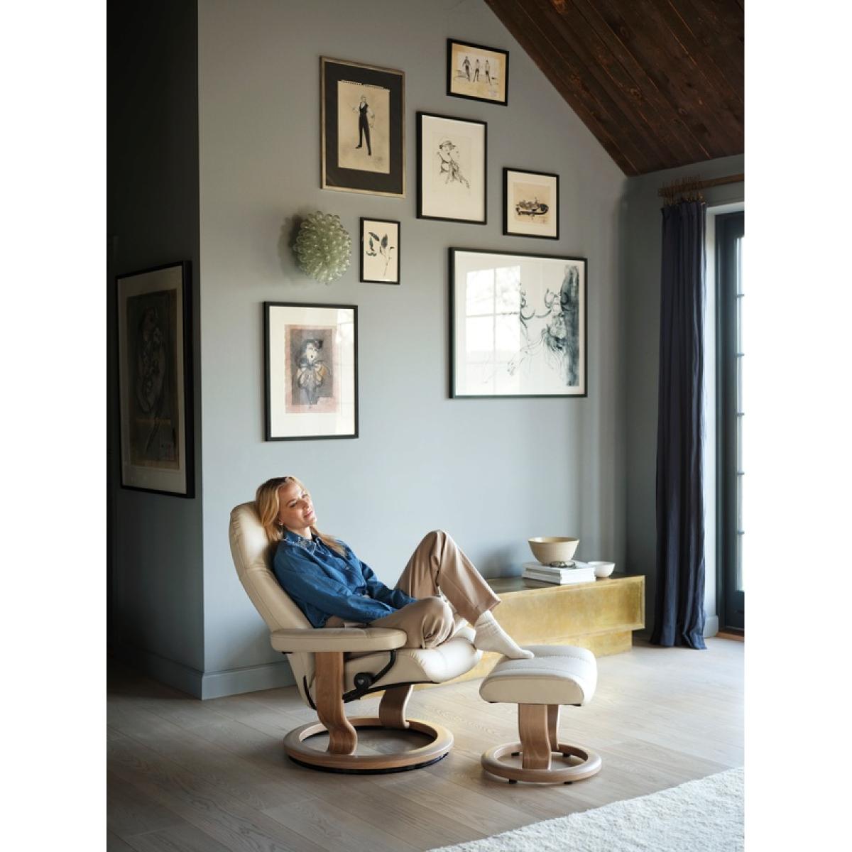 Please note that this product does NOT come with the footstool included.   The Stressless Consul Class Chair offers a streamlined and stylish appearance, with a visible seam detail to add that extra sophistication.  Swivel the base allows for a complete 360 rotation, allowing you to adjust your direction with ease. Stressless® Plus™ the revolutionary signature feature of the Stressless ranges, this design system means your eye line remains consistent as you recline, making it easier to still watch TV or read whilst fully sat back. Sleep Function The headrest can lay flat for a convenient position for those afternoon naps. Stressless® glide system automatically adjusts to your bodies weight, unlike other pesky recliners that you fight with to recline, the Stressless Consul won't retain its upright position until you want it to. Technical Specification Footstool not included Small w/Classic Base: h:94.0cm d:70.0cm w:70.0cm (Seat Height: 38.0cm) Medium w/Classic Base: h:100.0cm d:71.0cm w:76.0cm (Seat Height: 40.0cm) Large w/Classic Base: h:100.0cm d:77.0cm w:77.0cm (Seat Height: 42.0cm) 360 degree swivel action Available in a choice of leather and fabric colours 10 Year Guarantee on fabrication faults on internal mechanism Equipped with the patented Glide system