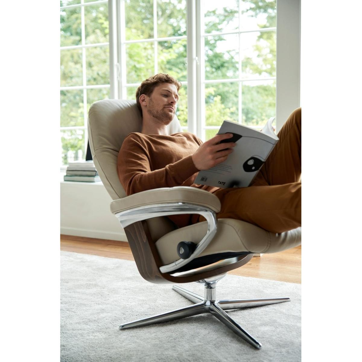 Please note that this product does NOT come with the footstool included. The Stressless Consul Cross Chair offers a streamlined and stylish appearance, with a visible seam detail to add that extra sophistication. Swivel the base allows for a complete 360 rotation, allowing you to adjust your direction with ease. Stressless® Plus™ the revolutionary signature feature of the Stressless ranges, this design system means your eye line remains consistent as you recline, making it easier to still watch TV or read whilst fully sat back. Sleep Function The headrest can lay flat for a convenient position for those afternoon naps. Stressless® glide system automatically adjusts to your bodies weight, unlike other pesky recliners that you fight with to recline, the Stressless Consul won't retain its upright position until you want it to. Technical Specification Footstool not included Small w/Cross Base: h:97.0cm d:70.0cm w:78.0cm (Seat Height: 41.0cm) Medium w/Cross Base: h:102.0cm d:72.0cm w:82.0cm (Seat Height: 42.0cm) Large w/Cross Base: h:102.0cm d:79.0cm w:91.0cm (Seat Height: 44.0cm) 360 degree swivel action Available in a choice of leather and fabric colours 10 Year Guarantee on fabrication faults on internal mechanism Equipped with the patented Glide system Footstool not included