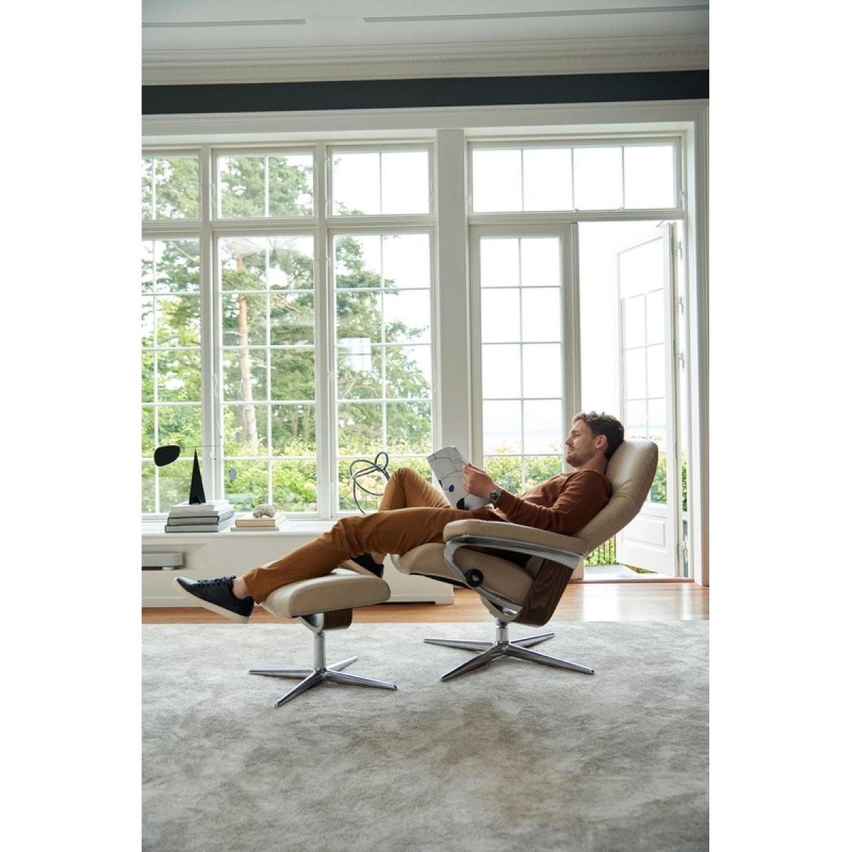 Please note that this product does NOT come with the footstool included. The Stressless Consul Cross Chair offers a streamlined and stylish appearance, with a visible seam detail to add that extra sophistication. Swivel the base allows for a complete 360 rotation, allowing you to adjust your direction with ease. Stressless® Plus™ the revolutionary signature feature of the Stressless ranges, this design system means your eye line remains consistent as you recline, making it easier to still watch TV or read whilst fully sat back. Sleep Function The headrest can lay flat for a convenient position for those afternoon naps. Stressless® glide system automatically adjusts to your bodies weight, unlike other pesky recliners that you fight with to recline, the Stressless Consul won't retain its upright position until you want it to. Technical Specification Footstool not included Small w/Cross Base: h:97.0cm d:70.0cm w:78.0cm (Seat Height: 41.0cm) Medium w/Cross Base: h:102.0cm d:72.0cm w:82.0cm (Seat Height: 42.0cm) Large w/Cross Base: h:102.0cm d:79.0cm w:91.0cm (Seat Height: 44.0cm) 360 degree swivel action Available in a choice of leather and fabric colours 10 Year Guarantee on fabrication faults on internal mechanism Equipped with the patented Glide system Footstool not included