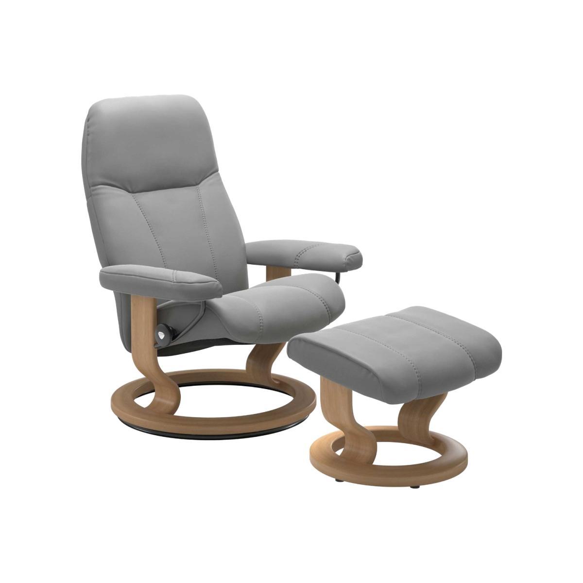 Design. Always feel at home and deservingly relaxed on the Stressless Consul Medium Classic Chair and Stool,. Batick. Wild Dove. This recliner chair effortlessly holds every inch of your body, featuring a matching stool which takes the level of comfort even higher, perfect to kick up your feet after a stressful day. The luxurious leather upholstery is filled with soft polyester. Fibre. And held up with an enduringly designed, sturdy steel and wood base. Feel the warm welcome as soon as you walk through the door with the Stressless Consul Medium Classic Chair and Stool,. Batick. Wild Dove.